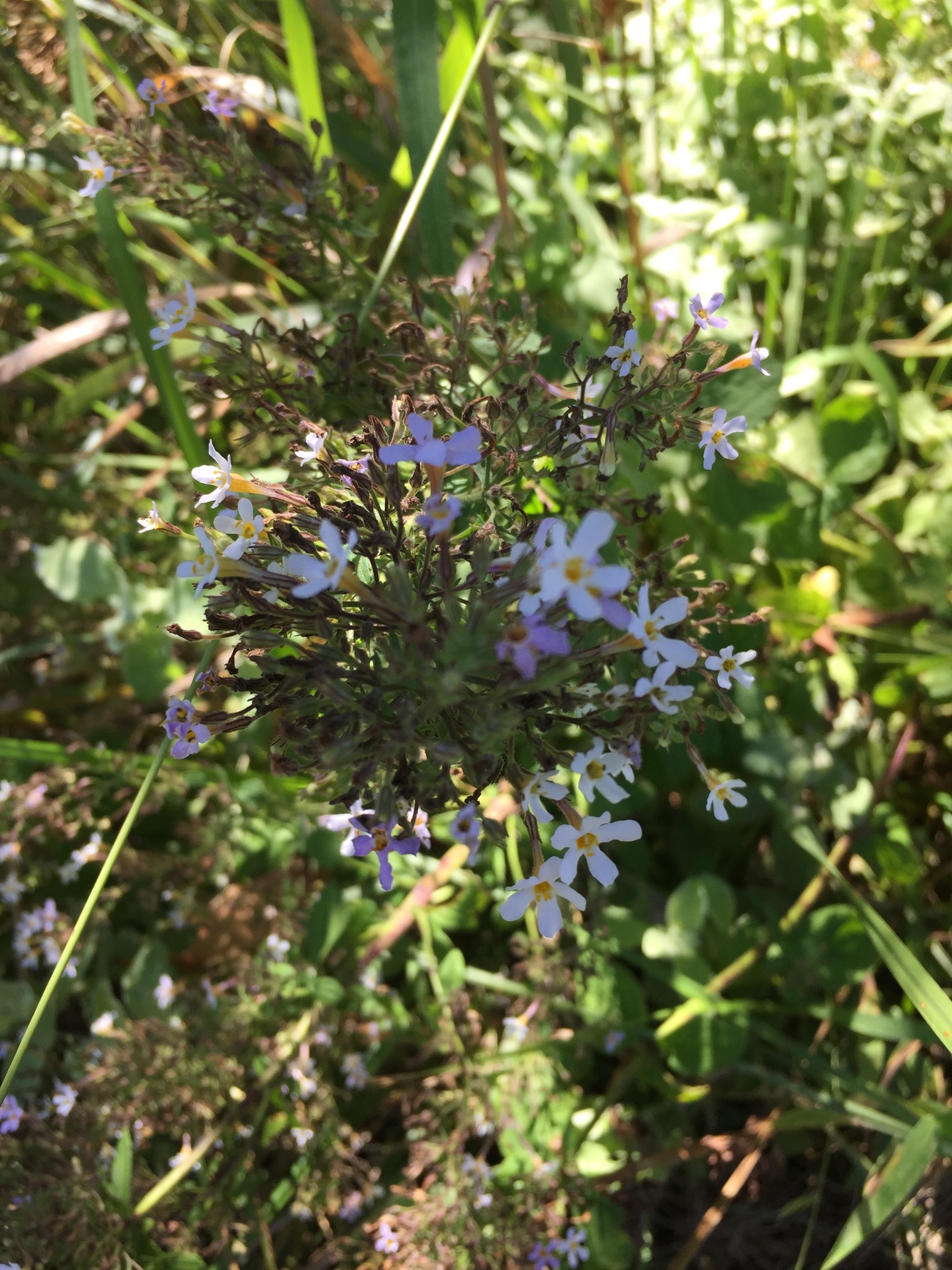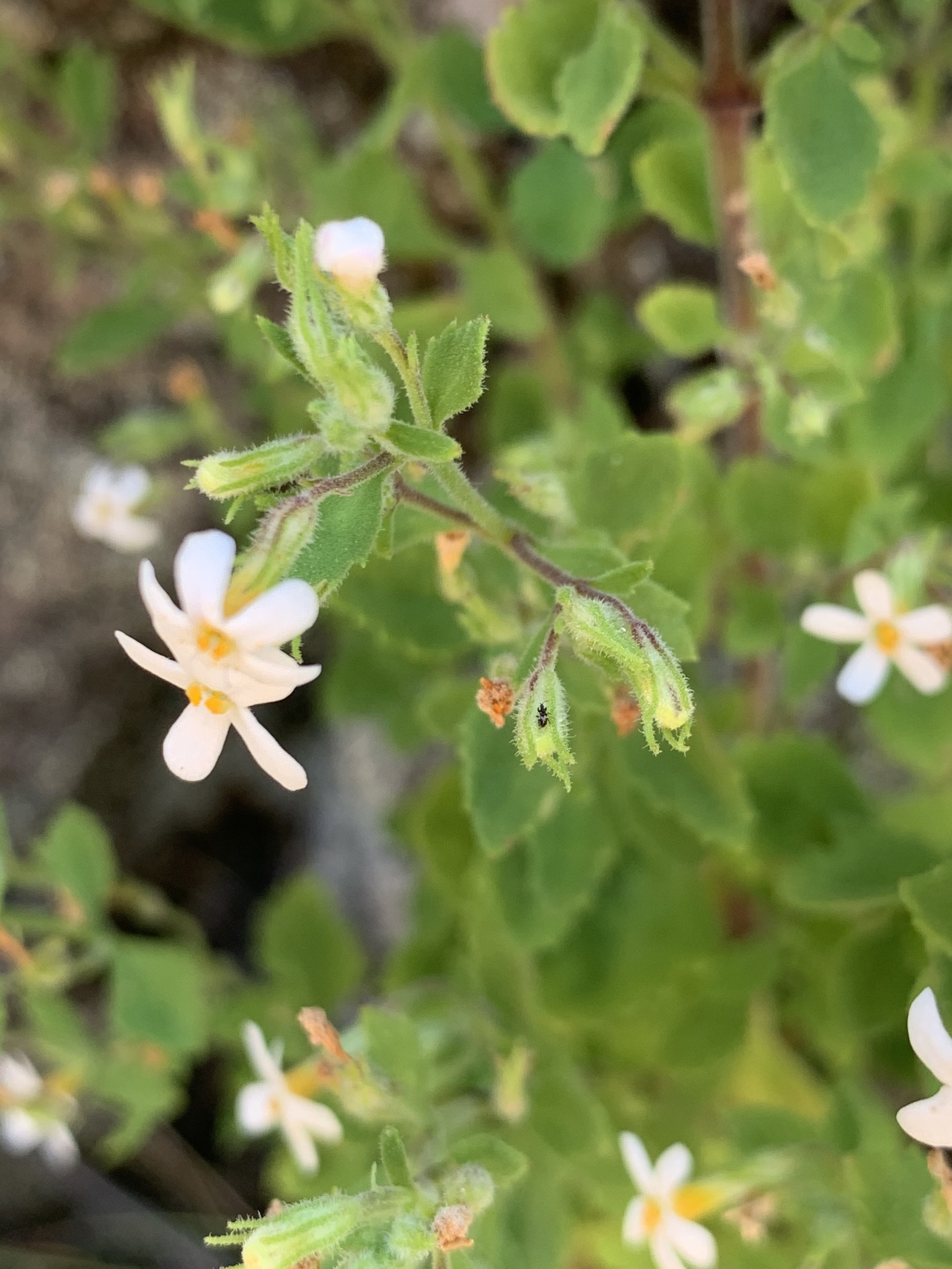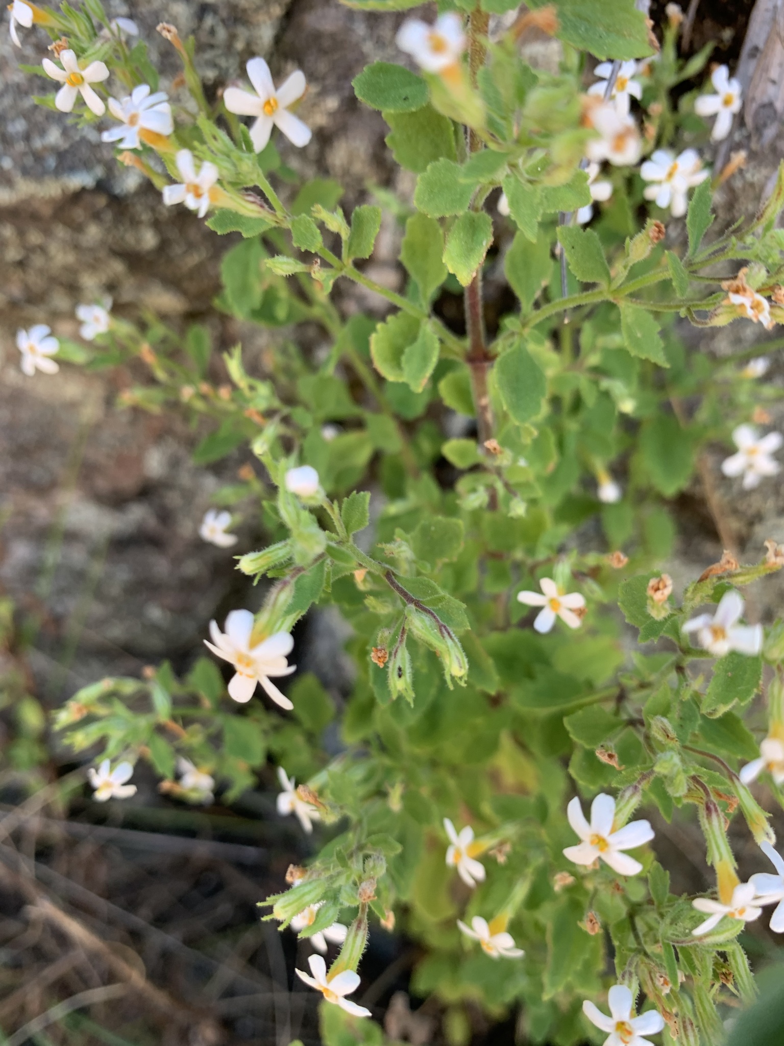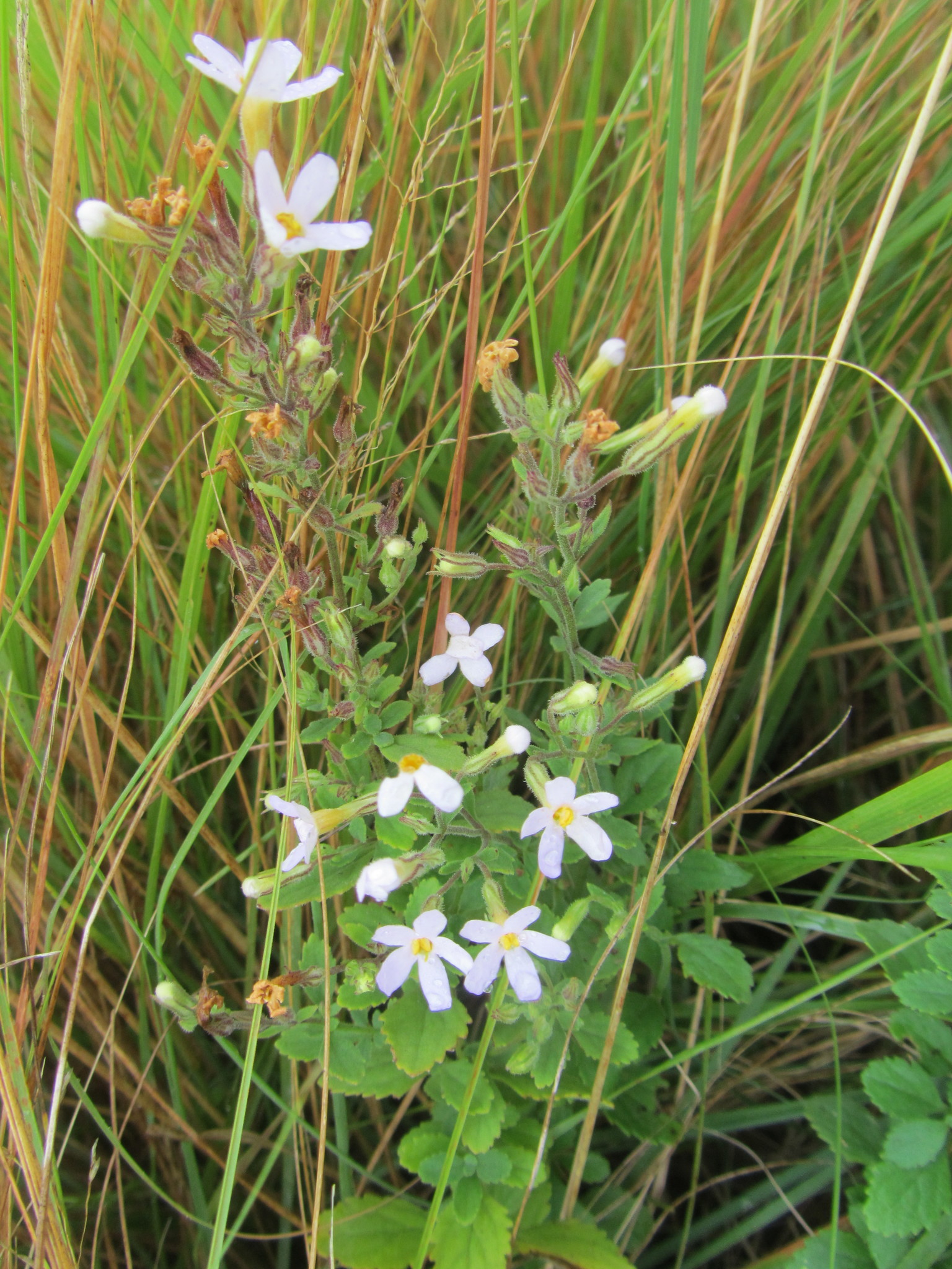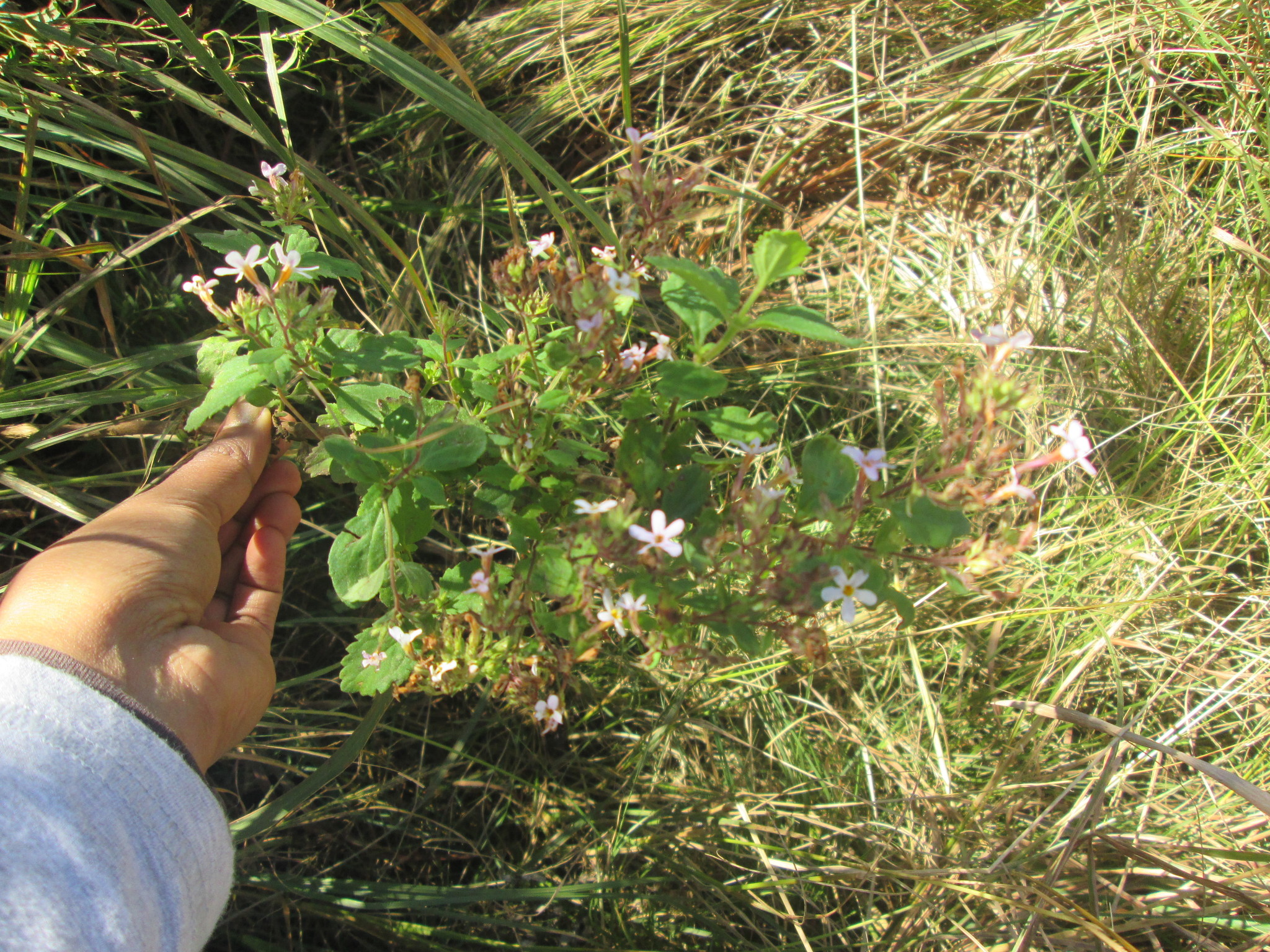 Perennial herb up to 1 m tall, main stems up to 3-4 mm in diam., sometimes simple below, usually branched or several-stemmed from the base, branching above, erect, decumbent or straggling, and then sometimes rooting at the nodes, pubescent, hairs up to 0.3-1 mm long, either all gland-tipped or mixed with eglandular hairs, leafy. Leaves opposite (bracts occasionally alternate on ultimate twiglets), largest blades 10-40 x 10-30 mm, ovate or occasionally elliptic abruptly contracted into a petiolar part c. 4-9 mm long (proportion of blade to petiole c. 3-9:1), apex acute to obtuse, margins with c. 5-16 pairs of teeth, both surfaces glandular pubescent as stems, glistening glands as well. Flowers ultimately innumerable, arranged in large panicles, occasionally the lowermost flowers solitary in the axil of a leaf, mostly in 3-flowered cymules, or mixtures of racemes and cymes, the main branches of the panicle always opposite, the flowers on the ultimate twiglets sometimes alternate and subtended by small bracts rather than leaves. Pedicels (longest) c. 4-10 mm. Calyx obscurely bilabiate, tube 0.7-2.5 mm long, posticous lobes 1.5-3.5 x 0.4-1 mm, anticous lobes slightly broader, glandular-puberulous together with longer hairs up to 0.3-0.8 mm long. Corolla tube 6-11 x 2.2-3.8 mm in throat, funnel-shaped, limb nearly regular, 8-12 mm across, posticous lobes 2.8-5 x 1.7-3.2 mm, anticous lobe 2.5-5 x 1.5-3 mm, all elliptic, white or creamy-white to shades of mauve, tube yellow, glandular-puberulous outside, hairs up to 0.15-0.3 mm long, glistening glands as well, inside either bearded with clavate hairs or subglabrous to glabrous. Stamens 4, anticous pair exserted, filaments 2.2-3.5 mm long, posticous pair included, filaments 1-2 mm long, anthers 0.8-1.2 mm long. Stigma 0.5-2 mm long, exserted. Style 5-9 mm long. Ovary 1.2-1.8 x 0.6-lmm, glistening glands either confined to sutures or sometimes a few on top of ovary and on base of style. Capsules 2.6-5 x 1.5-3 mm. Seeds 0.5-1 x 0.25-0.5 mm, pallid. Flowering mainly between January and May, though there are records from all months. From: Hilliard, OM. 1994. The Manuleae: a tribe of Scrophulariaceae. Edinburgh University Press, Edinburgh. [All rights reserved] As: Sutera floribunda (Benth.) Kuntze