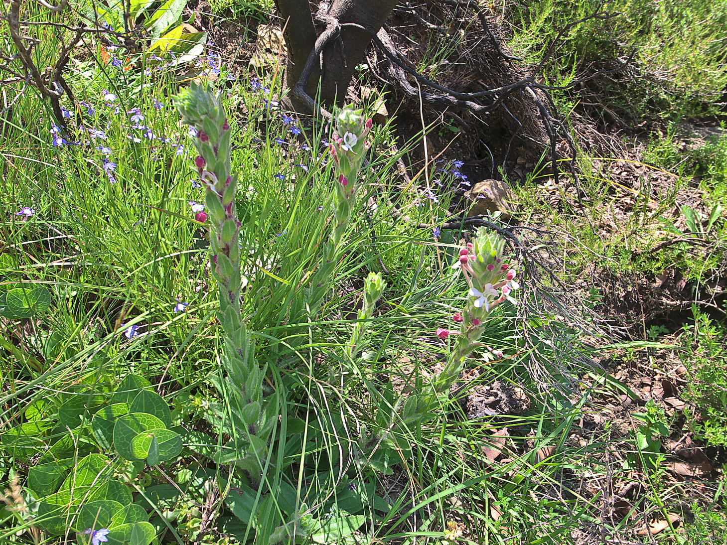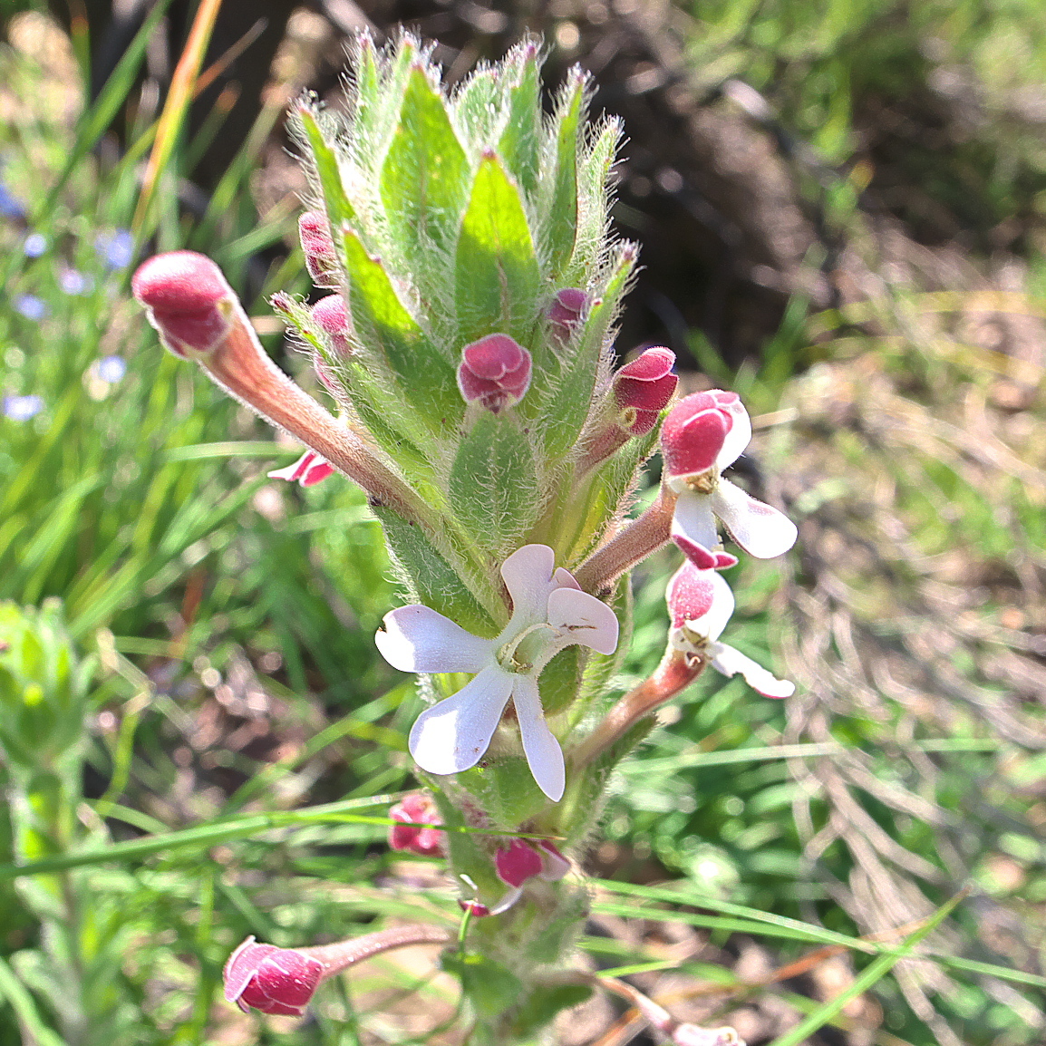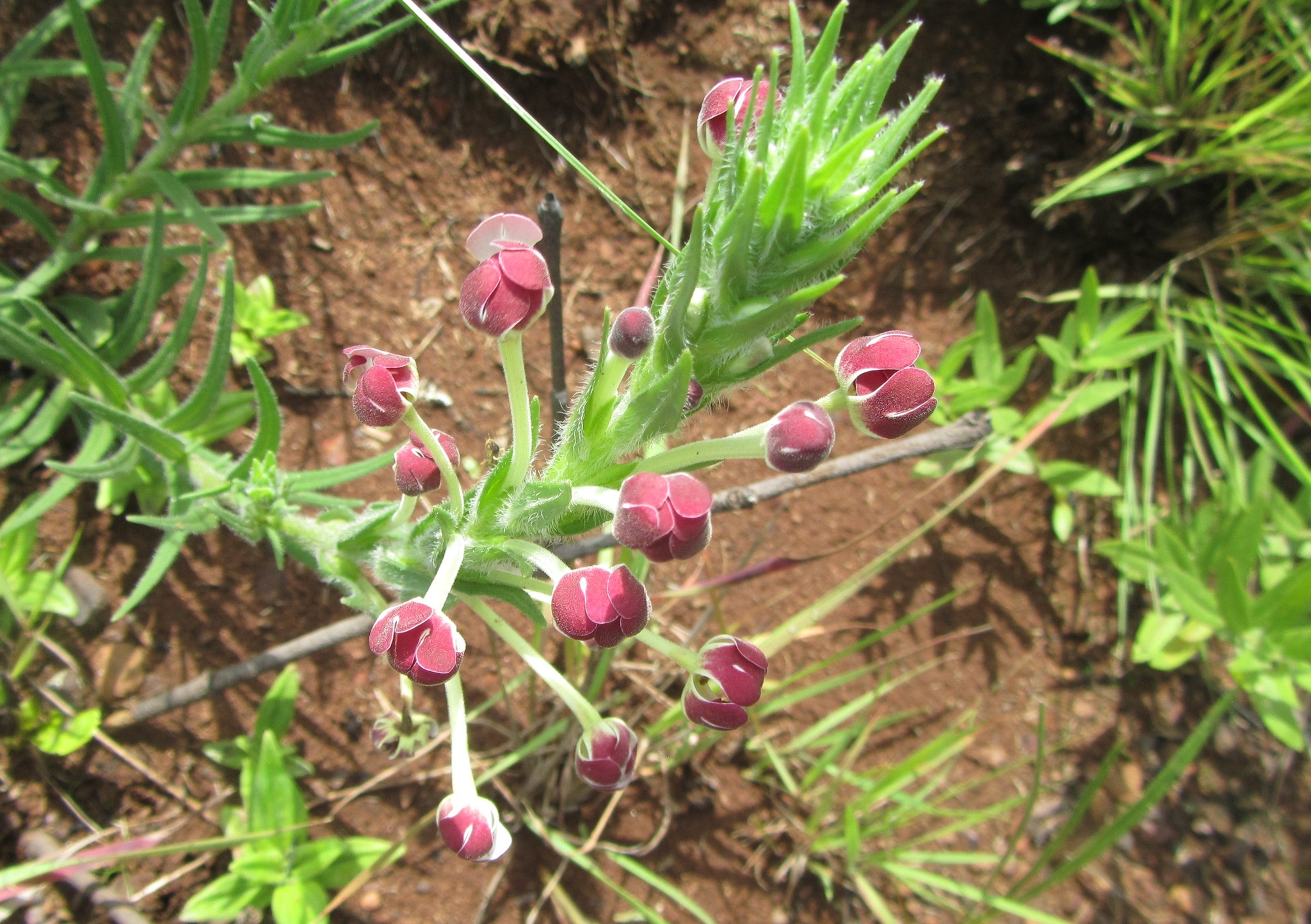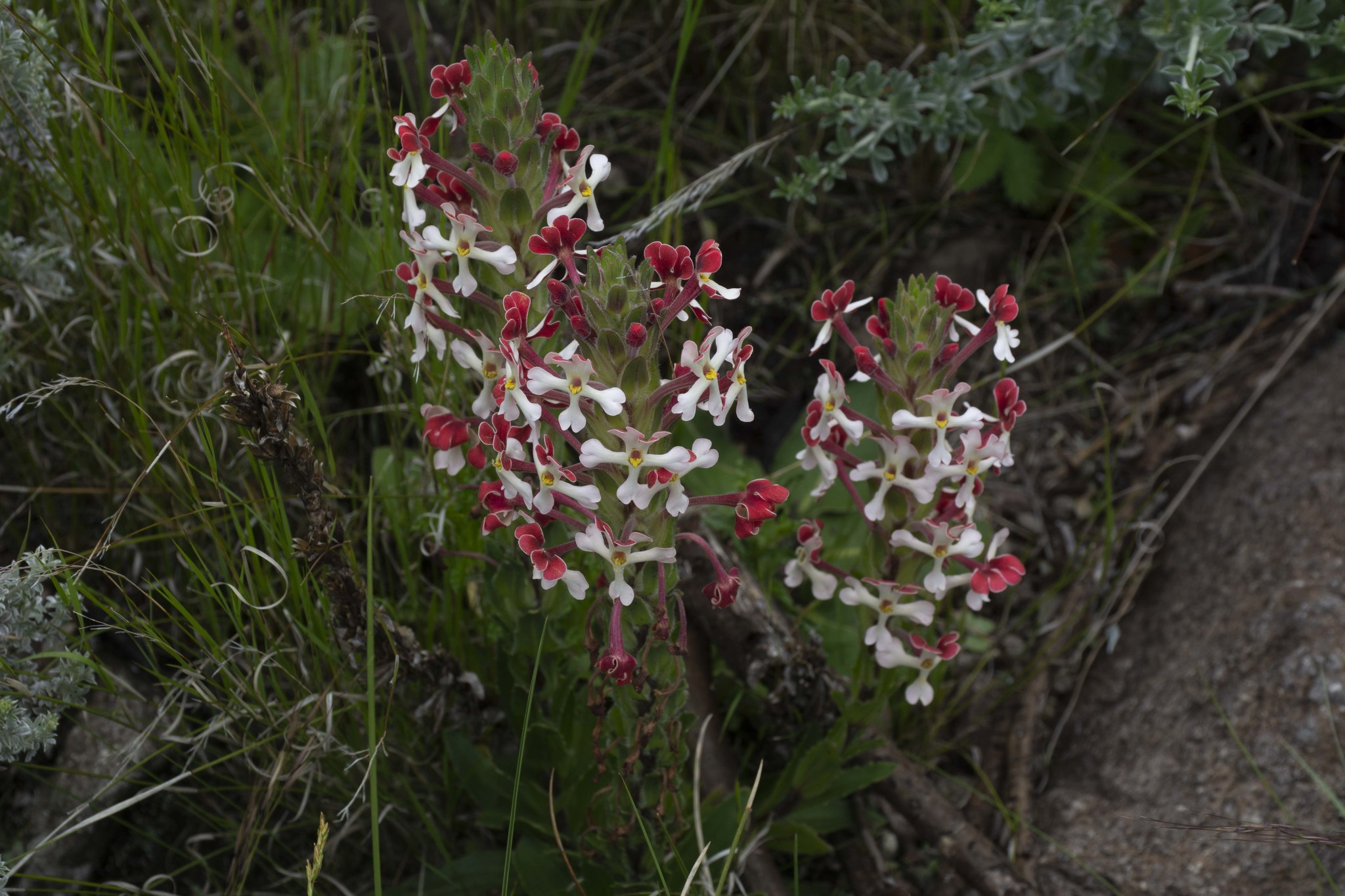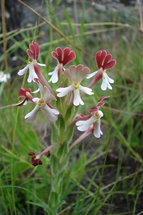 Perennial herb, up to 0.4 m high. Stems 1-few, erect, with thick clump of vegetative buds on crown. Leaves: radical ones rosulate, blade oblanceolate to elliptic, 35-90 x 8-20 mm; cauline ones ascending, blade oblong or elliptic, grading into bracts; hairy. Flowers: many in a terminal, crowded spike, sometimes with small ones on rachis below; corolla with tube up to 52 mm long, limb zygomorphic, held vertically, a few hairs present on anticous side of mouth, lobes sometimes twice notched, upper surface of corolla lobes glandular at least in lower part, outer surface wine-red, white inside, pink or red outside, greenish or cream-coloured inside; Dec.-Mar., opening in bright light. From: Bester, SP; Retief, E; Meyer, NL. 2017. Scrophulariaceae. In: E Retief & NL Meyer (eds), Plants of the Free State: Inventory and identification guide. Strelitzia 38: 755-793. South African National Biodiversity Institute, Pretoria. [CC BY]