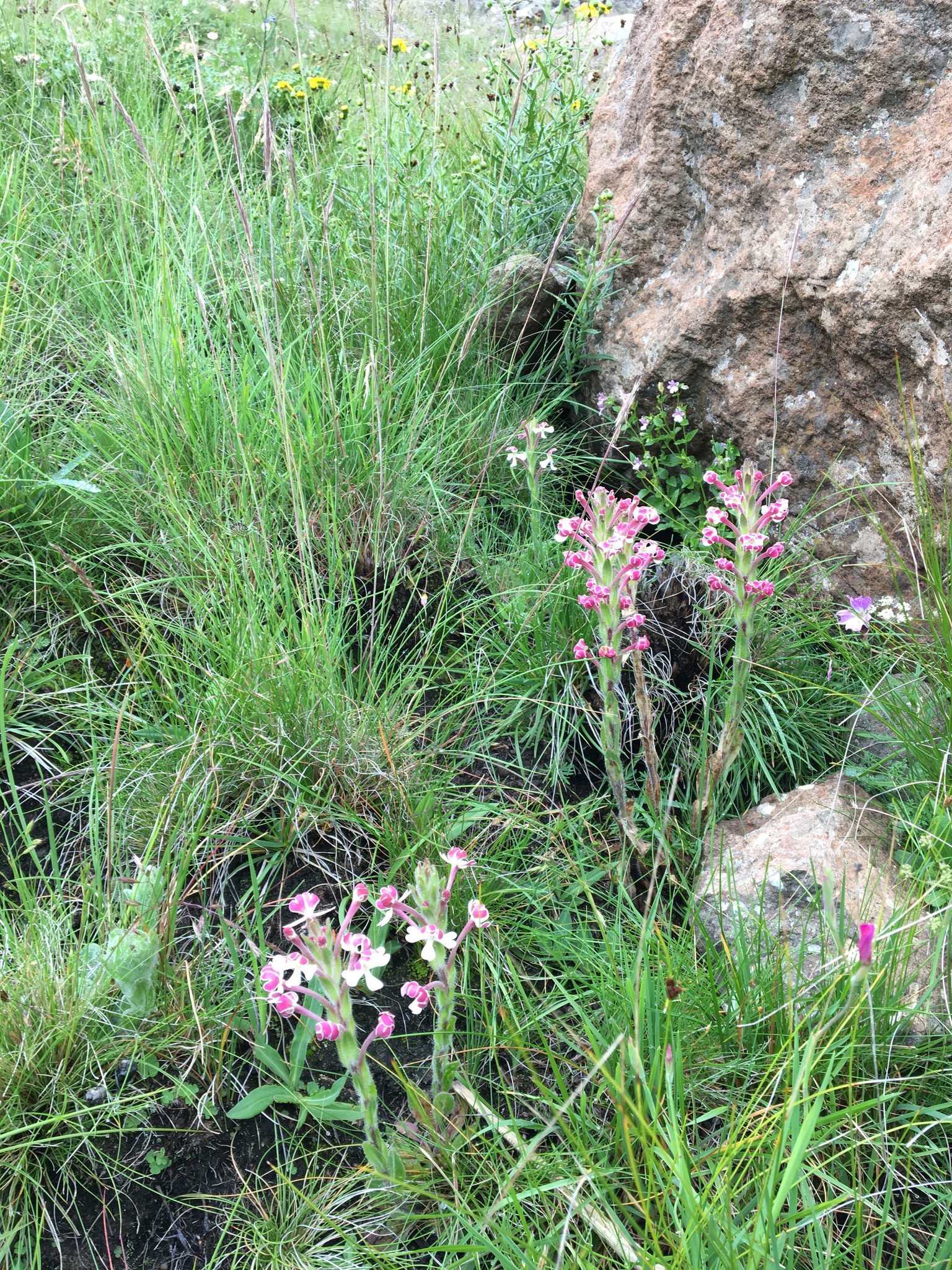 Perennial herb with a thick clump of partly subterranean vegetative buds at the crown; stems often solitary, sometimes 2 or 3, usually simple, sometimes producing 1-3 secondary spikes below the main spike, erect, up to c. 400 mm long, pilose with retrorse white hairs, leafy. Leaves: radical often more or less rosulate at flowering, oblanceolate or elliptic, mostly 35-90 x 8-20 mm; cauline ascending, elliptic or oblong, mostly 20-65 x 4-9(-20) mm, becoming slightly smaller upwards and passing imperceptibly into floral bracts; all leaves with margins entire, obscurely toothed, or callose-toothed particularly in upper part, hairy at least on margins and midline. Flowers many in a dense terminal spike, opening in sunshine, spike often very long, accounting for about half the total stem length, shorter in weak specimens. Bracts adnate to calyx for 1.5-3 mm, mostly 15-30 mm long, elliptic or lanceolate, margins entire or with 1 or 2 pairs of callose teeth near the tip, hairy at least on margins and midline. Calyx 8-14 mm long, lips 34 mm, hairy at least on margins. Corolla tube (16-)20-40(-52) mm long, glandular-puberulous, hairs up to 0.1-0.2 mm long, limb held vertically, zygomorphic, mouth often glabrous, sometimes with a few large unicellular hairs, rarely thinly bearded on the anticous side; lobes deeply notched, the secondary lobes themselves sometimes notched, pink, scarlet or crimson and glandular-puberulous outside, creamy- or greenish-white inside, glandular-puberulous at least on claw of lobes. Stamens 4, all visible in the mouth, anticous anthers 1-1.3 mm long, usually shortly exserted, the two posticous ones 2-2.5 mm, often partly included, sometimes far exserted. Stigma 4-5 mm long, exserted. Capsule 12-15 x 4 mm. Seeds c. 1-1.5 x 0.7-1.5 mm, angled, colliculate, pallid. From: Hilliard, OM. 1994. The Manuleae: a tribe of Scrophulariaceae. Edinburgh University Press, Edinburgh. [All rights reserved]