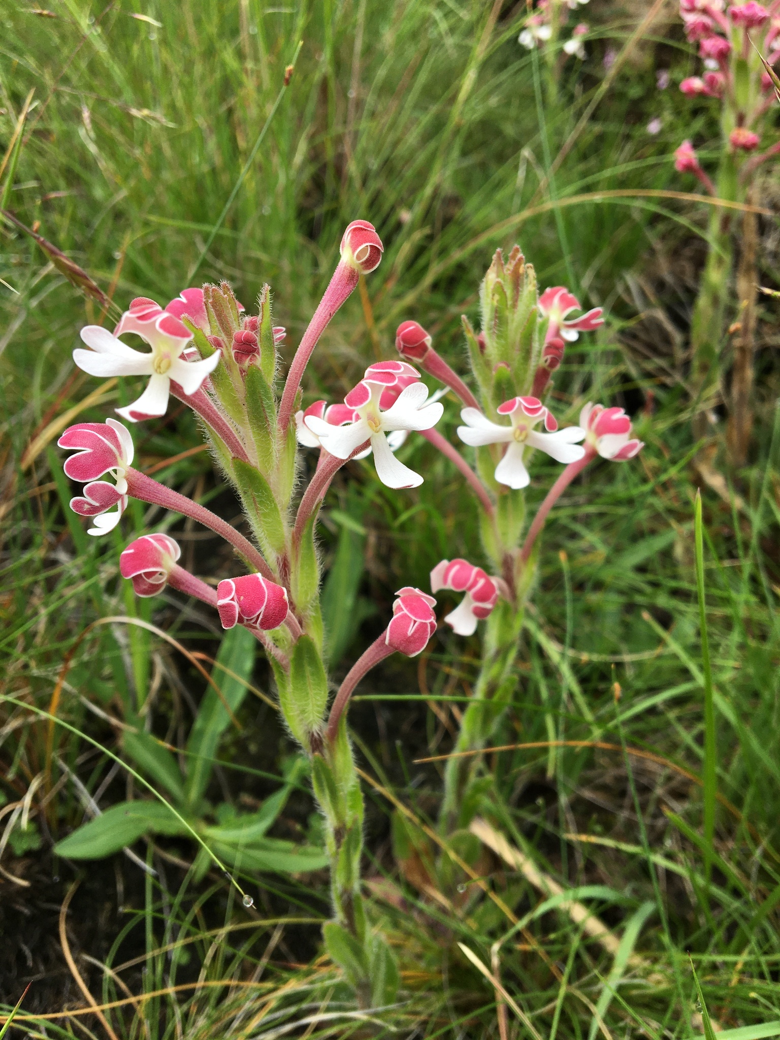Perennial herb, up to 400 mm high; stems 1-few, erect, often simple with crowded vegetative buds on crown. Leaves: radical ones rosulate, oblanceolate to elliptic; cauline ones ascending, oblong or elliptic, grading into bracts; somewhat hairy. Flowers many in a terminal, crowded spike, sometimes with small ones on rachis below, opening in bright light. Corolla: tube up to 52 mm long; limb zygomorphic, held vertically; mouth nearly glabrous; lobes sometimes twice notched, pink or red outside, greenish or cream-coloured inside. Flowering time Jan.-Mar. From: Smithies, SJ; Bredenkamp, CL; Magwaza, ZL. 2019. Scrophulariaceae s.l.?. In: CL Bredenkamp (ed.), A Flora of the Eastern Cape Province. Strelitzia 41(2): 1475-1538. South African National Biodiversity Institute, Pretoria. [CC BY]