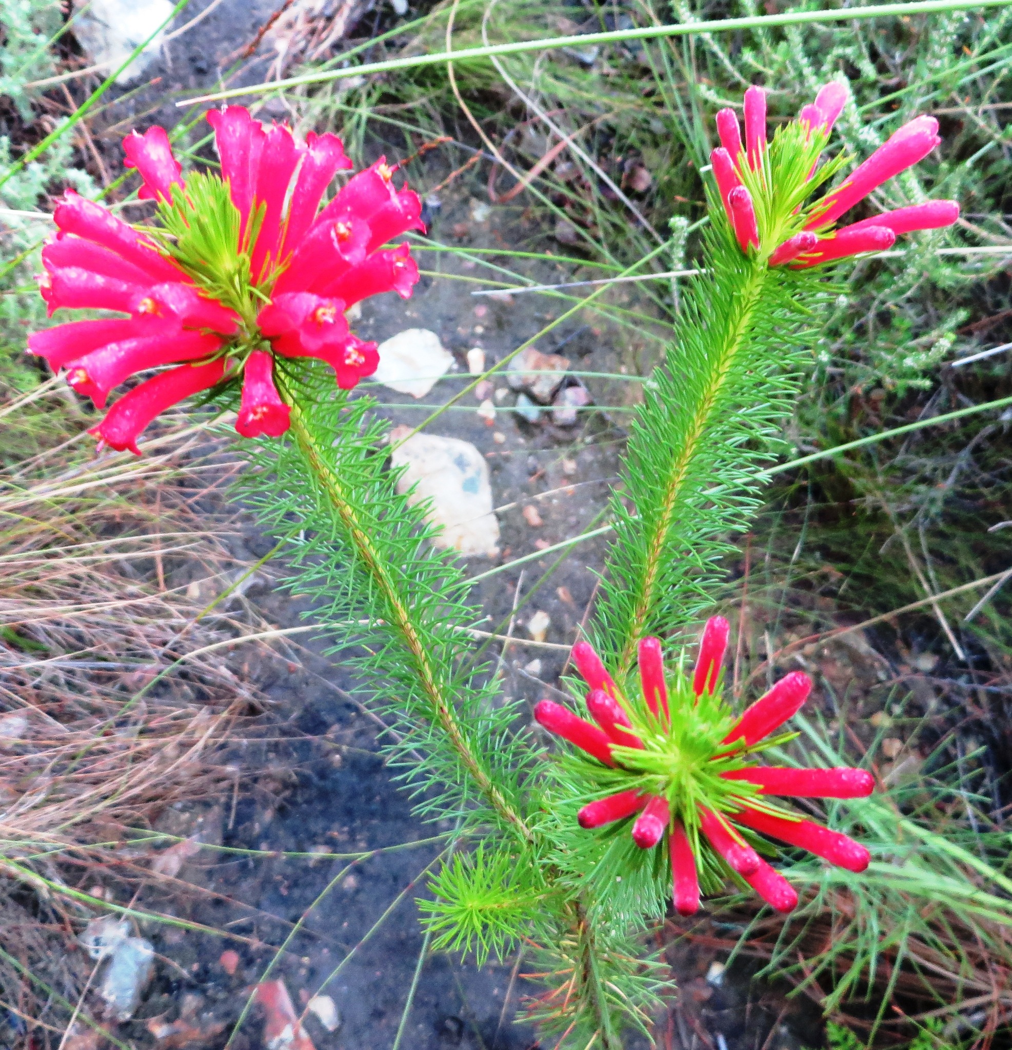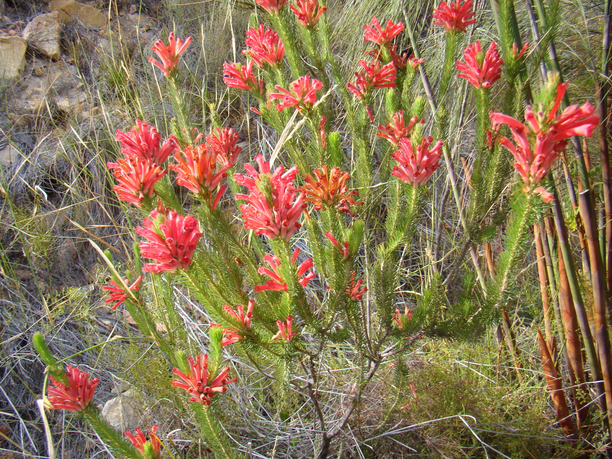 General notes: Alt. 550-600 m. Arid fynbos with some karroo elements. Sandstone. Erect shrublet c. 60cm tall. Flowers deep red.