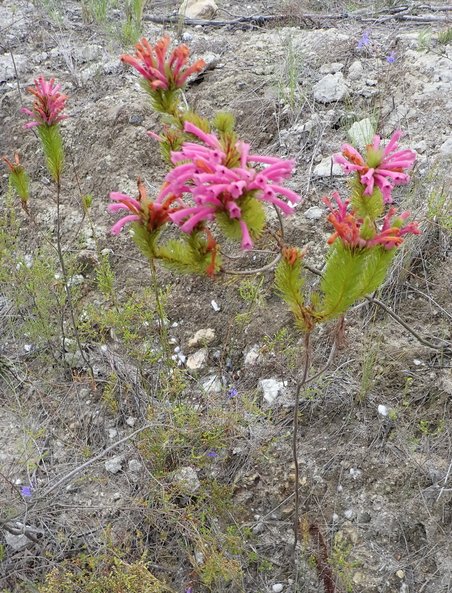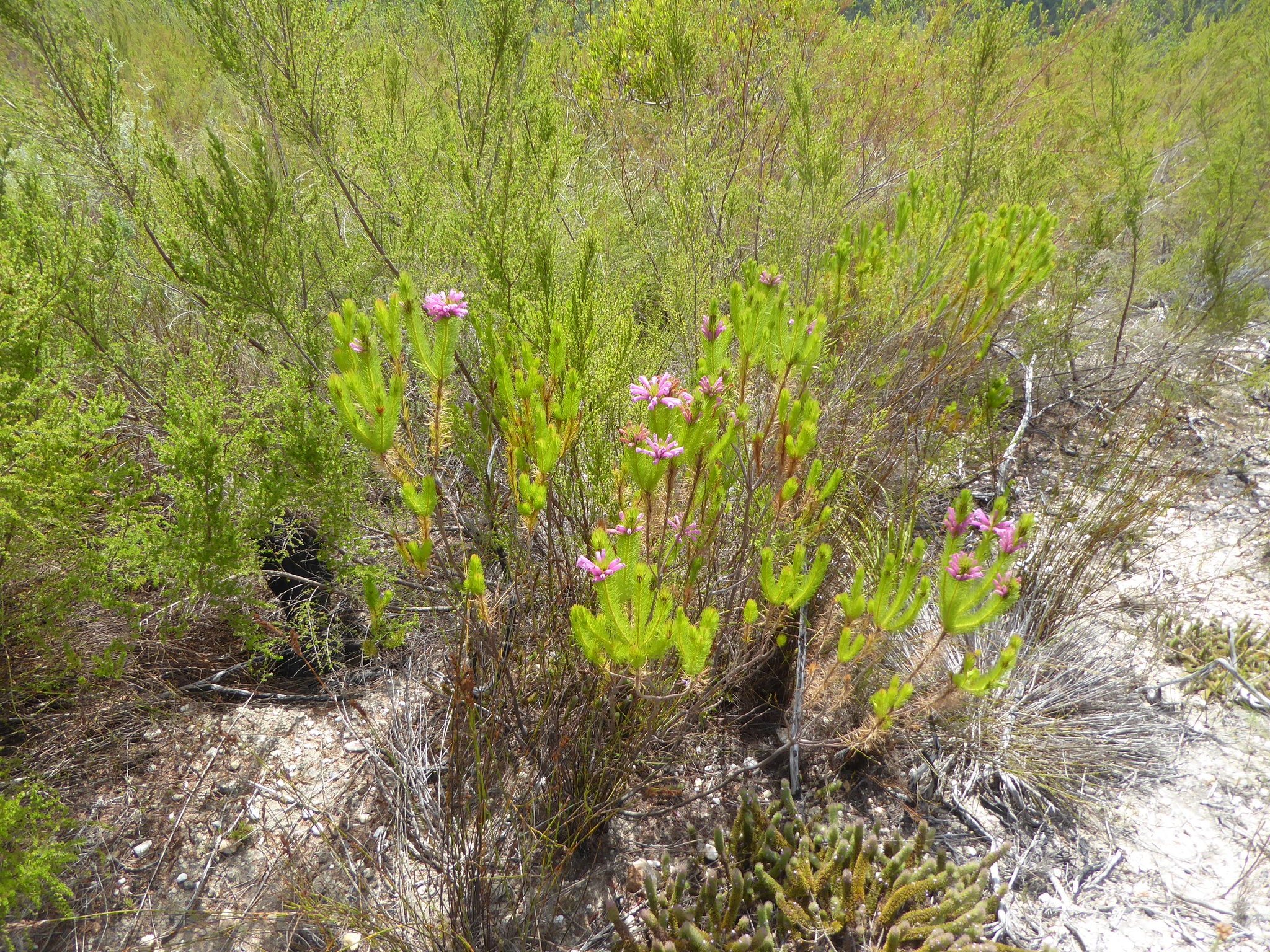 General notes: Alt. 333 m. Mountain fynbos. Soil. Loam. C1S Full sun. Well-drained. Aspect: SE. Veld burnt regularly for grazing. Young veld 4-5 years old. Plant height: 0.75m. Erect shrubs with with pink flowers. Shale band exposed in this area. Occasional.