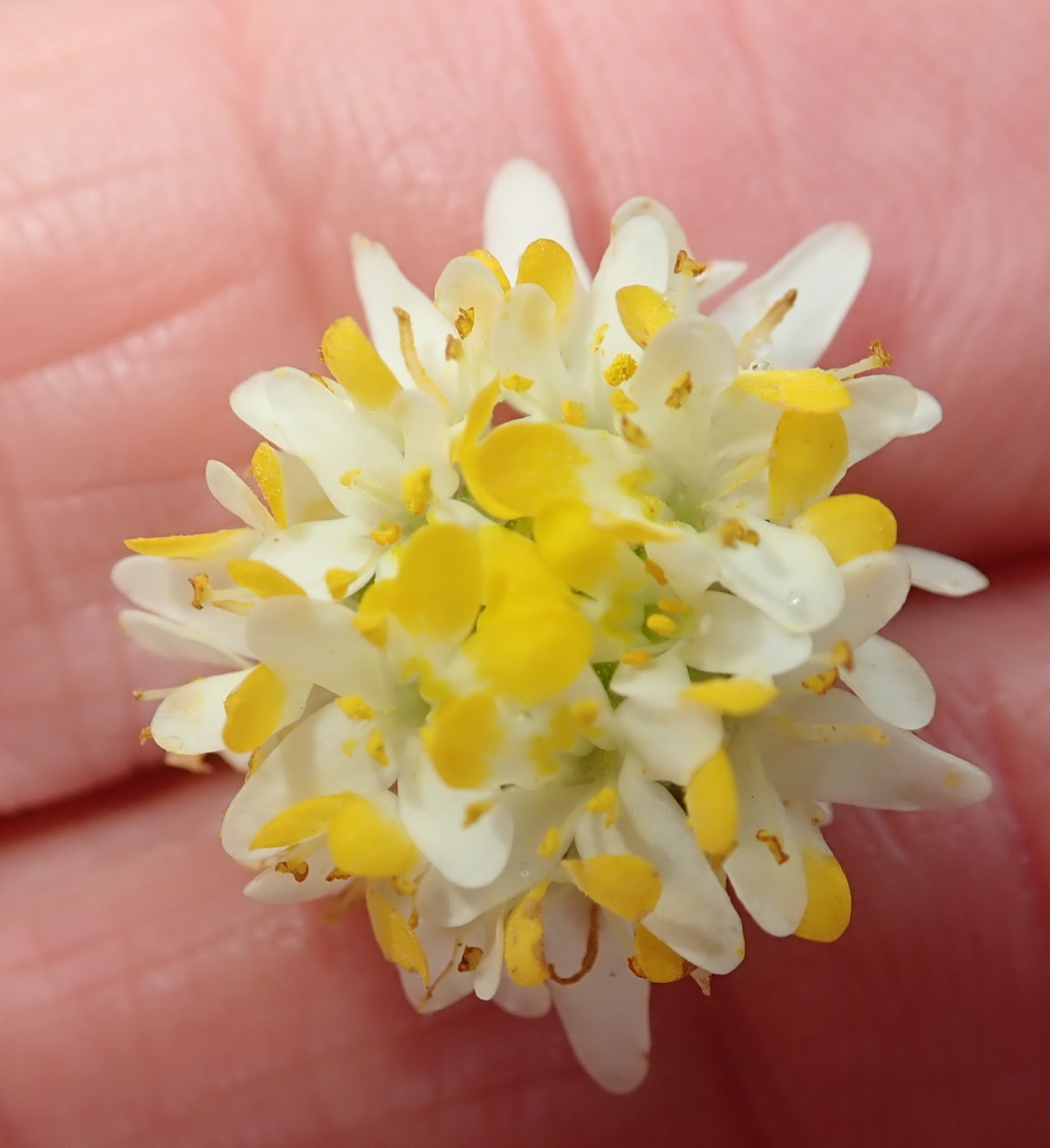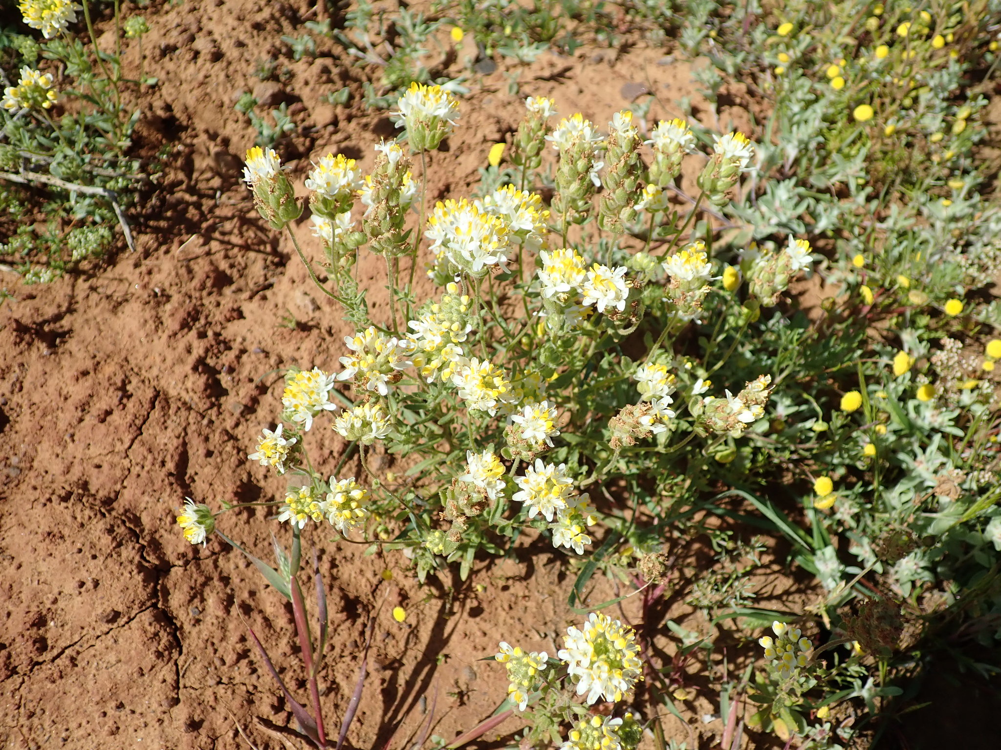 Shortly glandular-hairy annual, up to 200 mm tall. Leaves narrow and sparsely toothed. Flowers in small, rounded, terminal heads, corolla tube 3-3.5 mm long, glabrous, entirely yellow or white with upper lip tipped with yellow. From: Snijman, DA. 2013. Scrophulariaceae: Polycarena. In: DA Snijman (ed.), Plants of the Greater Cape Floristic Region 2: The Extra Cape flora. Strelitzia 30: 472-473. South African National Biodiversity Institute, Pretoria. [CC BY]
