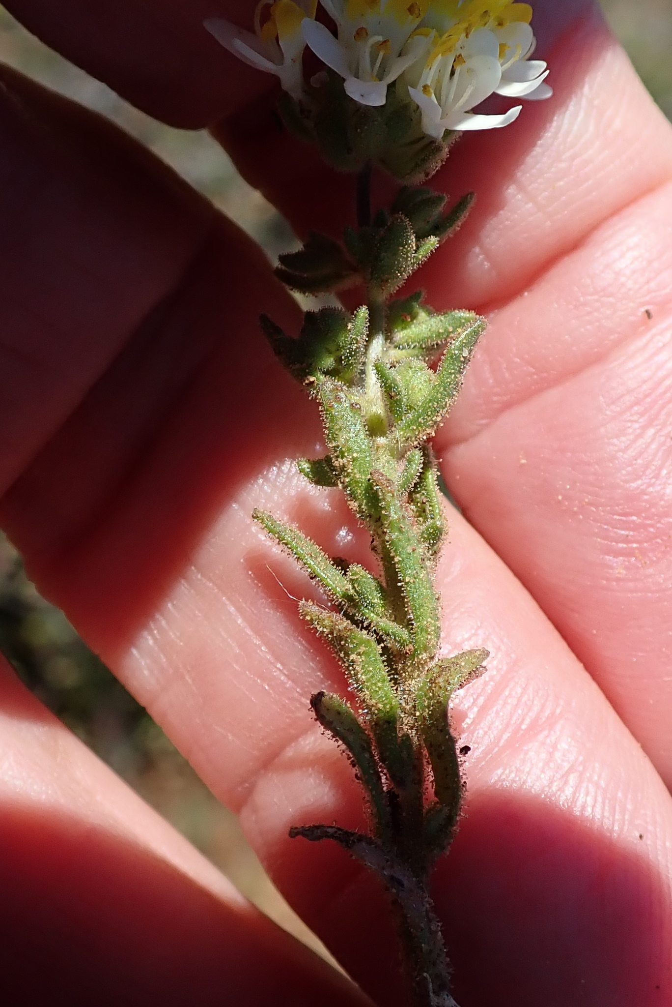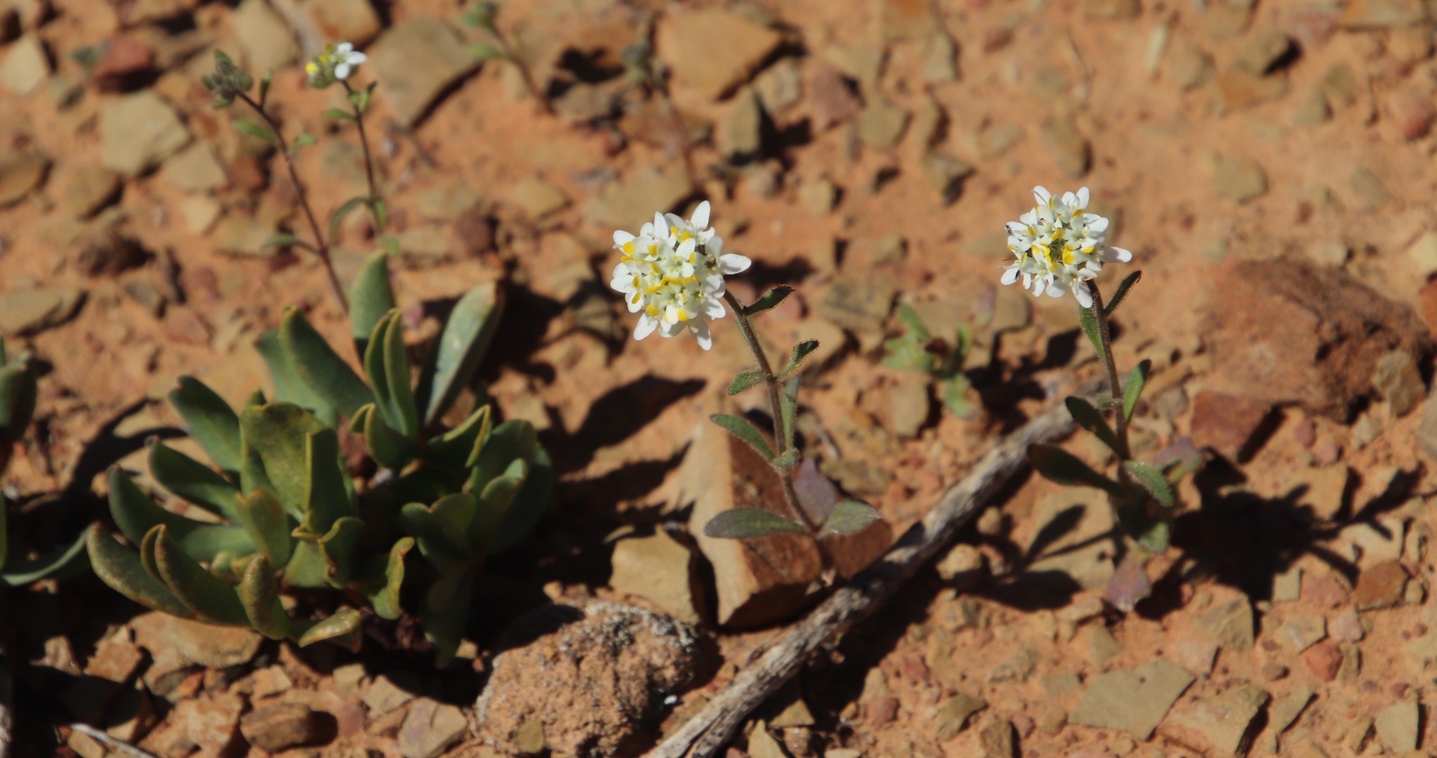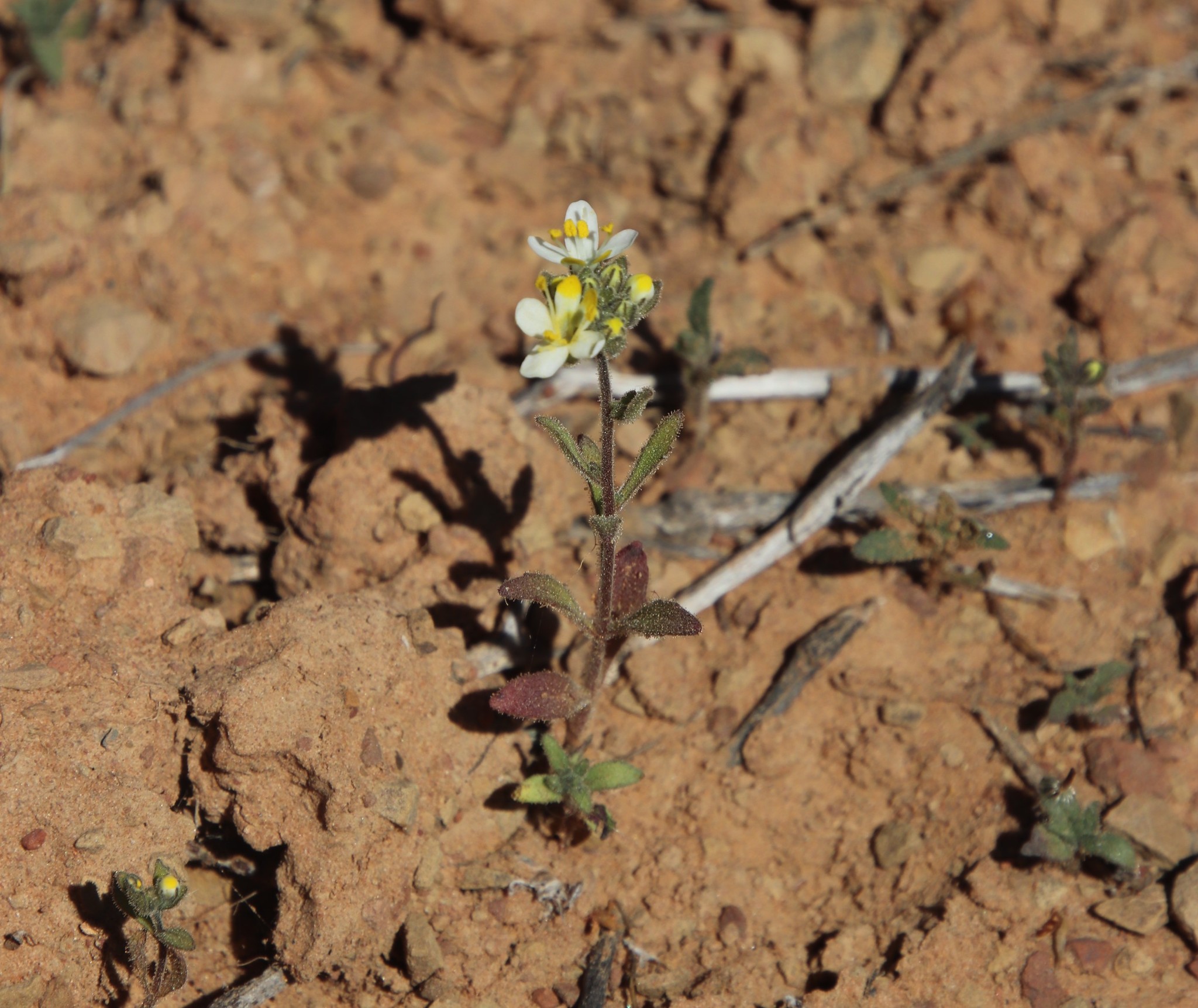 General notes: Karoo vegetation. Plain. Well-drained, grey-brown, sandy soil. Acocks Veld Type: 28. Roadside. SE aspect. Level slope. Widespread, common. Annual, erect, herb. White flowers. No fruit. Plant height 0.25 m. Photographed.