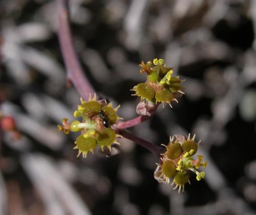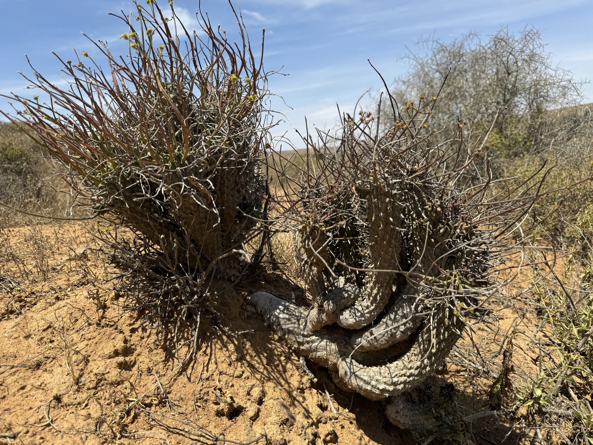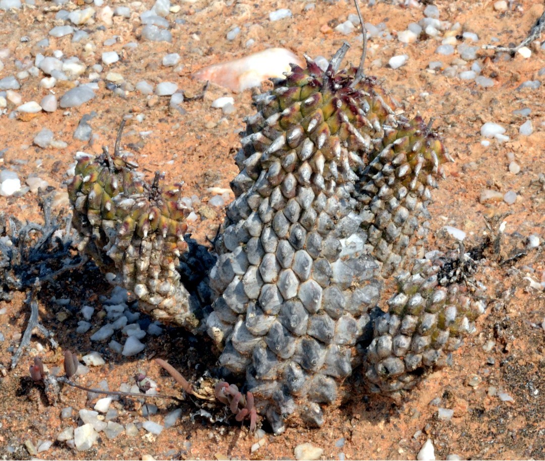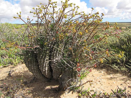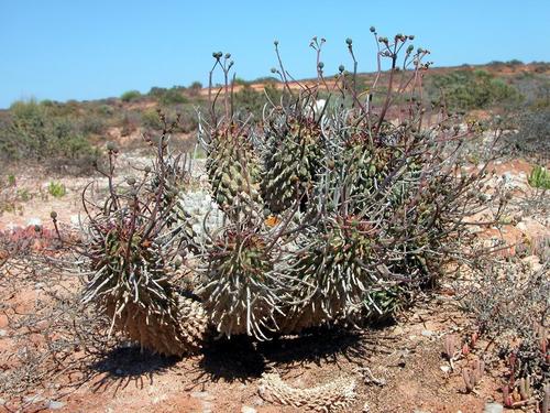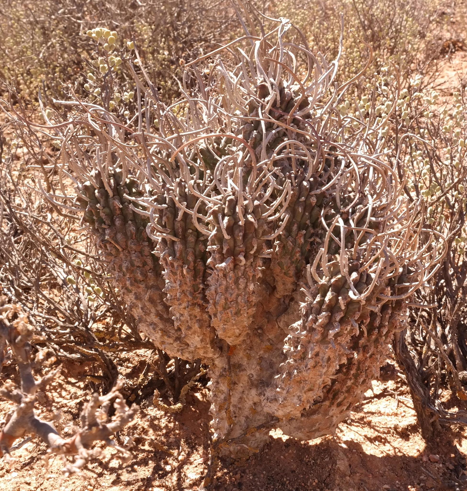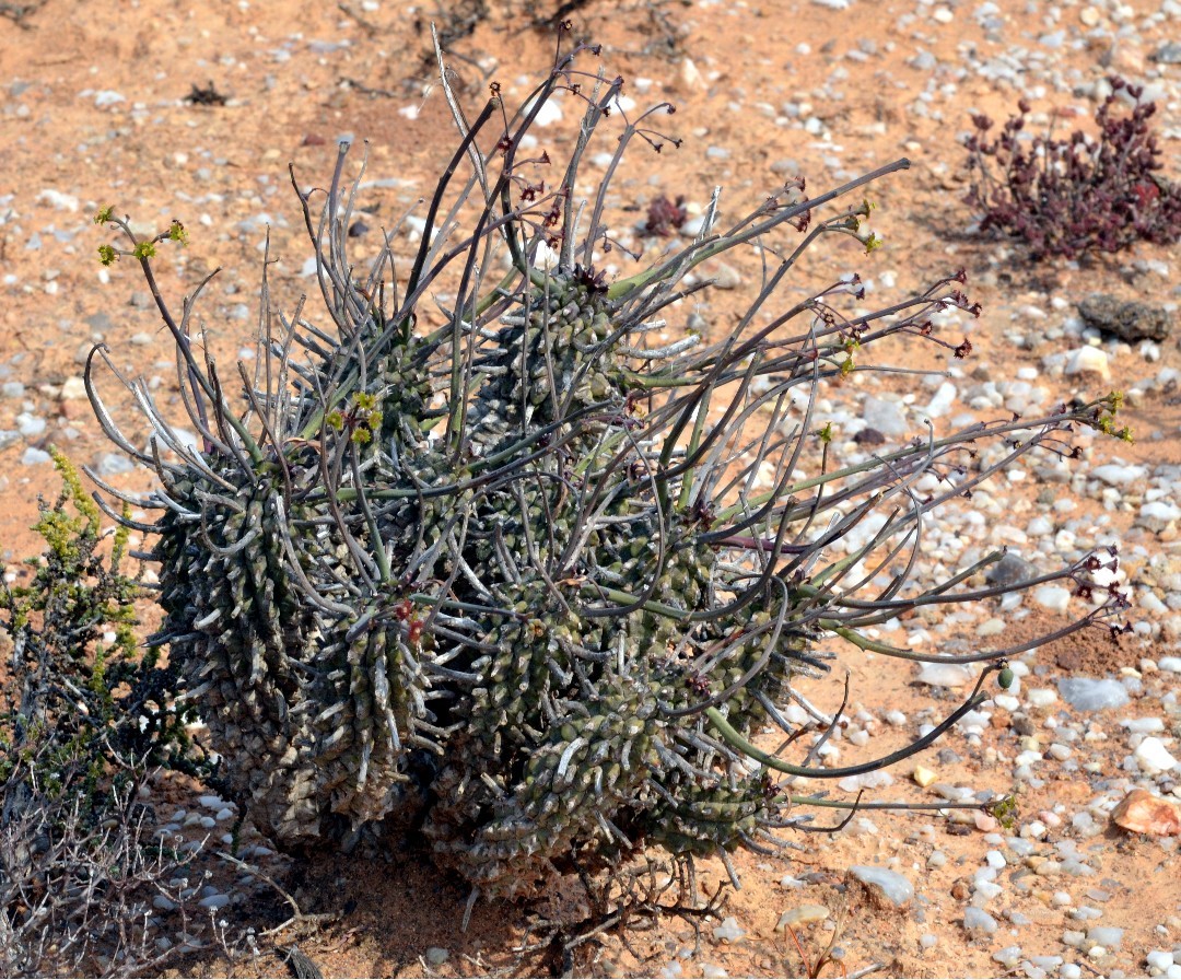 Monoecious, many-stemmed, spineless, glabrous, succulent shrub, up to 0.3 x 0.5 m, stems cylindrical, 30-75 mm thick, covered with spirally arranged, conical tubercles up to 8 mm long. Leaves soon deciduous, oblanceolate-spathulate, 10-25 x 3-6 mm, sessile. Cyathia many around apex of each branch, several on each persistent and later woody peduncle 70-250 mm long in axil of tubercle, 6-8 mm diam., with 4 green glands each with 3-6 yellow teeth on outer margin. Capsule exserted on decurved pedicel, ± 7 mm diam., glabrous. From: Bruyns, PV. 2013. Euphorbiaceae. In: DA Snijman (ed.), Plants of the Greater Cape Floristic Region 2: The Extra Cape flora. Strelitzia 30: 371-379. South African National Biodiversity Institute, Pretoria. [CC BY]