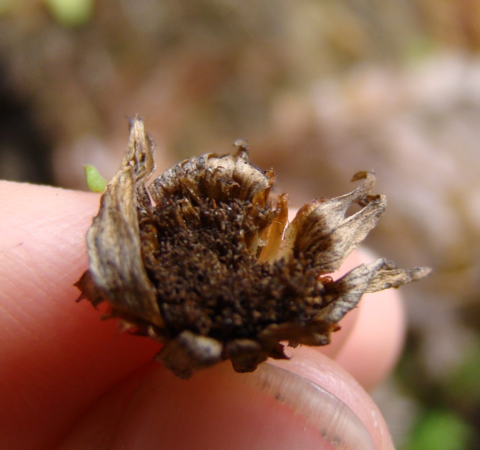 General notes: Fynbos biome. Cliff face. Moist/damp, bare rock. Sandstone. Partial shade. E and SE aspect. No biotic effect seen. Shrub. Rays white, discs yellow. Resprouter. Flowers: present. Rare in crevices on cool, damp cliff faces Veld 7 years old. Plant height: 0.1- 0.20 m.
