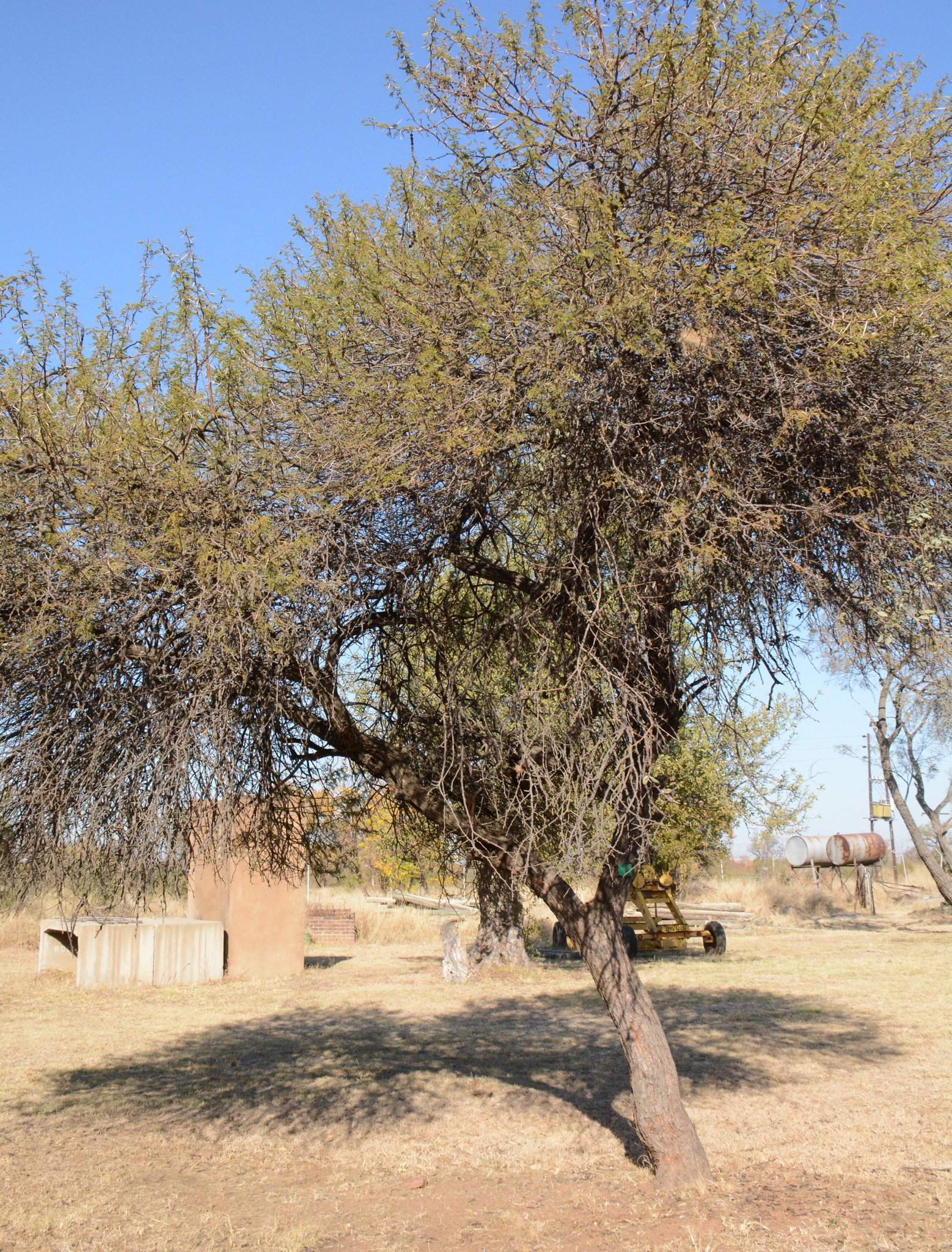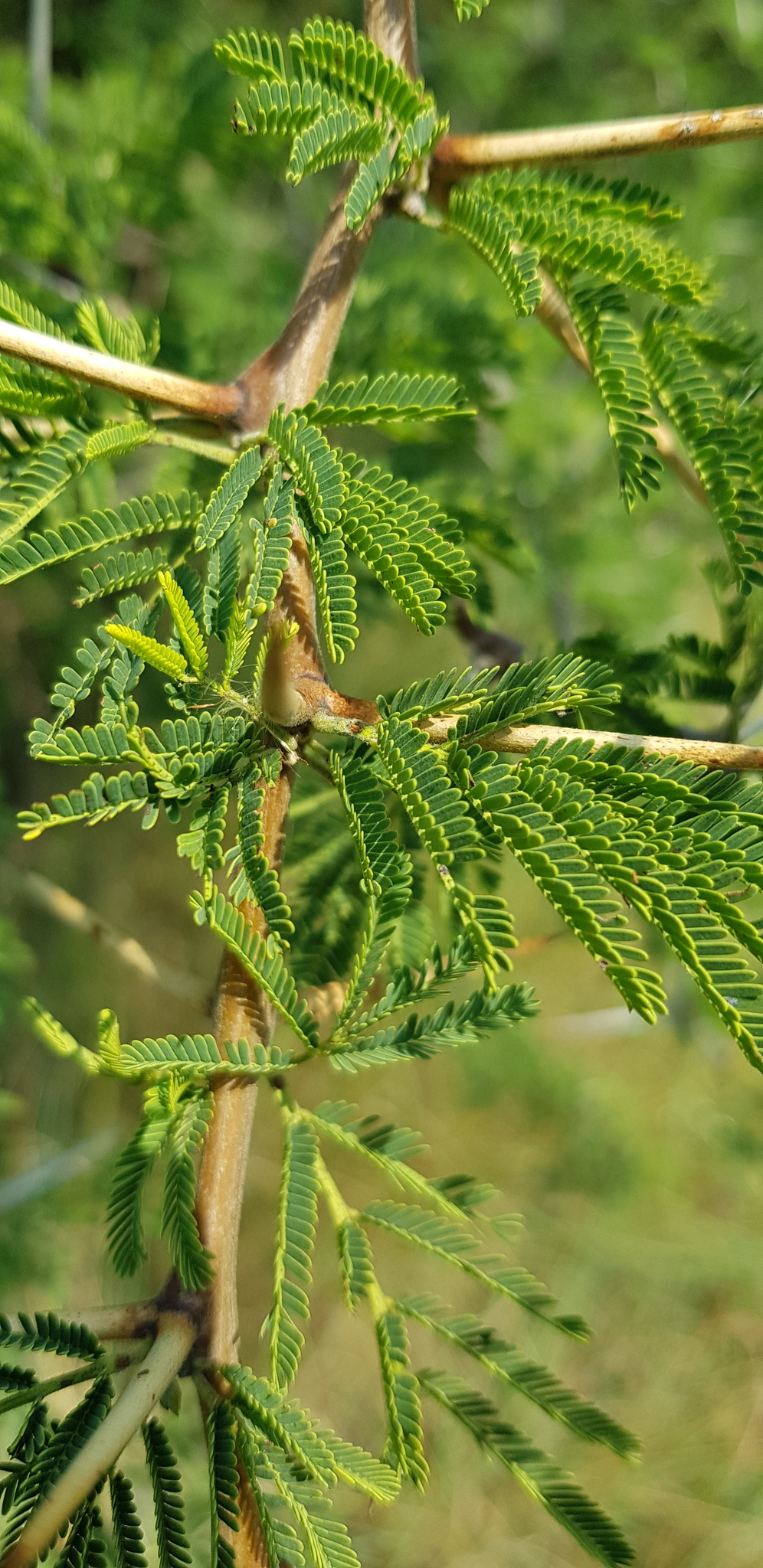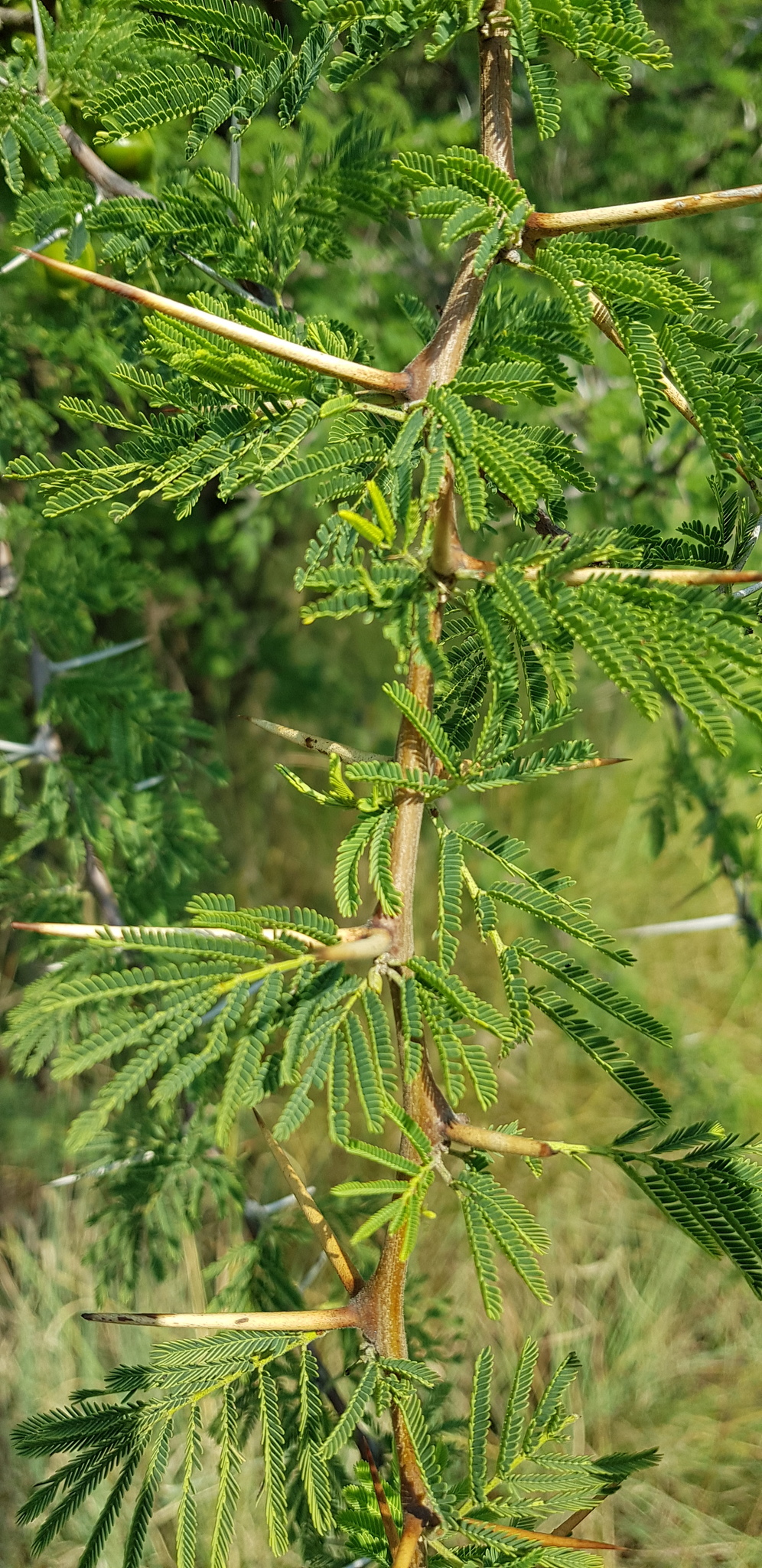 Tree to 10 m high; crown flattened, sometimes irregularly so, or rounded; trunk to 0.35 m in diam. Bark dark brownish-black to black, rough, longitudinally fissured; young branchlets greyish- or reddish-brown to purplish-black, often pinkish when young, sparingly to densely pubescent or occasionally subglabrous, glands inconspicuous or absent. Stipules spinescent, in pairs, 0.4-5.5(15) cm long, straight or almost so, often deflexed, whitish to greyish- or reddish-brown, sparingly to densely pubescent but becoming glabrescent with age; other prickles absent. Leaves: petiole 0.4-1.2(2.4) cm long, sparingly to densely pubescent or occasionally subglabrous, adaxial gland usually present, sometimes two present, often a short distance below the lowest pinna pair, up to 1.8 x 0.8 mm; rhachis (1.2)2.7-5.8(8) cm long, sparingly to densely pubescent or occasionally subglabrous, with a gland at the junction of each pinna pair or between the top few pairs only; pinnae (3)5-11(14) pairs; rhachillae 0.9-2.8(4.4) cm long; leaflets 12-27(36) pairs per pinna, 1.5-5.5 x 0.5-1.5 mm, linear to linear-oblong, apex rounded to subacute but not spinulose-mucronate, margins usually sparsely to densely ciliate, glabrous above and below or rarely puberulous below. Inflorescences capitate, on axillary peduncles, solitary or fascicled. Flowers bright-yellow, sessile; peduncles 1.2-4.5 cm long, sparingly to densely pubescent, rarely subglabrous; involucel from near the base to just over halfway up the peduncle. Calyx glabrous to densely pubescent, especially apically, tube 0.8-1.6 mm long, lobes up to 0.4 mm long. Corolla glabrous to pubescent, especially apically, tube 2-2.6 mm long, lobes up to 1.1 mm long, often reflexed. Stamen-filaments free or sometimes united into bundles basally, up to 5 mm long; anthers with a deciduous apical gland. Ovary up to 1.1 mm long, sessile or shortly stipitate, glabrous but soon becoming pubescent. Pods green and fleshy when young but shrivelling and turning black with age, (5.2)8-17(19.5) x 0.9-1.6(1.9) cm, oblong, straight or slightly falcate, margins shallowly to deeply crenate between each seed, each joint marked with a distinct raised bump which corresponds to the seed inside, sparingly to densely pubescent all over at first but the raised parts over the seeds becoming glabrescent and shining with age, rarely subglabrous throughout, sweet-smelling, indehiscent, breaking up transversely into segments on the ground. Seeds olive-brown, 6.5-9 x 5-8 mm, subcircular, scarcely compressed; areole 5-7 x 4-7 mm. From: Ross, JH. 1975. Mimosoideae. Fl. S. Africa 16(1): 1-155. BRI, Pretoria. [CC BY] As: Acacia nilotica (L.) Willd. ex Delile
