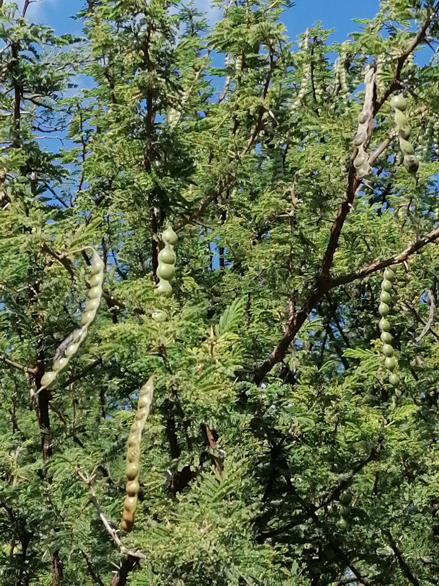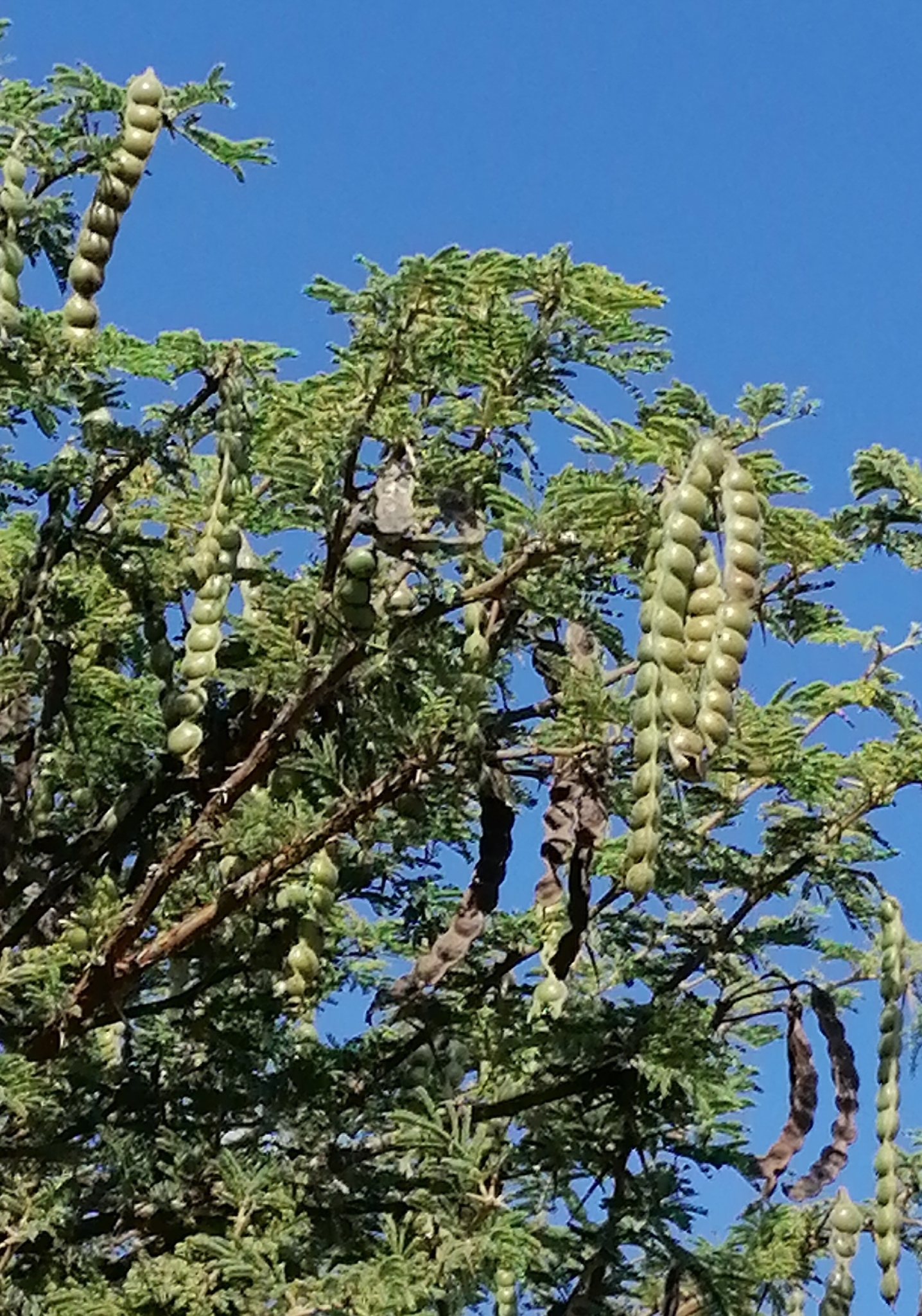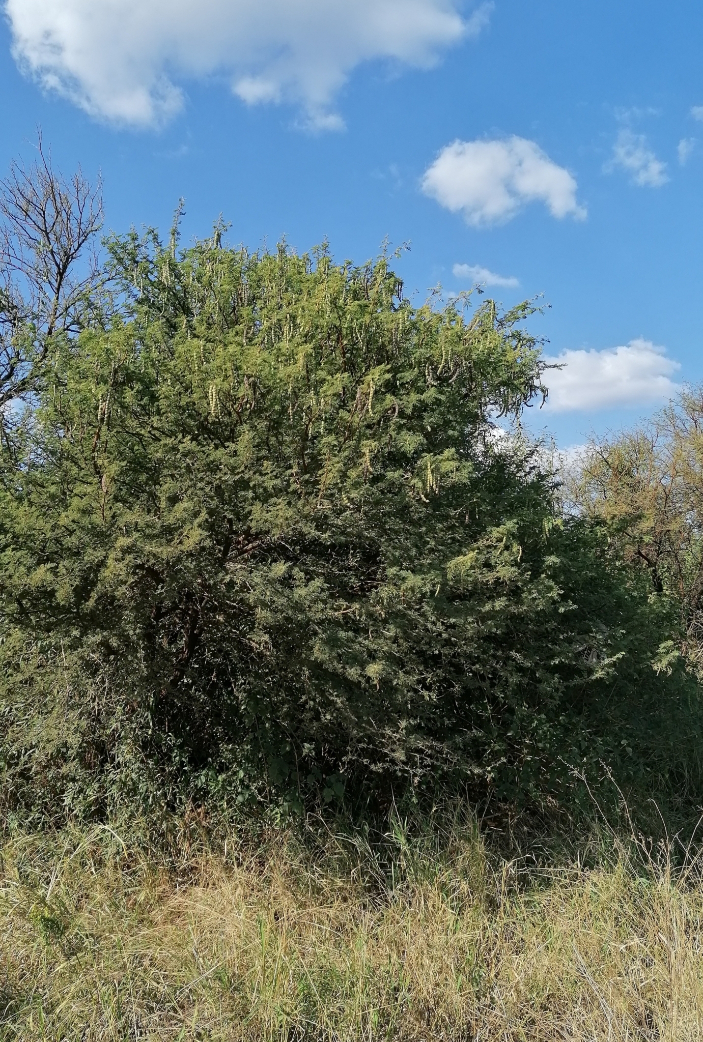 Tree to 10 m high; crown flattened, sometimes irregularly so, or rounded; trunk to 0.35 m in diam. Bark dark brownish-black to black, rough, longitudinally fissured; young branchlets greyish- or reddish-brown to purplish-black, often pinkish when young, sparingly to densely pubescent or occasionally subglabrous, glands inconspicuous or absent. Stipules spinescent, in pairs, 0.4-5.5(15) cm long, straight or almost so, often deflexed, whitish to greyish- or reddish-brown, sparingly to densely pubescent but becoming glabrescent with age; other prickles absent. Leaves: petiole 0.4-1.2(2.4) cm long, sparingly to densely pubescent or occasionally subglabrous, adaxial gland usually present, sometimes two present, often a short distance below the lowest pinna pair, up to 1.8 x 0.8 mm; rhachis (1.2)2.7-5.8(8) cm long, sparingly to densely pubescent or occasionally subglabrous, with a gland at the junction of each pinna pair or between the top few pairs only; pinnae (3)5-11(14) pairs; rhachillae 0.9-2.8(4.4) cm long; leaflets 12-27(36) pairs per pinna, 1.5-5.5 x 0.5-1.5 mm, linear to linear-oblong, apex rounded to subacute but not spinulose-mucronate, margins usually sparsely to densely ciliate, glabrous above and below or rarely puberulous below. Inflorescences capitate, on axillary peduncles, solitary or fascicled. Flowers bright-yellow, sessile; peduncles 1.2-4.5 cm long, sparingly to densely pubescent, rarely subglabrous; involucel from near the base to just over halfway up the peduncle. Calyx glabrous to densely pubescent, especially apically, tube 0.8-1.6 mm long, lobes up to 0.4 mm long. Corolla glabrous to pubescent, especially apically, tube 2-2.6 mm long, lobes up to 1.1 mm long, often reflexed. Stamen-filaments free or sometimes united into bundles basally, up to 5 mm long; anthers with a deciduous apical gland. Ovary up to 1.1 mm long, sessile or shortly stipitate, glabrous but soon becoming pubescent. Pods green and fleshy when young but shrivelling and turning black with age, (5.2)8-17(19.5) x 0.9-1.6(1.9) cm, oblong, straight or slightly falcate, margins shallowly to deeply crenate between each seed, each joint marked with a distinct raised bump which corresponds to the seed inside, sparingly to densely pubescent all over at first but the raised parts over the seeds becoming glabrescent and shining with age, rarely subglabrous throughout, sweet-smelling, indehiscent, breaking up transversely into segments on the ground. Seeds olive-brown, 6.5-9 x 5-8 mm, subcircular, scarcely compressed; areole 5-7 x 4-7 mm. From: Ross, JH. 1975. Mimosoideae. Fl. S. Africa 16(1): 1-155. BRI, Pretoria. [CC BY] As: Acacia nilotica (L.) Willd. ex Delile