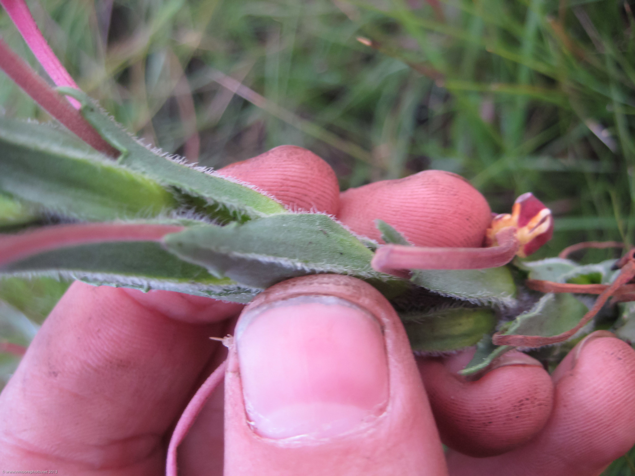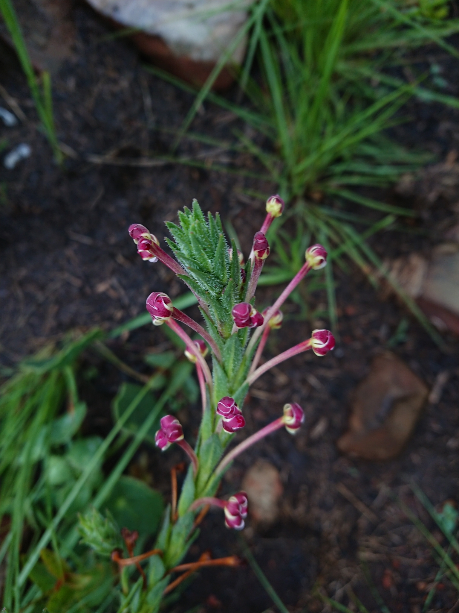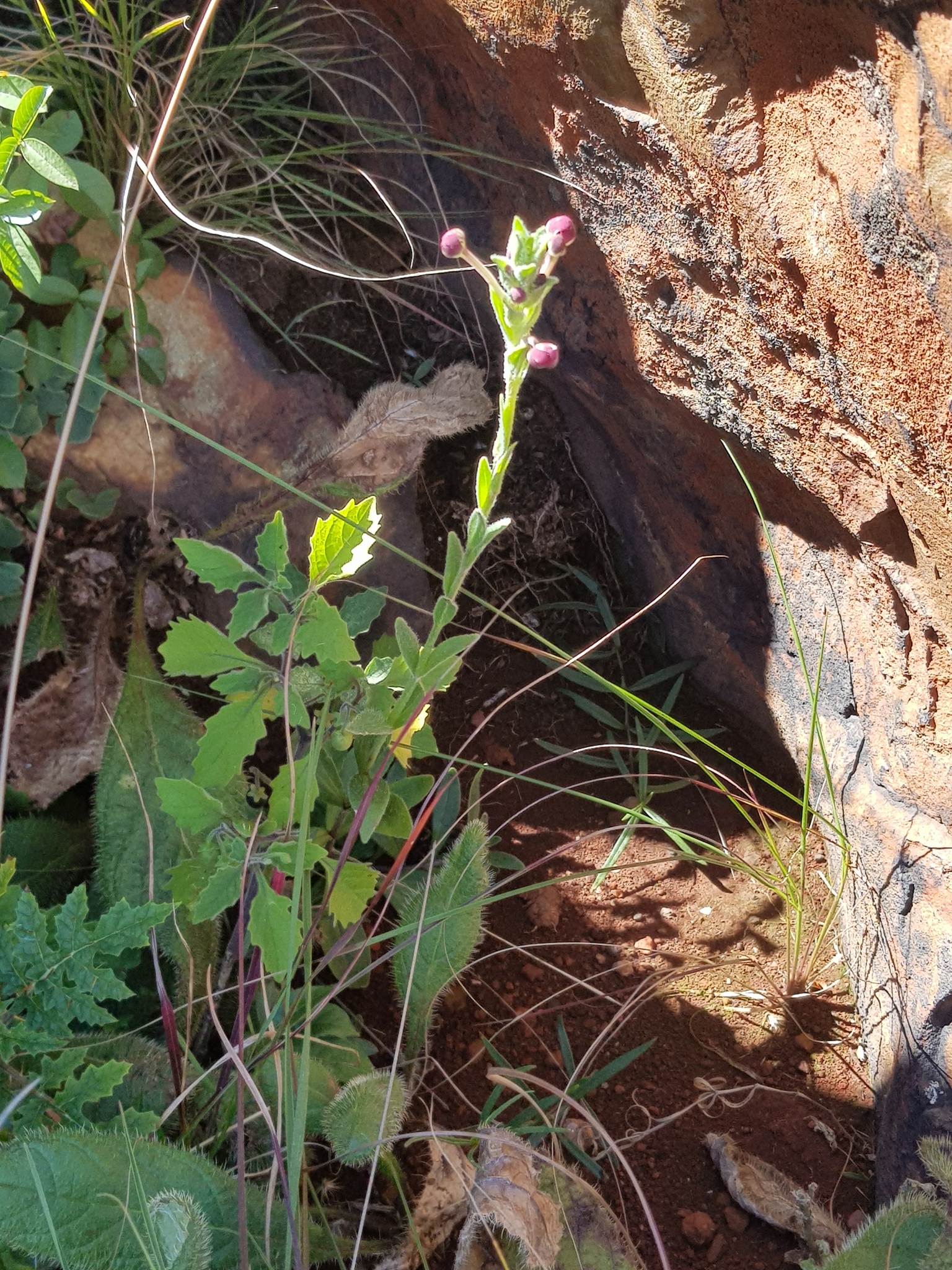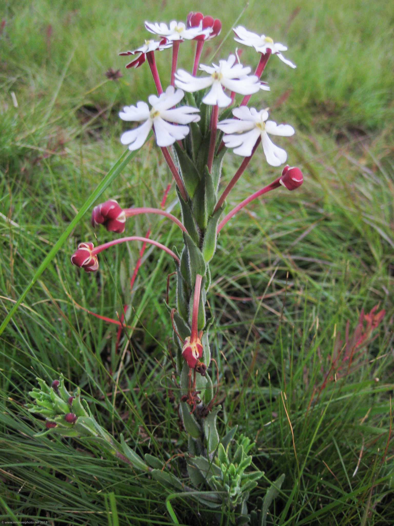 Perennial herb, taproot and crown becoming thick and woody, vegetative buds, when present, small, not developing into a thick clump; stems several from the crown in old plants, ascending, up to 600 mm long, often simple, sometimes branched, clad in retrorse white hairs, leafy. Leaves on lower part of stem 35-70 x 2-8(-10) mm, becoming smaller and often more distant upwards, uppermost generally 15-25 x 1.5 mm, sometimes broader, rarely up to 40 mm long, all more or less ascending, oblong-elliptic or linear, margins entire or with a few small callose teeth, often glabrous or with hairs on margins and midline, rarely hairy all over. Flowers opening at dusk or in dull light and then scented, many in a long narrow spike elongating as the flowers open and capsules develop, small secondary spikes sometimes developing below the main fruiting spike. Bracts adnate to calyx for 2-3 mm, lanceolate, (9-)10-14(-20) mm long, margins entire, glabrous or hairy as the leaves. Calyx 8-13 mm long, lips 34 mm long, either glabrous except for marginal hairs, or sometimes hairs better developed, exceptionally hairy all over. Corolla tube 30-40(-44) mm long, glandular-puberulous, hairs up to 0.1 mm long, limb held vertically, somewhat zygomorphic; mouth with circlet of long unicellular hairs often poorly developed or wanting on anticous side; the two upper lobes fractionally more united than the 3 lower, the anticous lobe slightly isolated from the other 4 and often narrower, lobes 3.5-5(-6) mm long, deeply notched, crimson and glandular-puberulous outside, white and glabrous inside. Stamens 4, anticous anthers 1.2-1.8 mm long, shortly exserted, posticous ones 34 mm long, included. Stigma 6-8 mm long, exserted. Capsule 10-15 x 4-5 mm. Seeds c. 1.3 x 0.8-1 mm, angled, colliculate, pallid. From: Hilliard, OM. 1994. The Manuleae: a tribe of Scrophulariaceae. Edinburgh University Press, Edinburgh. [All rights reserved]