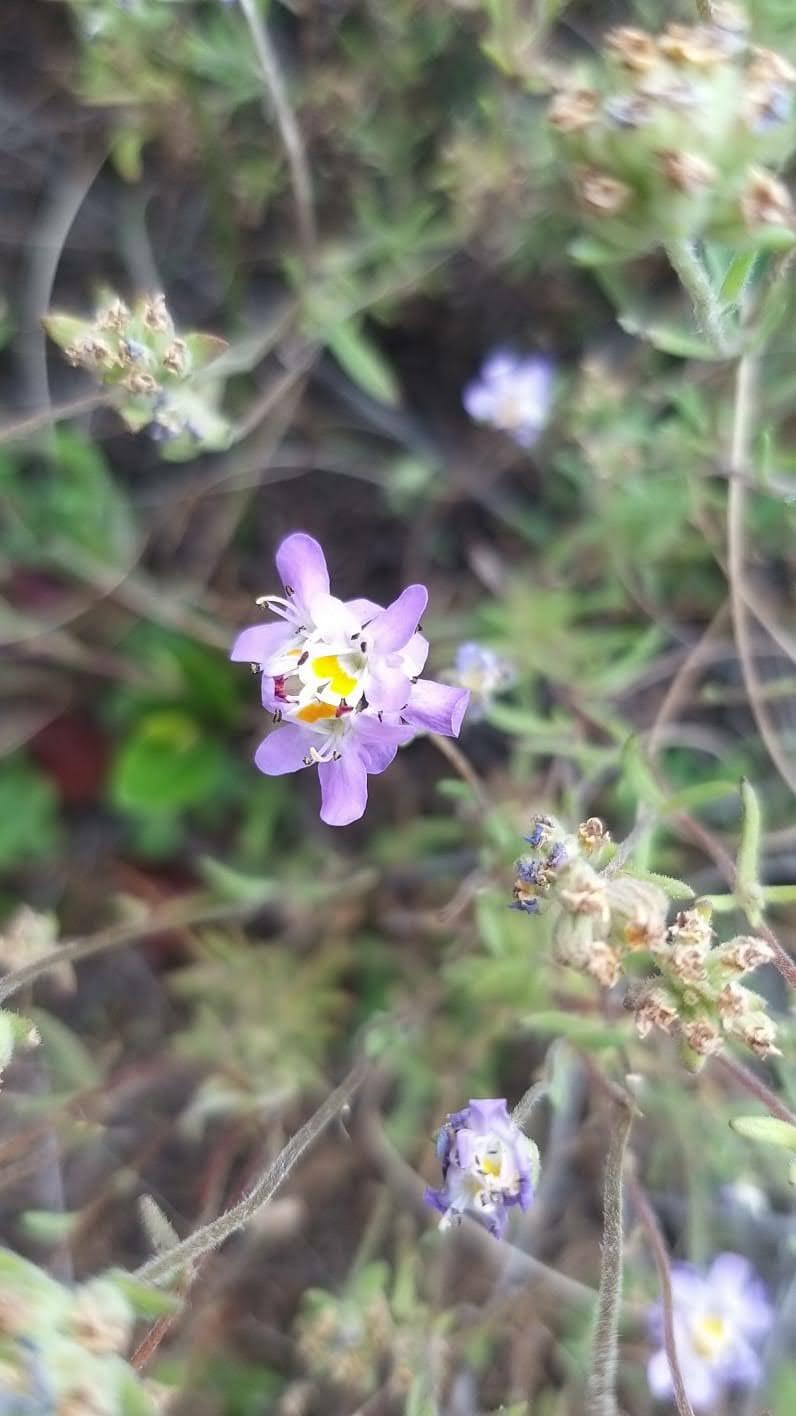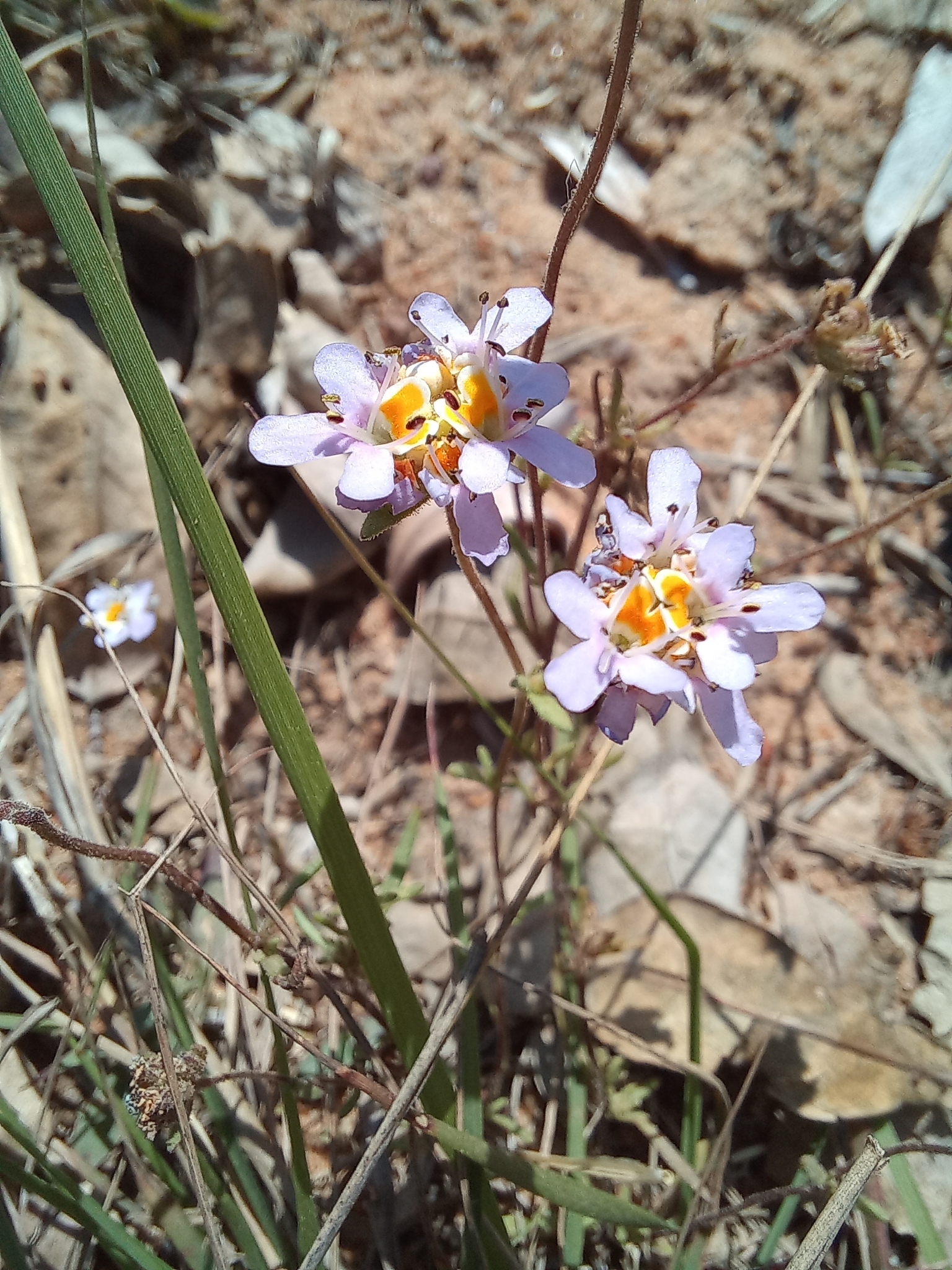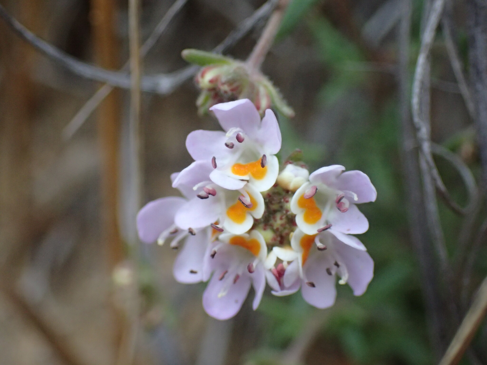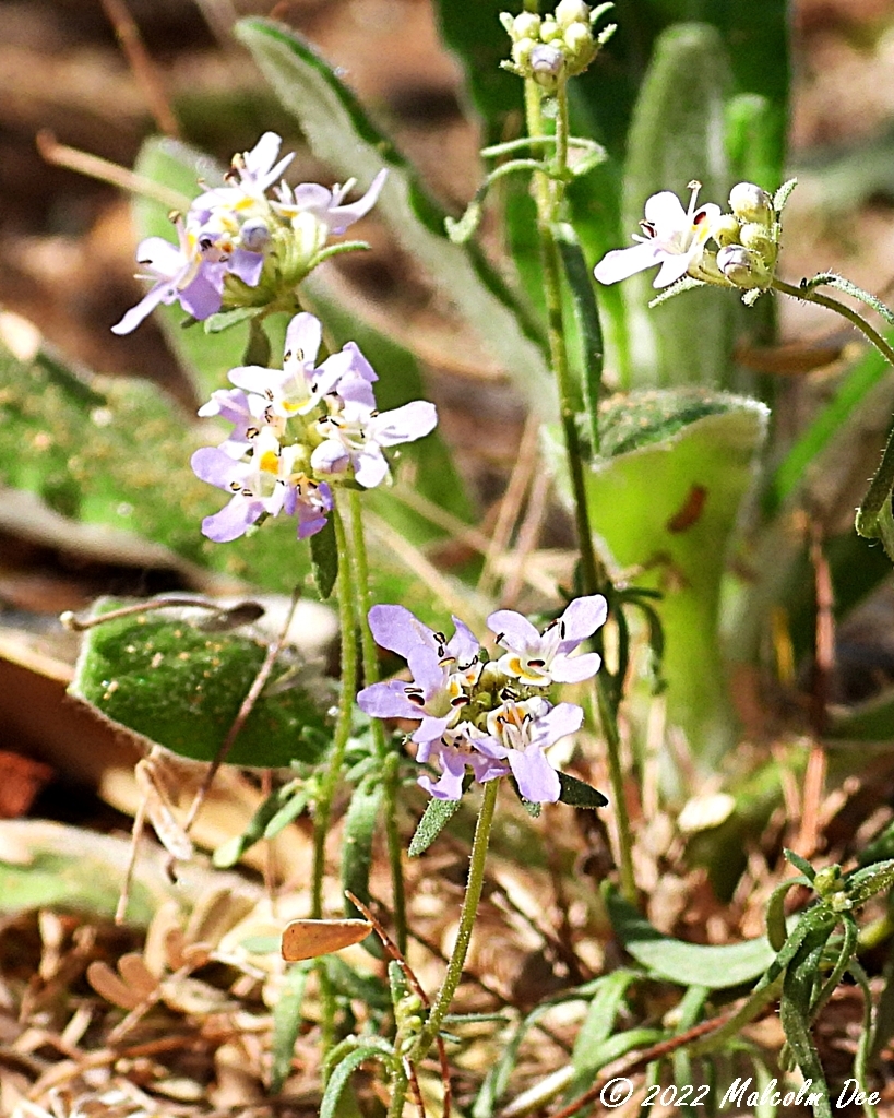 Annual herb, stems c. 40-250 mm long, up to 2.5 mm diam. at base, simple to branching from the base and above, erect or decumbent, leafy, glandular-puberulous particularly on the upper parts, pubescent throughout with eglandular hairs up to 0.5-1 mm long, obtuse, usually more or less retrorse. Leaves opposite, often becoming alternate on the inflorescence branches, blade of radical leaves (which are often wanting) c. 4-13 x 2-6 mm, elliptic, tapering to a flat petiolar part c. 3-8 mm long, from about half as long to about equalling the blade; primary stem leaves c. 7-30 x 0.5-4 mm, linear-oblong to oblanceolate, often with axillary tufts of smaller leaves, margins entire to toothed (2-5 pairs of teeth in the upper half) particularly in the larger leaves, upper surface with coarse tapering eglandular hairs up to 0.6-1mm long, mostly along the margins and on the lower half of the blade, lower surface glandular-puberulous, eglandular hairs confined to midrib. Flowers many in crowded rounded heads terminating all the branch-lets, which are nude towards the tips, the heads elongating in fruit and sometimes becoming very lax. Bracts at base of racemes (2-)4-12 x (0.5-)1-1.75 mm, smaller upwards, linear to oblong-lanceolate, adnate to pedicel only or to extreme base of calyx as well, glandular-puberulous all over, eglandular hairs as well, mainly on margins, up to 0.5-1 mm long. Pedicels up to 0.5-1.5 mm long. Calyx bilabiate, tube 1-1.6 mm long, anticous lobe 1.5-2.5 x 0.5-0.8 mm, anticous lip split 1-1.8 mm, posticous lobes narrower and more deeply separated, whole calyx glandular-puberulous with longer eglandular hairs on margins. Corolla tube 2.54 x 0.75-1.2 mm, widening slightly in throat, limb 4-6 mm across the lateral lobes, posticous lobes 0.75-1.75 x 0.75-1.6 mm, anticous lobe 2-3 x 1-2 mm, all lobes elliptic, posticous lip bearded, hairs sometimes extending to the anticous lobes, orange patch at base of posticous lip or lower half of posticous lobes orange, rest of limb blue or mauve, perhaps sometimes creamy-coloured. Stamens 4, anthers 0.6-0.8 mm long, dark-coloured, all well exserted. Stigma well exserted. Capsules 2.5-3 x 2-2.5 mm Seeds many in each loculus, 0.25-0.5 mm long. Flowering has been recorded between March and October with most records (14 out of 21 collections seen) in August and September. From: Hilliard, OM. 1994. The Manuleae: a tribe of Scrophulariaceae. Edinburgh University Press, Edinburgh. [All rights reserved]