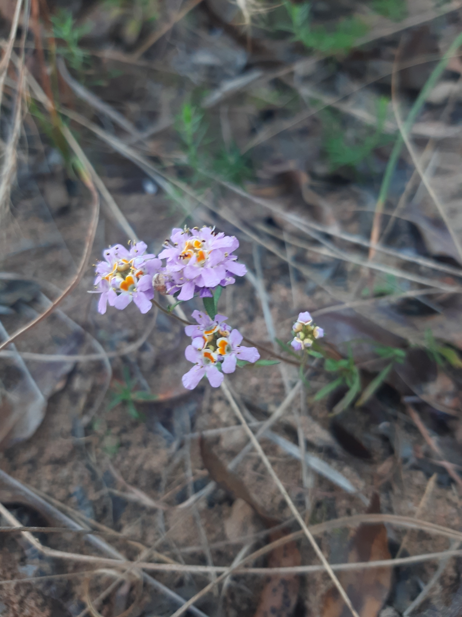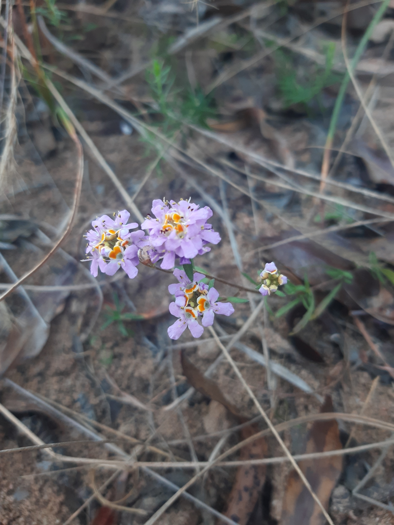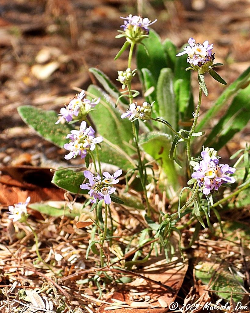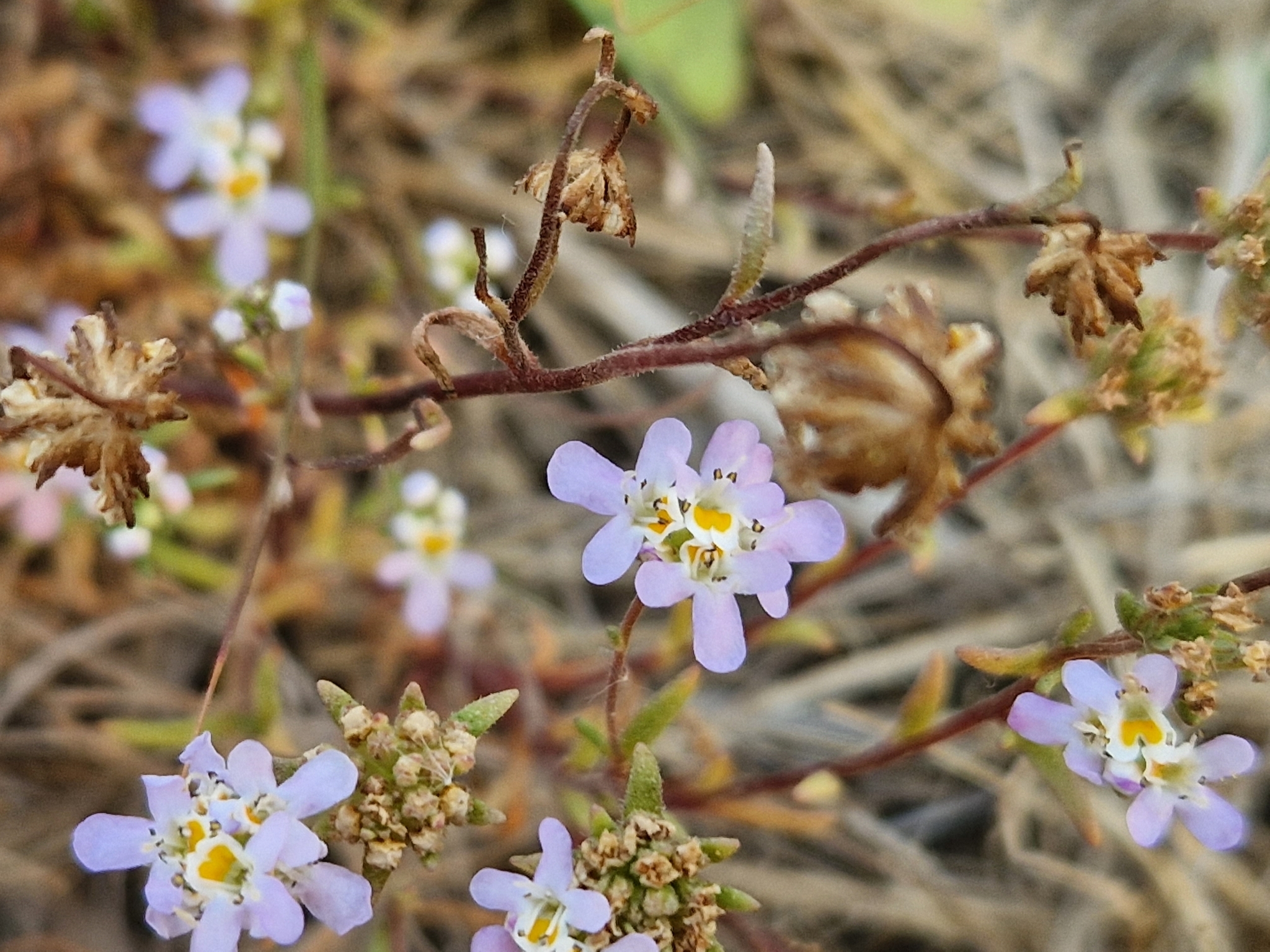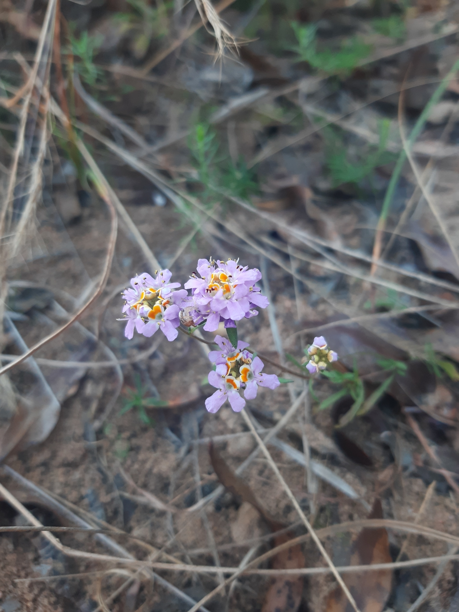 Annual herb, stems c. 40-250 mm long, up to 2.5 mm diam. at base, simple to branching from the base and above, erect or decumbent, leafy, glandular-puberulous particularly on the upper parts, pubescent throughout with eglandular hairs up to 0.5-1 mm long, obtuse, usually more or less retrorse. Leaves opposite, often becoming alternate on the inflorescence branches, blade of radical leaves (which are often wanting) c. 4-13 x 2-6 mm, elliptic, tapering to a flat petiolar part c. 3-8 mm long, from about half as long to about equalling the blade; primary stem leaves c. 7-30 x 0.5-4 mm, linear-oblong to oblanceolate, often with axillary tufts of smaller leaves, margins entire to toothed (2-5 pairs of teeth in the upper half) particularly in the larger leaves, upper surface with coarse tapering eglandular hairs up to 0.6-1mm long, mostly along the margins and on the lower half of the blade, lower surface glandular-puberulous, eglandular hairs confined to midrib. Flowers many in crowded rounded heads terminating all the branch-lets, which are nude towards the tips, the heads elongating in fruit and sometimes becoming very lax. Bracts at base of racemes (2-)4-12 x (0.5-)1-1.75 mm, smaller upwards, linear to oblong-lanceolate, adnate to pedicel only or to extreme base of calyx as well, glandular-puberulous all over, eglandular hairs as well, mainly on margins, up to 0.5-1 mm long. Pedicels up to 0.5-1.5 mm long. Calyx bilabiate, tube 1-1.6 mm long, anticous lobe 1.5-2.5 x 0.5-0.8 mm, anticous lip split 1-1.8 mm, posticous lobes narrower and more deeply separated, whole calyx glandular-puberulous with longer eglandular hairs on margins. Corolla tube 2.54 x 0.75-1.2 mm, widening slightly in throat, limb 4-6 mm across the lateral lobes, posticous lobes 0.75-1.75 x 0.75-1.6 mm, anticous lobe 2-3 x 1-2 mm, all lobes elliptic, posticous lip bearded, hairs sometimes extending to the anticous lobes, orange patch at base of posticous lip or lower half of posticous lobes orange, rest of limb blue or mauve, perhaps sometimes creamy-coloured. Stamens 4, anthers 0.6-0.8 mm long, dark-coloured, all well exserted. Stigma well exserted. Capsules 2.5-3 x 2-2.5 mm Seeds many in each loculus, 0.25-0.5 mm long. Flowering has been recorded between March and October with most records (14 out of 21 collections seen) in August and September. From: Hilliard, OM. 1994. The Manuleae: a tribe of Scrophulariaceae. Edinburgh University Press, Edinburgh. [All rights reserved]