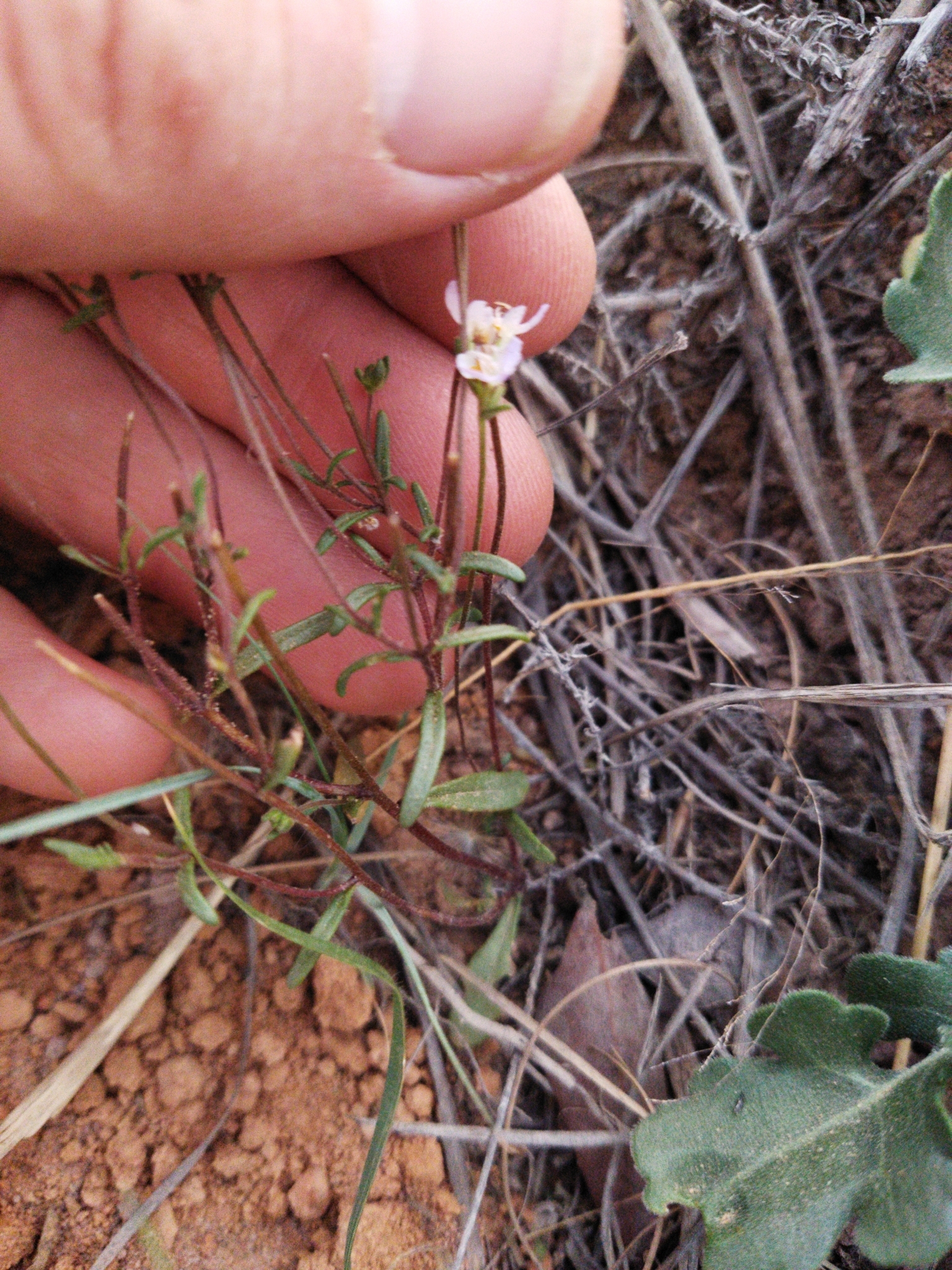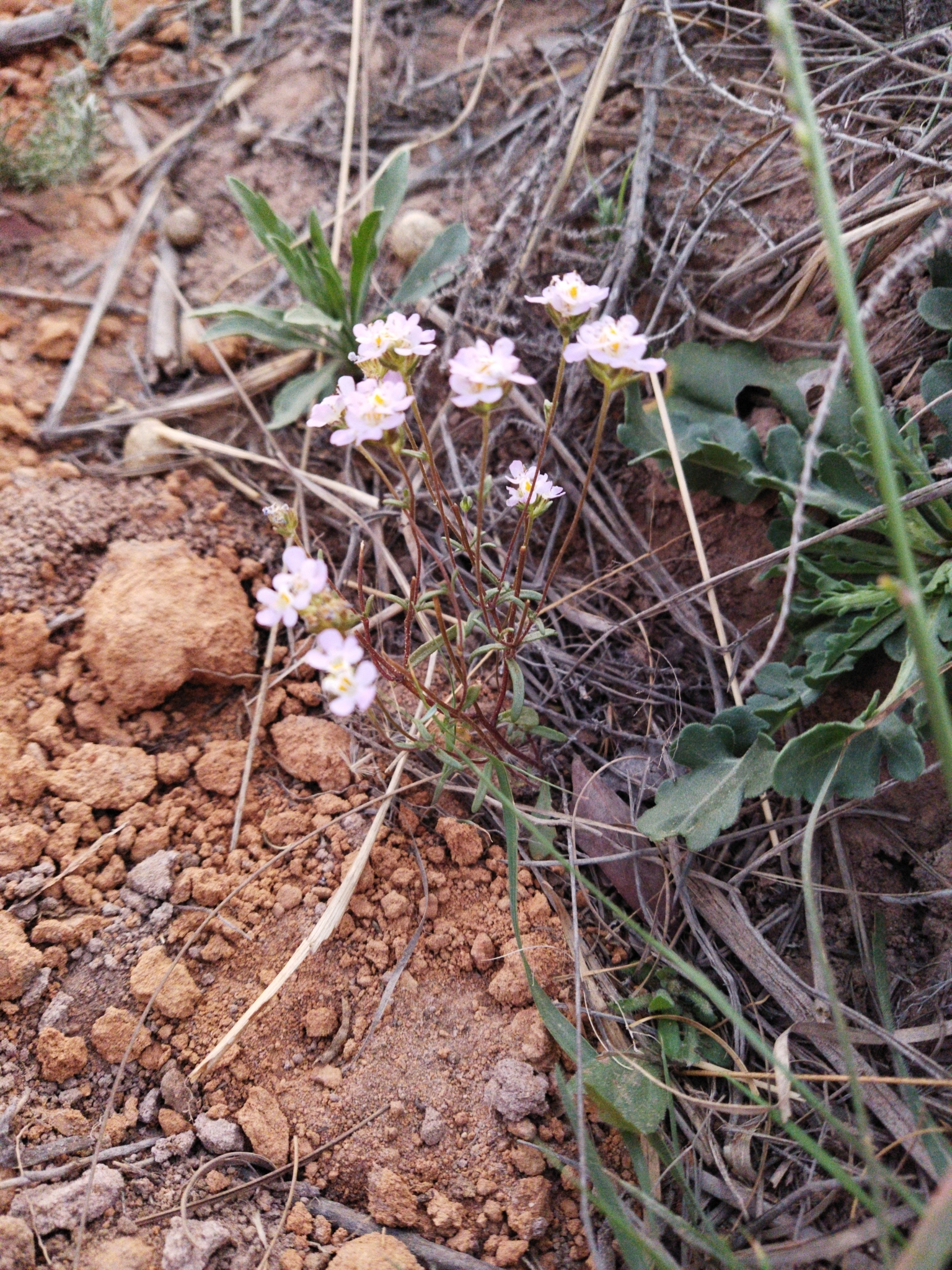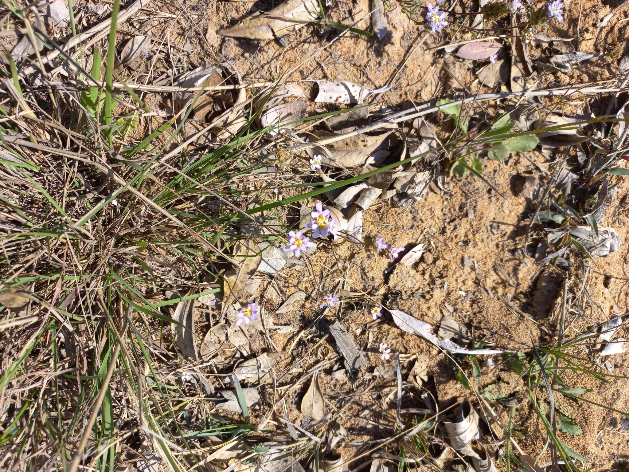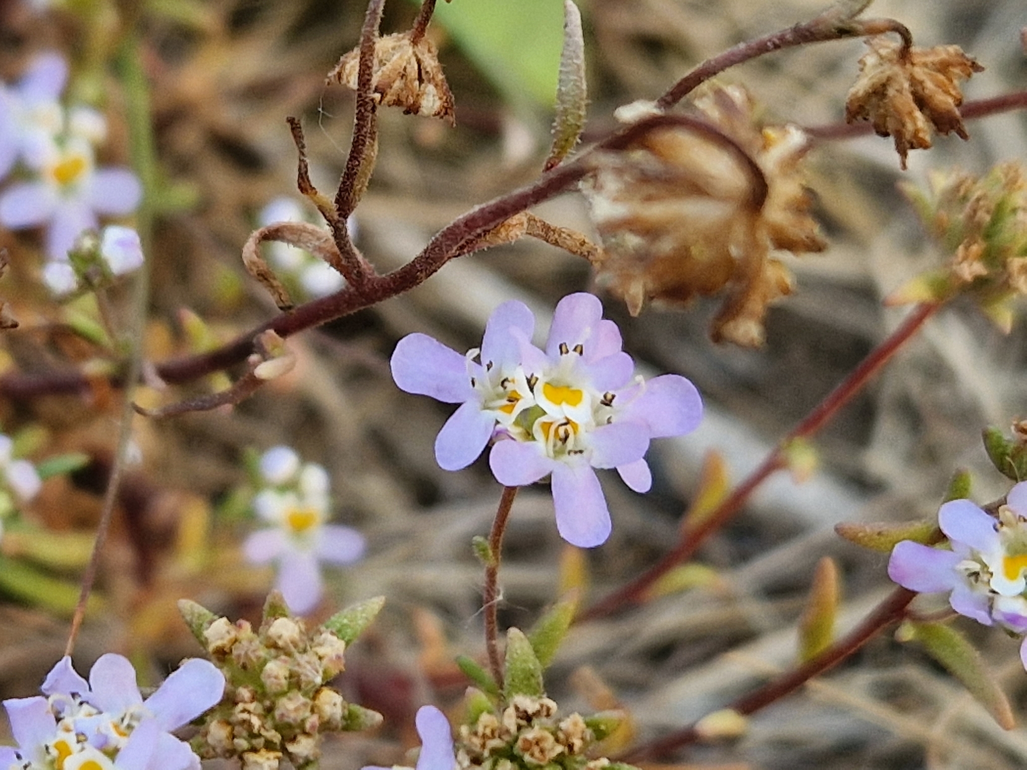 Annual herb, stems c. 40-250 mm long, up to 2.5 mm diam. at base, simple to branching from the base and above, erect or decumbent, leafy, glandular-puberulous particularly on the upper parts, pubescent throughout with eglandular hairs up to 0.5-1 mm long, obtuse, usually more or less retrorse. Leaves opposite, often becoming alternate on the inflorescence branches, blade of radical leaves (which are often wanting) c. 4-13 x 2-6 mm, elliptic, tapering to a flat petiolar part c. 3-8 mm long, from about half as long to about equalling the blade; primary stem leaves c. 7-30 x 0.5-4 mm, linear-oblong to oblanceolate, often with axillary tufts of smaller leaves, margins entire to toothed (2-5 pairs of teeth in the upper half) particularly in the larger leaves, upper surface with coarse tapering eglandular hairs up to 0.6-1mm long, mostly along the margins and on the lower half of the blade, lower surface glandular-puberulous, eglandular hairs confined to midrib. Flowers many in crowded rounded heads terminating all the branch-lets, which are nude towards the tips, the heads elongating in fruit and sometimes becoming very lax. Bracts at base of racemes (2-)4-12 x (0.5-)1-1.75 mm, smaller upwards, linear to oblong-lanceolate, adnate to pedicel only or to extreme base of calyx as well, glandular-puberulous all over, eglandular hairs as well, mainly on margins, up to 0.5-1 mm long. Pedicels up to 0.5-1.5 mm long. Calyx bilabiate, tube 1-1.6 mm long, anticous lobe 1.5-2.5 x 0.5-0.8 mm, anticous lip split 1-1.8 mm, posticous lobes narrower and more deeply separated, whole calyx glandular-puberulous with longer eglandular hairs on margins. Corolla tube 2.54 x 0.75-1.2 mm, widening slightly in throat, limb 4-6 mm across the lateral lobes, posticous lobes 0.75-1.75 x 0.75-1.6 mm, anticous lobe 2-3 x 1-2 mm, all lobes elliptic, posticous lip bearded, hairs sometimes extending to the anticous lobes, orange patch at base of posticous lip or lower half of posticous lobes orange, rest of limb blue or mauve, perhaps sometimes creamy-coloured. Stamens 4, anthers 0.6-0.8 mm long, dark-coloured, all well exserted. Stigma well exserted. Capsules 2.5-3 x 2-2.5 mm Seeds many in each loculus, 0.25-0.5 mm long. Flowering has been recorded between March and October with most records (14 out of 21 collections seen) in August and September. From: Hilliard, OM. 1994. The Manuleae: a tribe of Scrophulariaceae. Edinburgh University Press, Edinburgh. [All rights reserved]