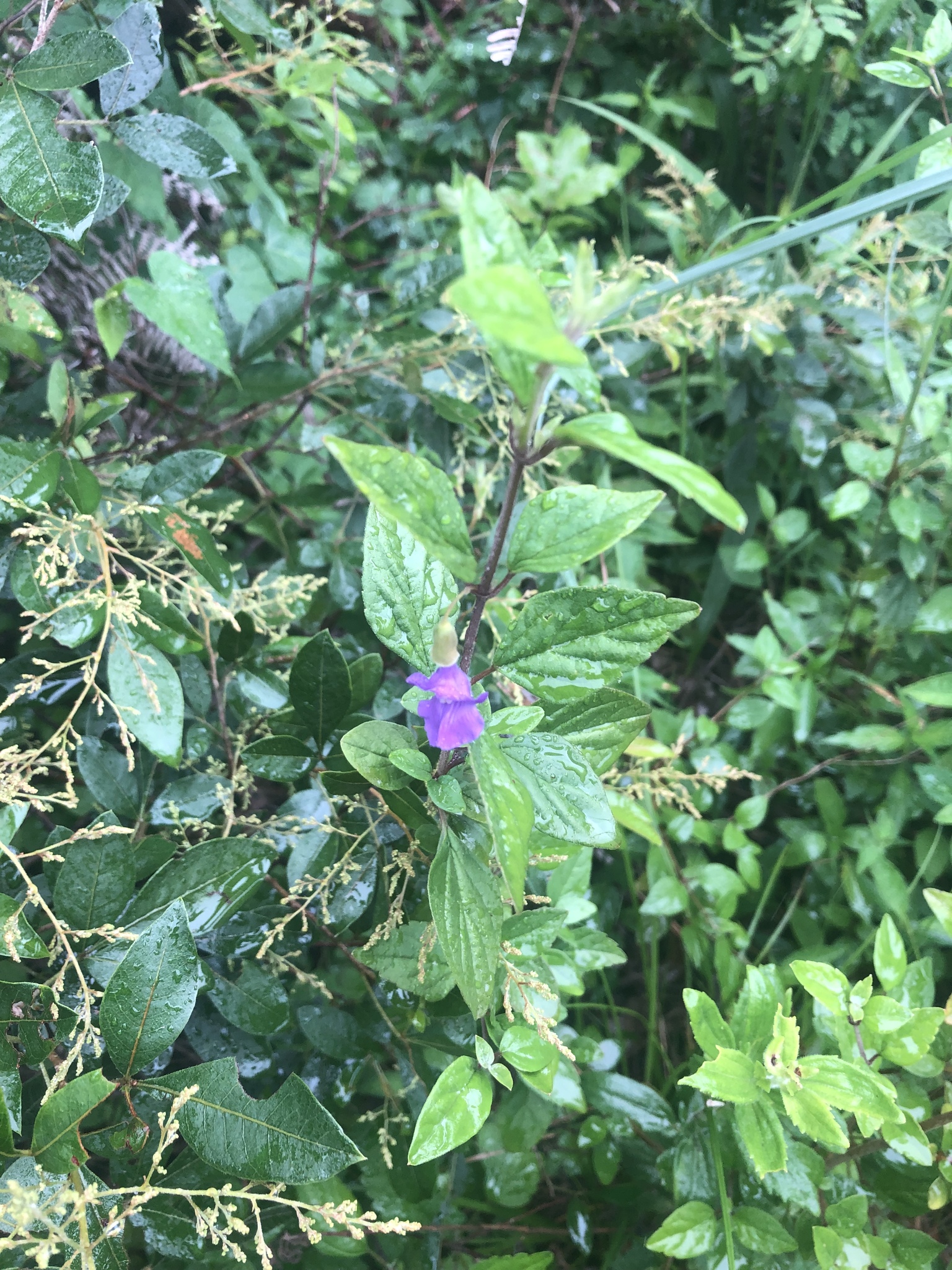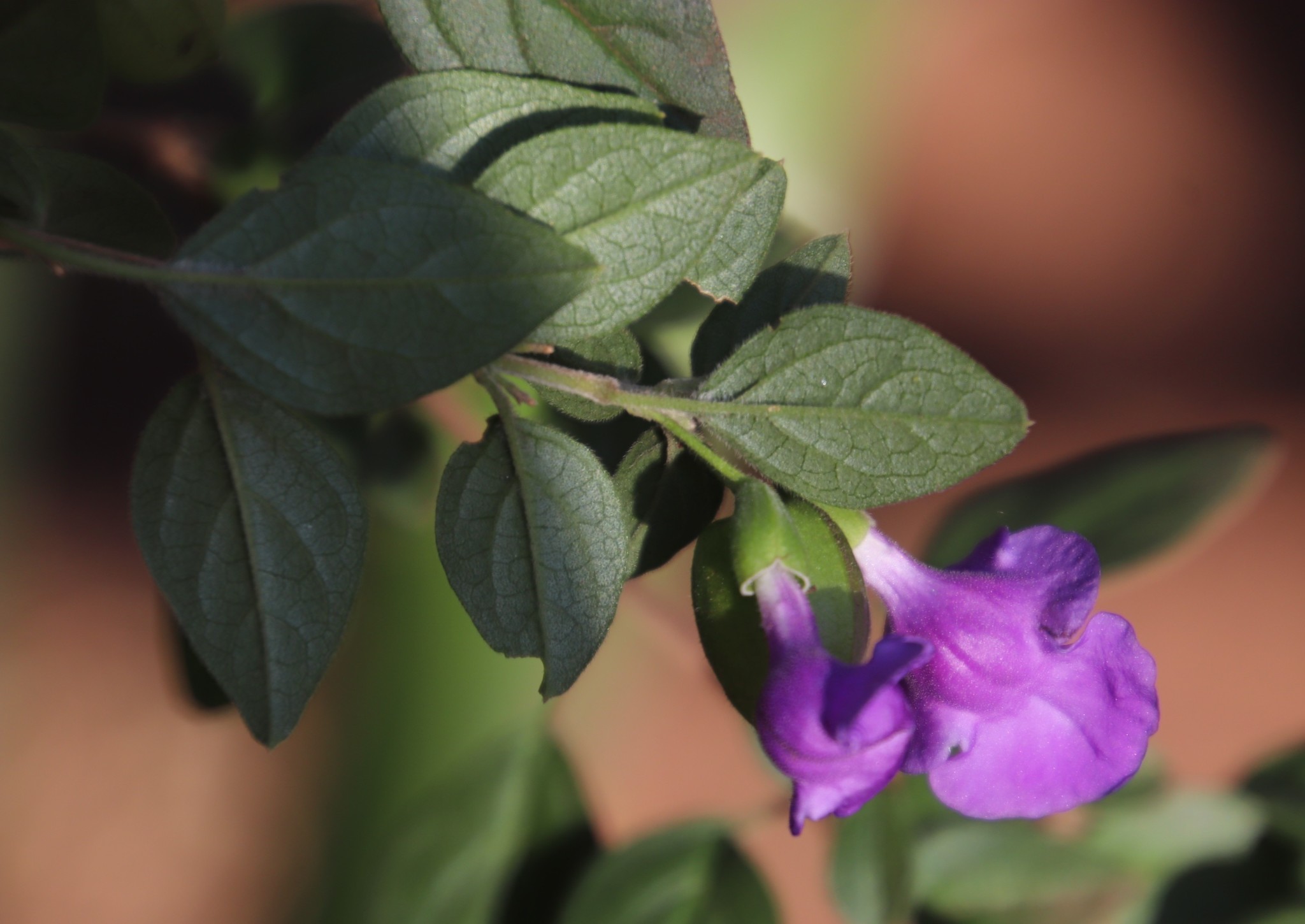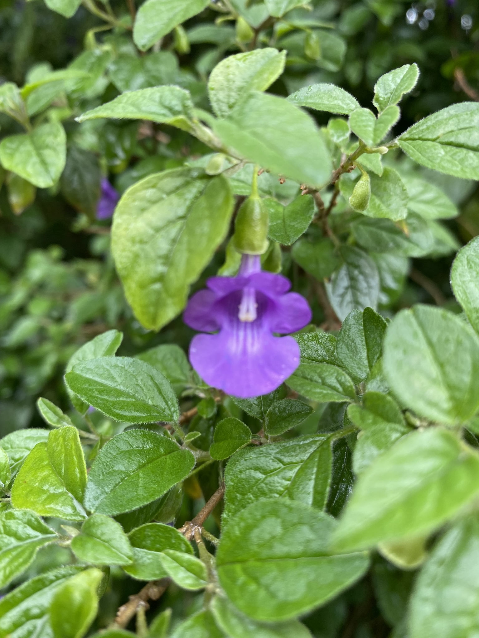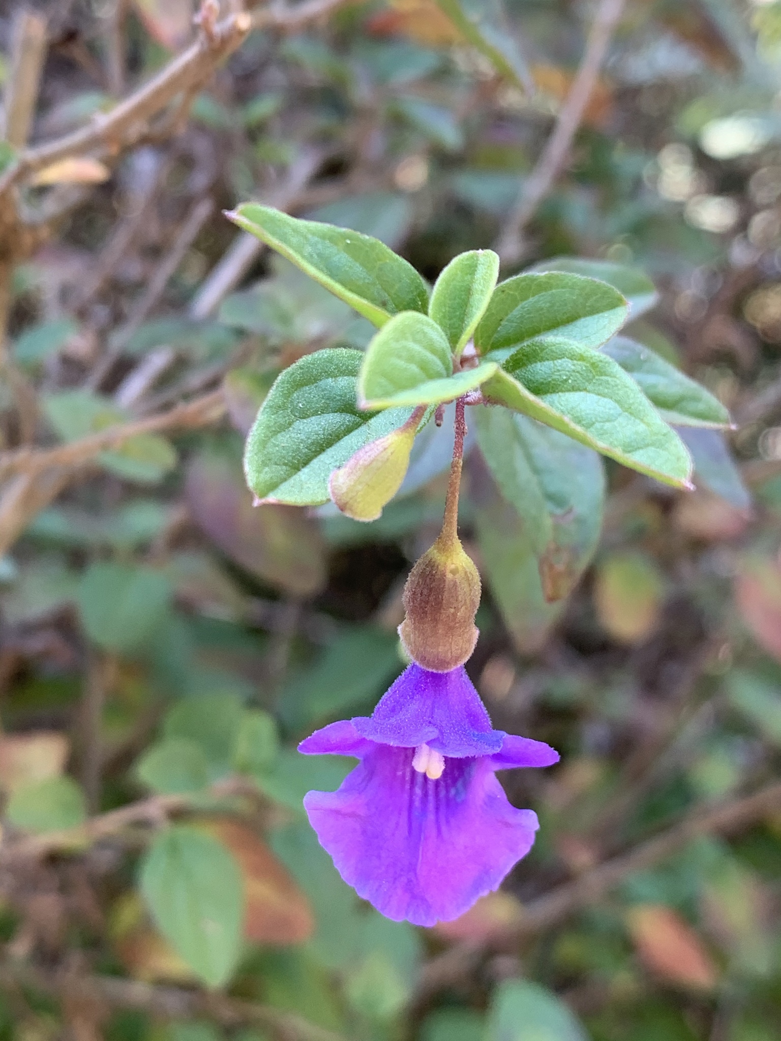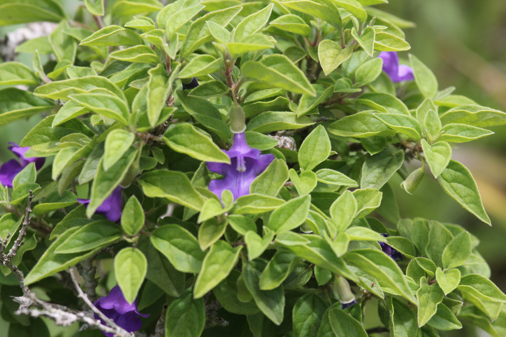 Shrub 2.8-4 m tall, freely branched; branchlets sericeous. Leaves petiolate, soft; blade ovate-lanceolate to broadly ovate, 20-45 x 12-25 mm, sparingly to densely pubescent, freely gland-dotted on both surfaces, apex acute to subobtuse, base obtuse, margin entire or occasionally with a few weak teeth; petiole 7-17 mm long. Inflorescence terminal or on short side shoots, of few to several spaced verticils; verticils 1-2-flowered; pedicels 8-10 mm long with a pair of minute bracteoles below the middle. Calyx enlarging to 15 mm long, membranous, lips 3-4 mm long. Corolla mauve to violet, 22-27 mm long, sparsely pubescent without; tube 12-15 mm long, 2 mm broad at the base; upper lip 2-3 mm long, about 5 mm broad; lower lip 10-12 mm long, 12-14 mm broad. Nutlets, excluding the wing, 6 mm long, glabrous; wing broadly elliptical, about 8 x 7 mm. From: Codd, LEW. 1985. Lamiaceae: 3. Tinnea. In: OA Leistner (ed.). Fl. S. Africa 28(4): 13-15. Botanical Research Institute, Department of Agriculture and Water Supply, Pretoria. [http://www.biodiversitylibrary.org/item/209555#page/9/mode/1up] [CC BY]