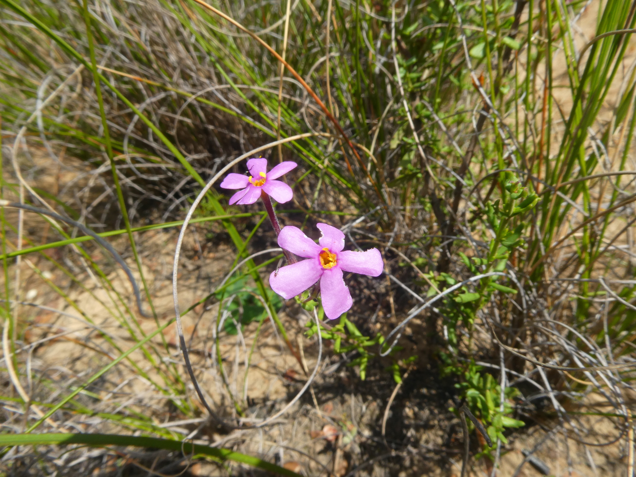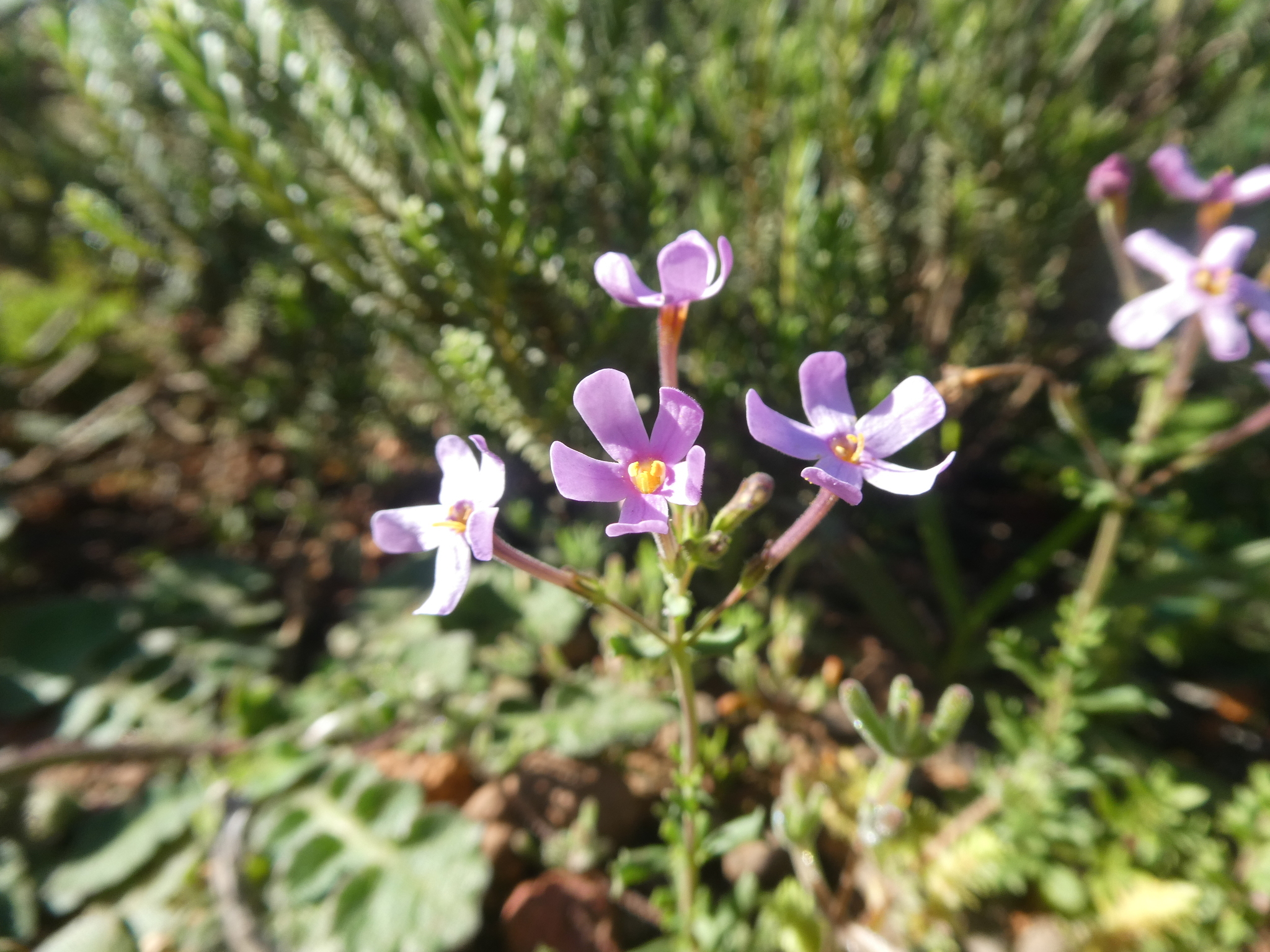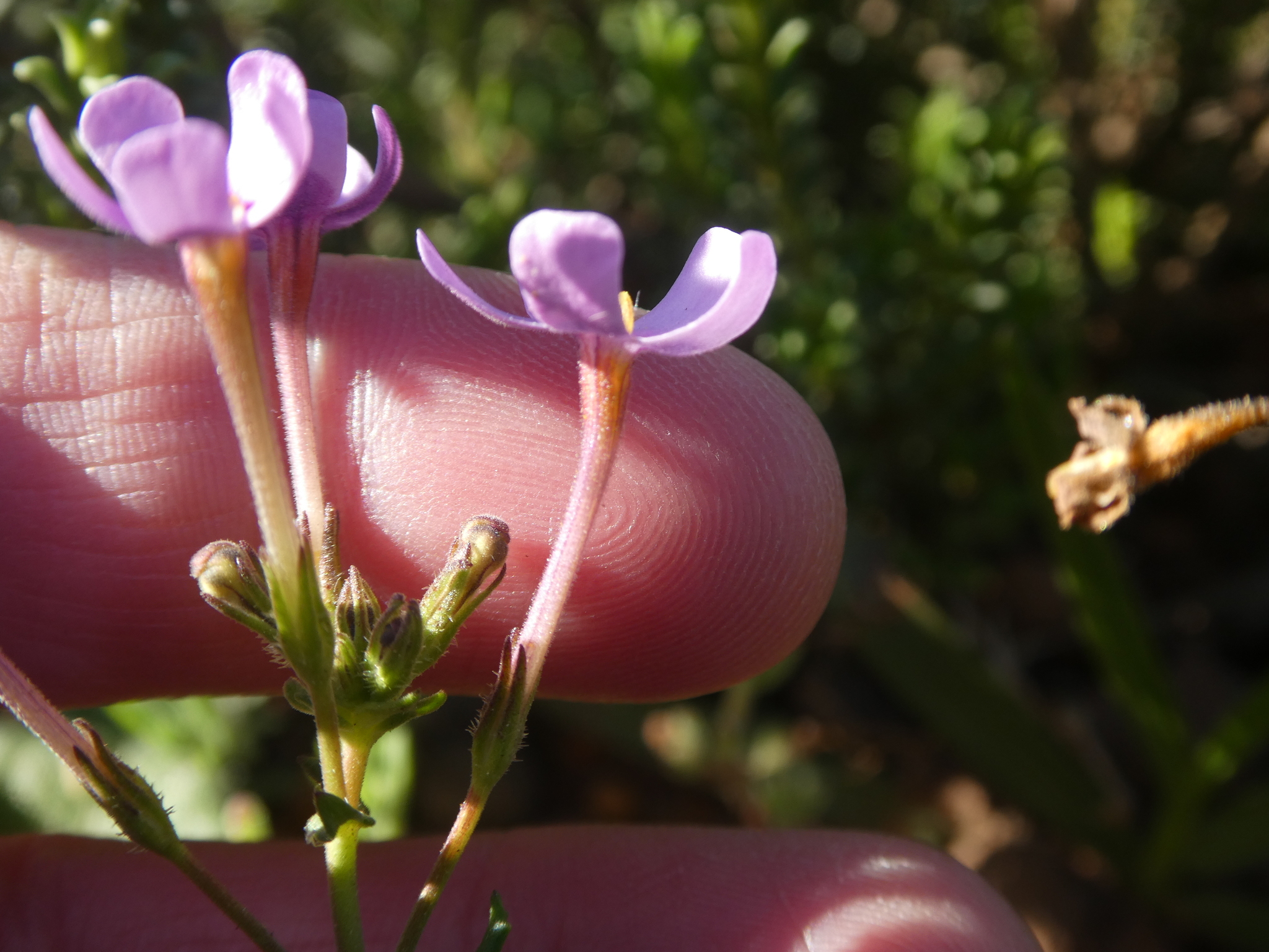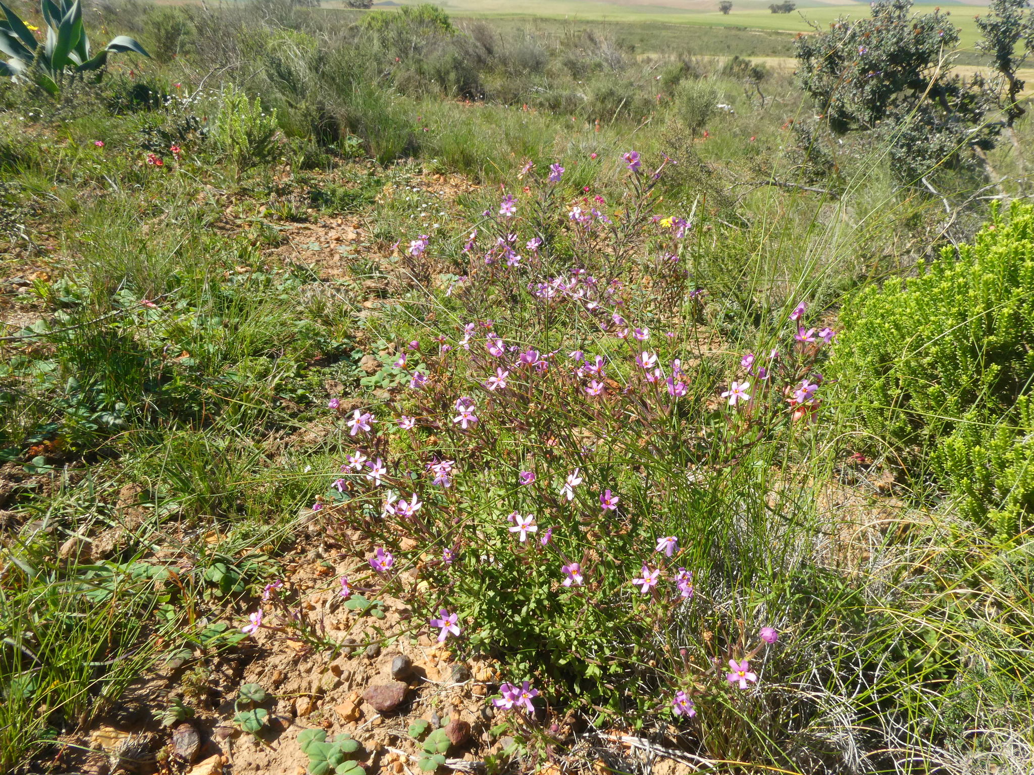 General notes: Shaly clay ground with short scattered renosterbos. Local group of scattered annuals. Tube purple/mauve, lobes white with long deep purple markings.