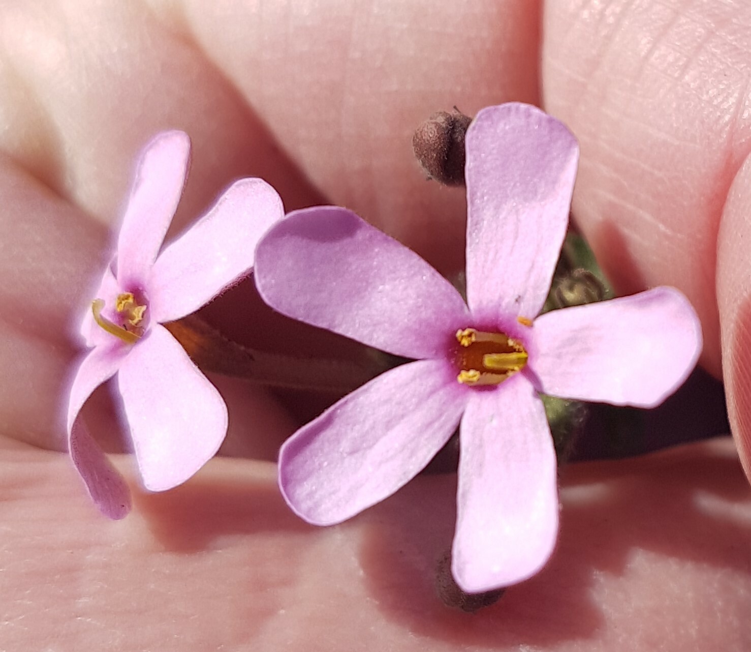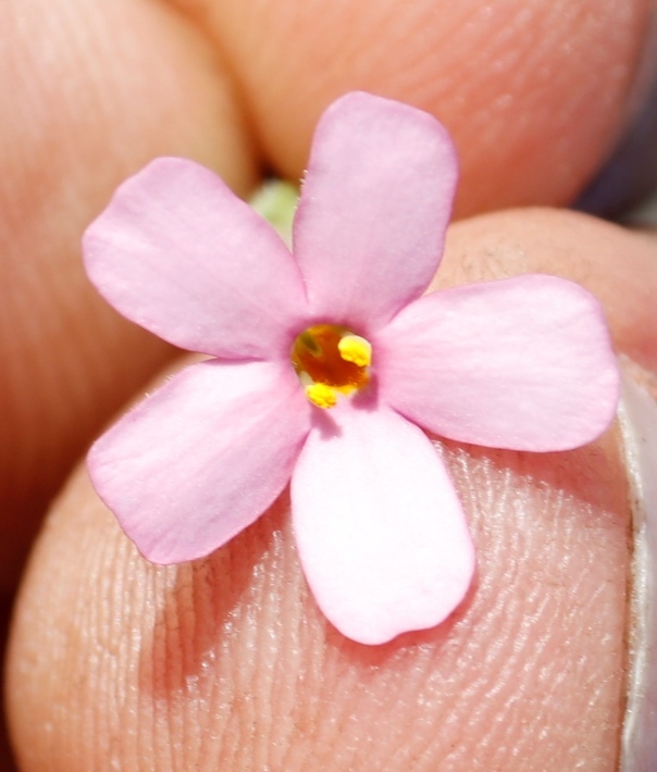 Twiggy shrublet, many-stemmed from crown of thick woody stock, branches erect or decumbent, up to 150-300 mm long, main ones c. 2-4 mm in diam. at base, either weakly ridged by prominent vascular strands running up into the leaf bases or ± terete, glandular-puberulous, often with scattered ± hispid hairs as well, these up to c. 0.5-1 mm long, closely leafy on upper parts, brachyblasts present. Leaves opposite, largest primary leaves 6-20 x 1.5-5 mm, oblanceolate or narrowly cuneate, acute to subobtuse, base narrowed to a short petiolar part then abruptly expanded, half-clasping, ± connate, margins strongly to weakly revolute, usually with 1-2(-3) pairs of prominent teeth, smaller leaves sometimes entire, or teeth hidden by revolute margins, sometimes minutely glandular-puberulous on petiolar part, lower surface gland-dotted, otherwise leaf glabrous or with scattered ± hispid hairs up to c. 0.2-1 mm long, these hairs sometimes reduced to tiny scabrid projections. Flowers up to c. 16 in short terminal racemes, solitary in the axils of bracts or the lowermost pair in the axils of the uppermost pair of leaves. Bracts (lowermost) or uppermost pair of leaves c. 3-10 x 1.5-3.5 mm, lanceolate, otherwise leaf-like. Pedicels (lowermost) 4-20 mm long. Calyx bilabiate, tube 1.2-2.2 mm long, posticous lobes 3.6-5 x 0.6-1.1 mm, anticous lobes slightly broader, minutely glandular-puberulous with scattered coarse hairs as well up to 0.5-1 mm long. Corolla tube 10-19.5 x 3 mm in throat, narrowly funnel-shaped, limb almost regular, 10-14 mm across, posticous lobes 3.5-6.5 x 2-3 mm, anticous lobe 4.2-6.5 x 2.2-3.2 mm, all oblong-elliptic, shades of pink or violet, rarely white, throat yellow/orange, glandular-pubescent outside, hairs up to 0.2-0.3 mm long, a few glistening glands as well, clavate hairs inside throat arranged in 5 longitudinal bands. Stamens 4, anticous pair shortly exserted, filaments 1.7-2.5 mm long, posticous pair included, filaments 1-1.5 mm long, anthers 0.8-1.6 mm long. Stigma 2.5-4 mm long, exserted. Style 8-15 mm long. Ovary 1.4-1.8 x 0.8-1 mm, either glabrous or with a few glistening glands on the sutures. Capsules c. 4-6 x 2-2.5 mm. Seeds c. 0.5-0.8 x 0.3-0.4 mm, grey-blue or pallid. From: Hilliard, OM. 1994. The Manuleae: a tribe of Scrophulariaceae. Edinburgh University Press, Edinburgh. [All rights reserved] As: Sutera aethiopica (L.) Kuntze