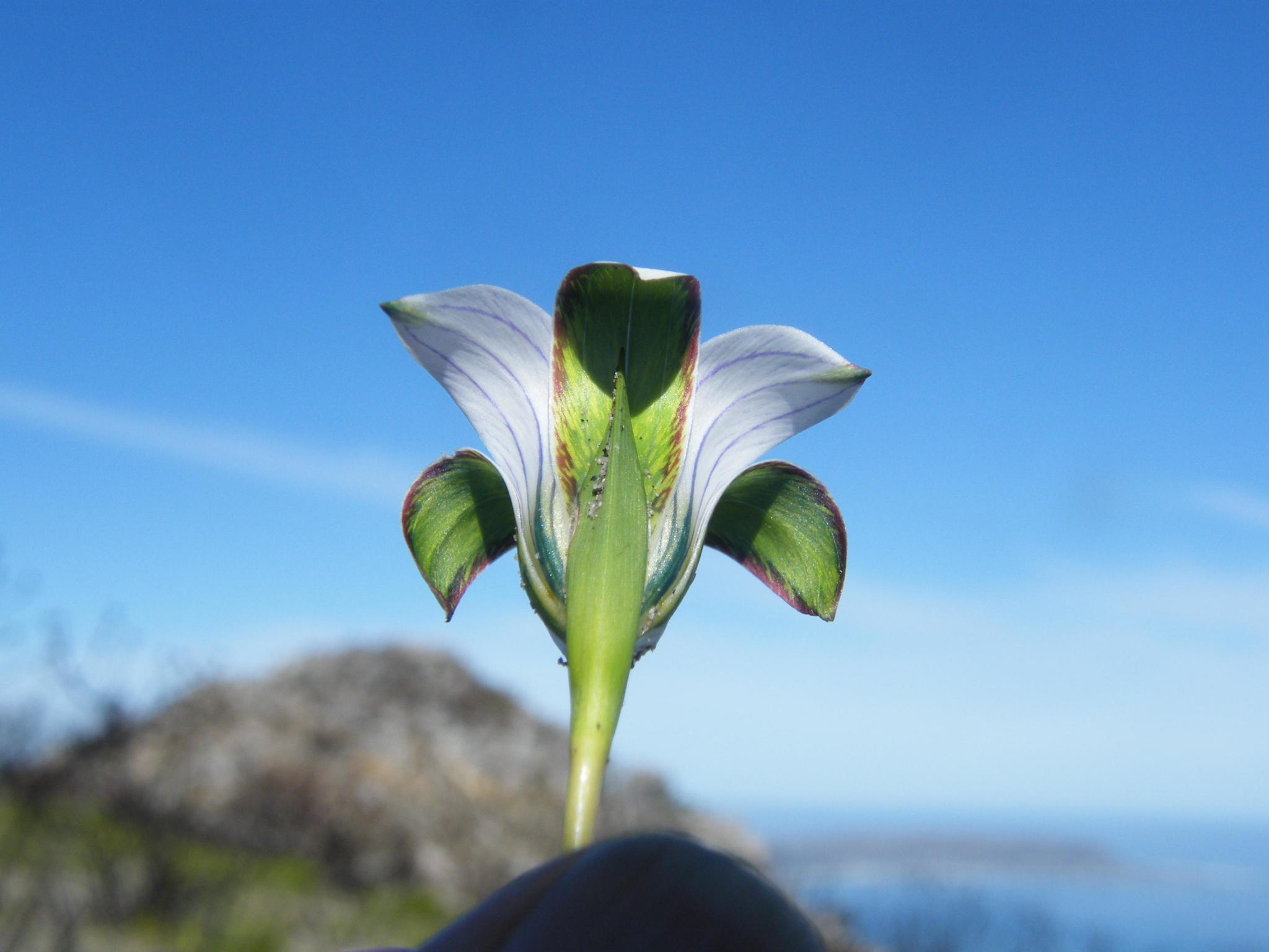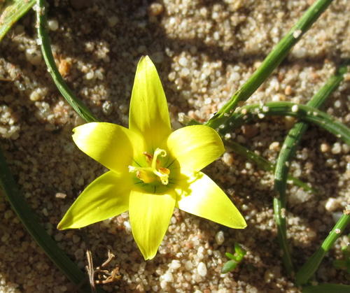 General notes: In loose, sandy loam soil. Leaves green, flowers yellow. Outside of three inner tepals with green stripes near the base. Inside of three inner tepals a silver-grey colour with brownish tints. Partidges like burrowing for the bulbs. Not too abundant.