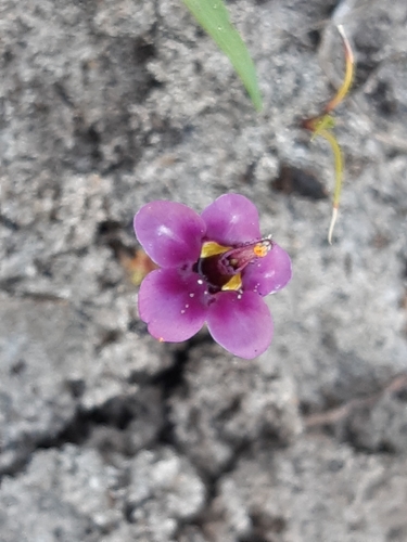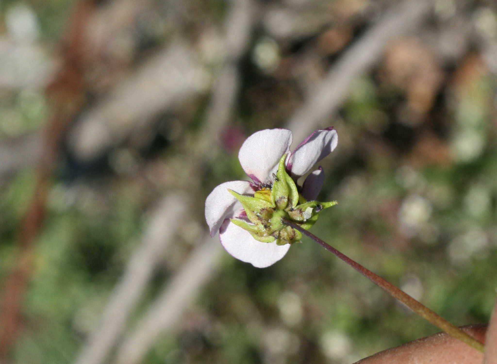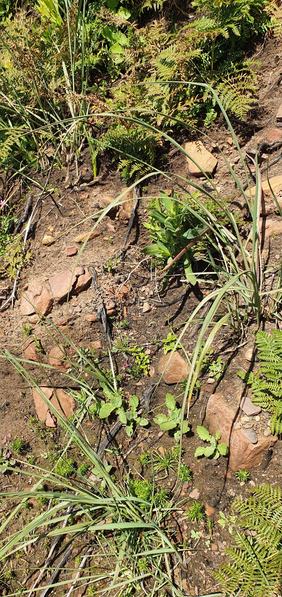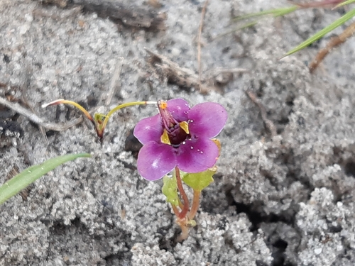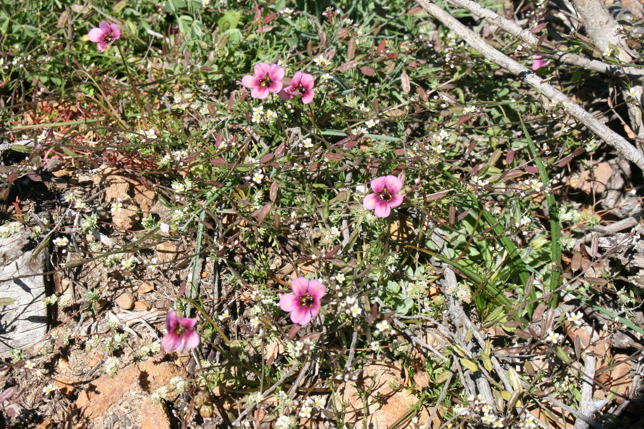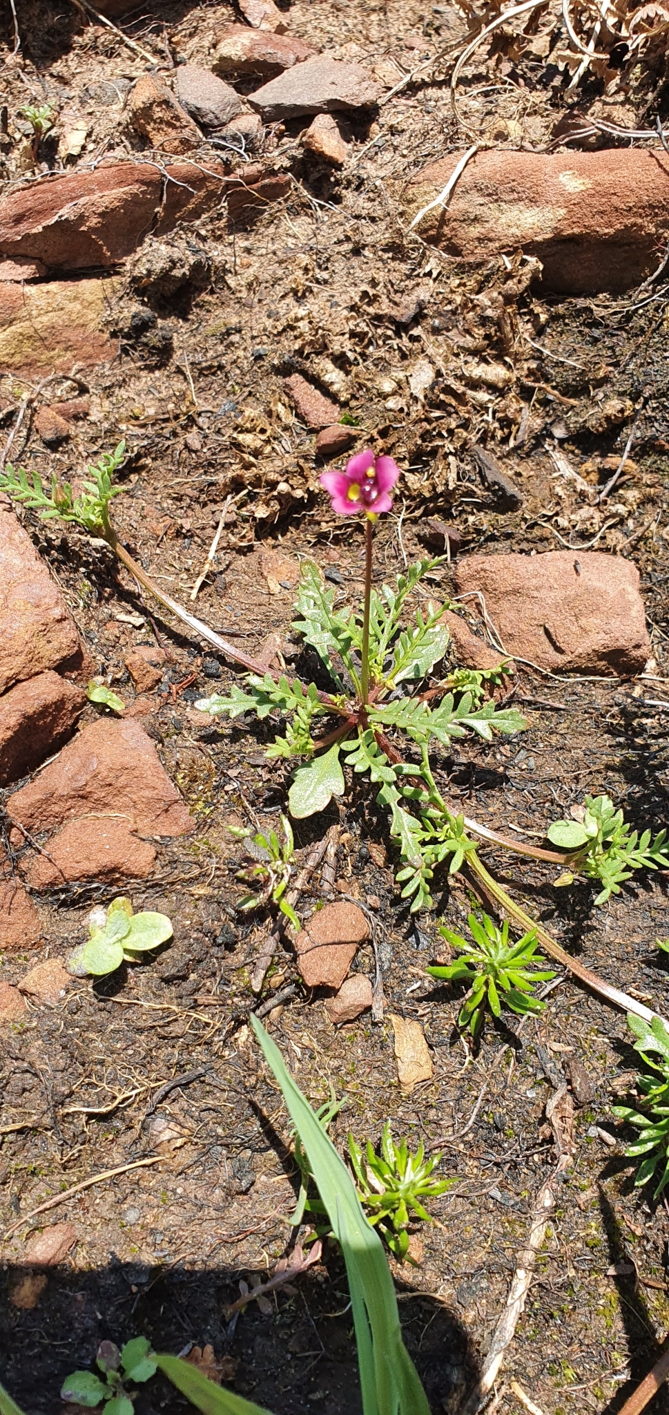 General notes: Grassland biome. Gentle, mountain slope. Well-drained, loam, rocky soil. Sandstone. Partial shade. S aspect. No biotic effect seen. Herb. Flowers pink. Plant height 0.1 m. Uncommon. Sandstone ledges.
