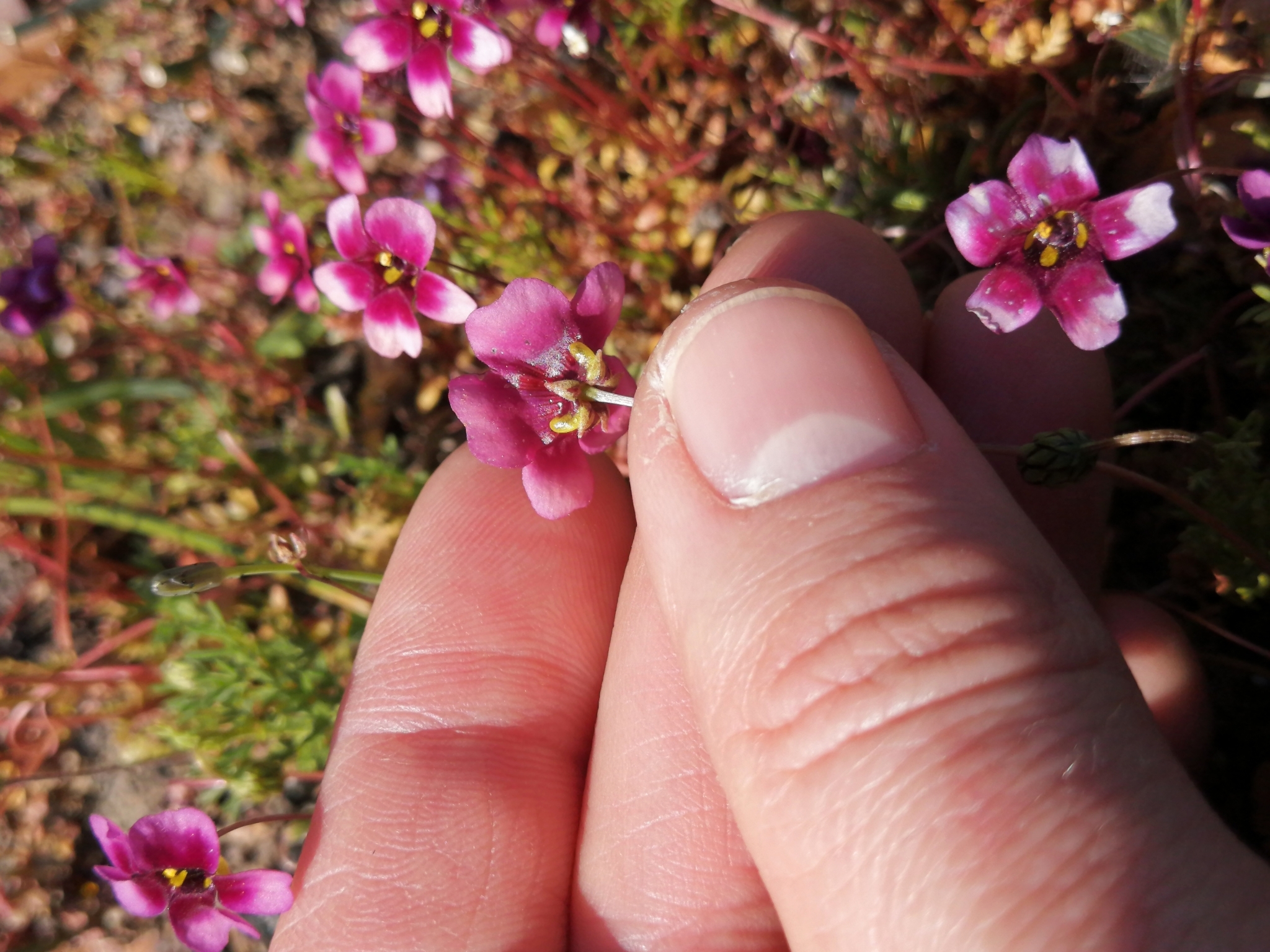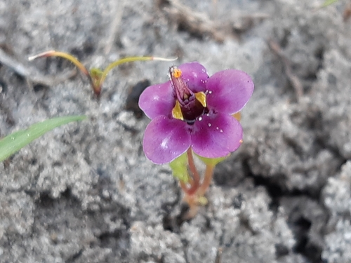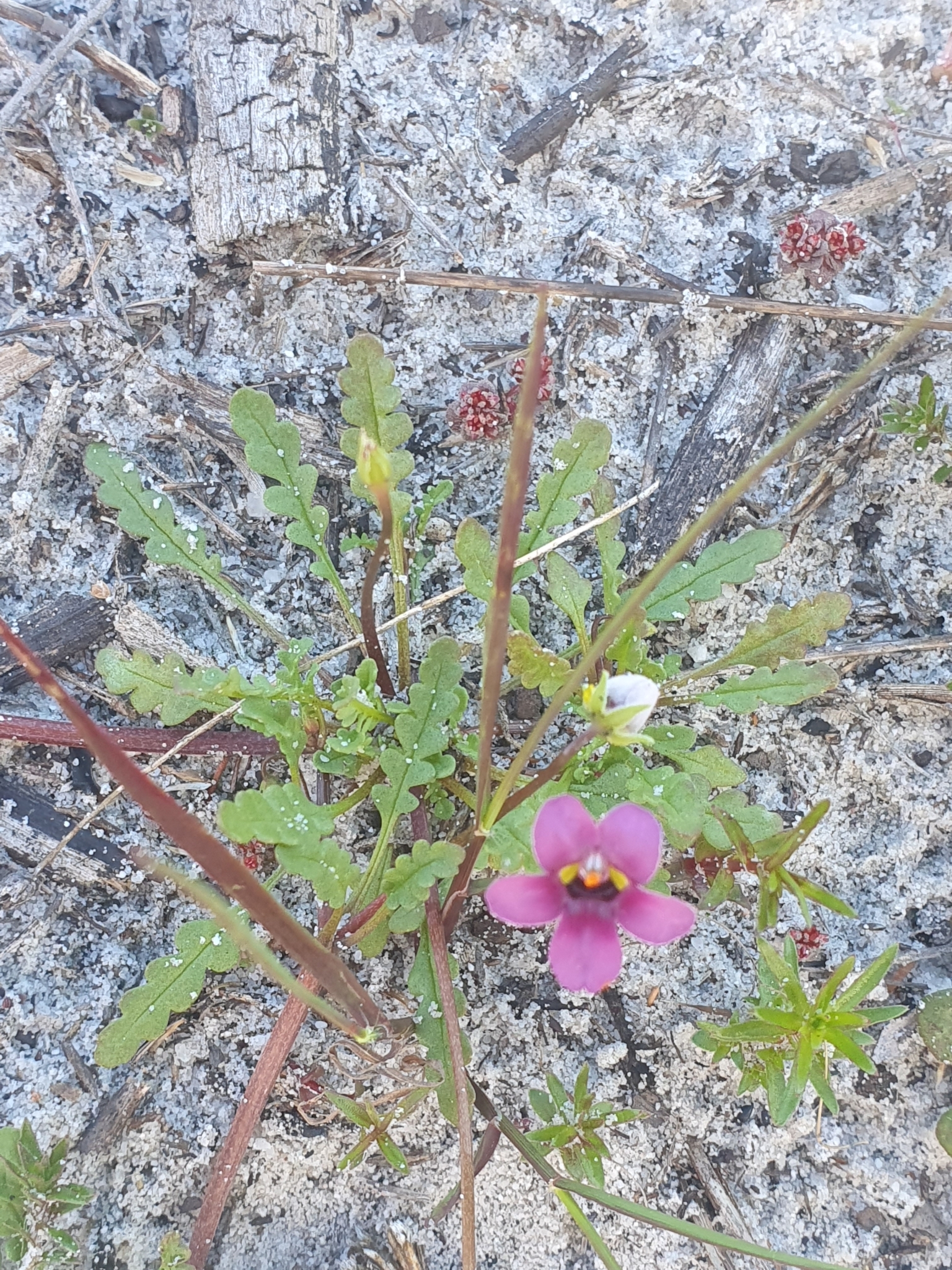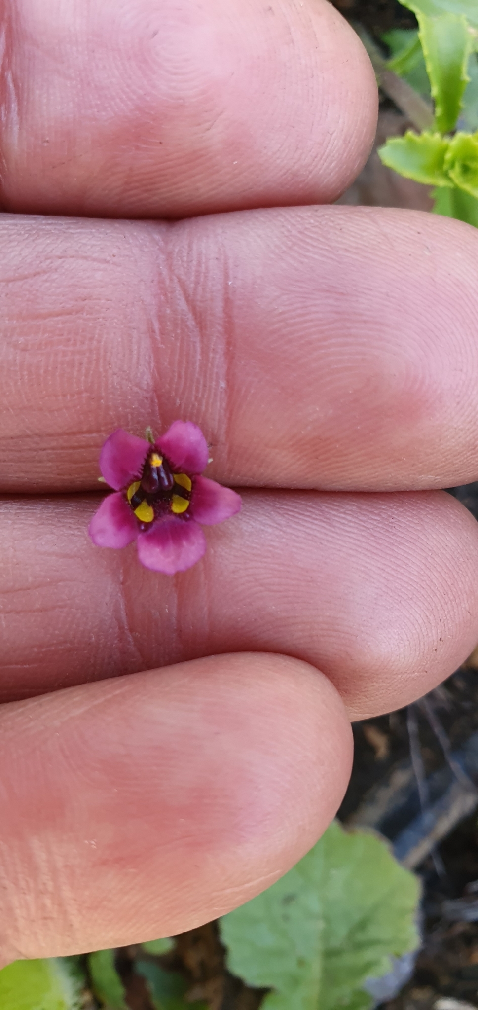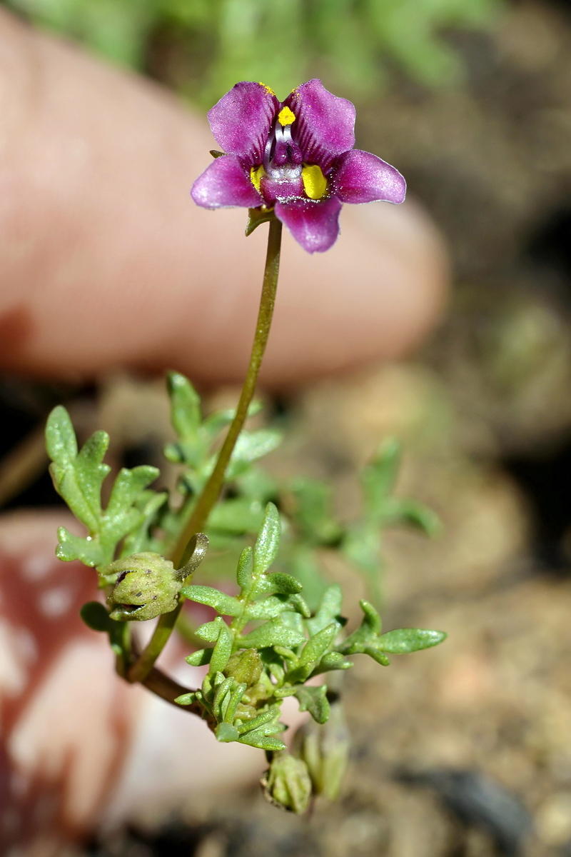An annual herb, diffuse, glabrous or minutely glandular-puberulous, simple or branched chiefly at the base; stem or branches prostrate, decumbent or ascending, 25-305 mm [as '1-12 in.'] long; radical leaves rosulate, oblanceolate, obtuse at the apex, wedge-shaped at the base, pinnatifid or pinnati-partite or occasionally dentate-sinuate, 0.34-1 in. long, 0.125-0.334 in. broad; lobes ovate or oblong and obtuse; petioles ranging up to 0.75 in. long; upper leaves opposite or alternate, rather smaller and on gradually shorter petioles; peduncles axillary especially to the upper leaves, occasionally subradical, solitary, 1-flowered, exceeding the leaves, 0.5-2.5 in. long, erect or ascending; calyx-segments ovate-lanceolate and lanceolate, acute or subacute, ciliate with short whitish hairs, 0.1-0.167 in. long; corolla dark purple or rosy, sparingly pubescent outside 0.25-0.5 in. wide, with two small yellow pouches or pits; stamens all fertile, glabrous; filaments all glabrous, filiform, not appendaged, not dilated at the base; capsule obliquely ovoid, glabrous or minutely glandular, 0.167-0.334 in. long, 0.125-0.167 in. broad; seeds obliquely ellipsoidal, 0.042 in. long, deeply furrowed longitudinally. From: Hiern, WP. 1904. XCV. Scrophulariaceae. In: WT Thiselton-Dyer (ed.). Fl. Cap. (Harvey) 4(1-3): 121-420. Lovell Reeve & Co., London. [https://www.biodiversitylibrary.org/item/15241#page/129/mode/1up] [All rights reserved] As: Diascia nemophiloides Benth.