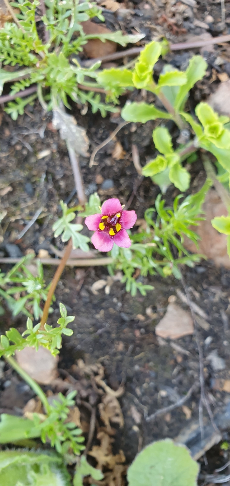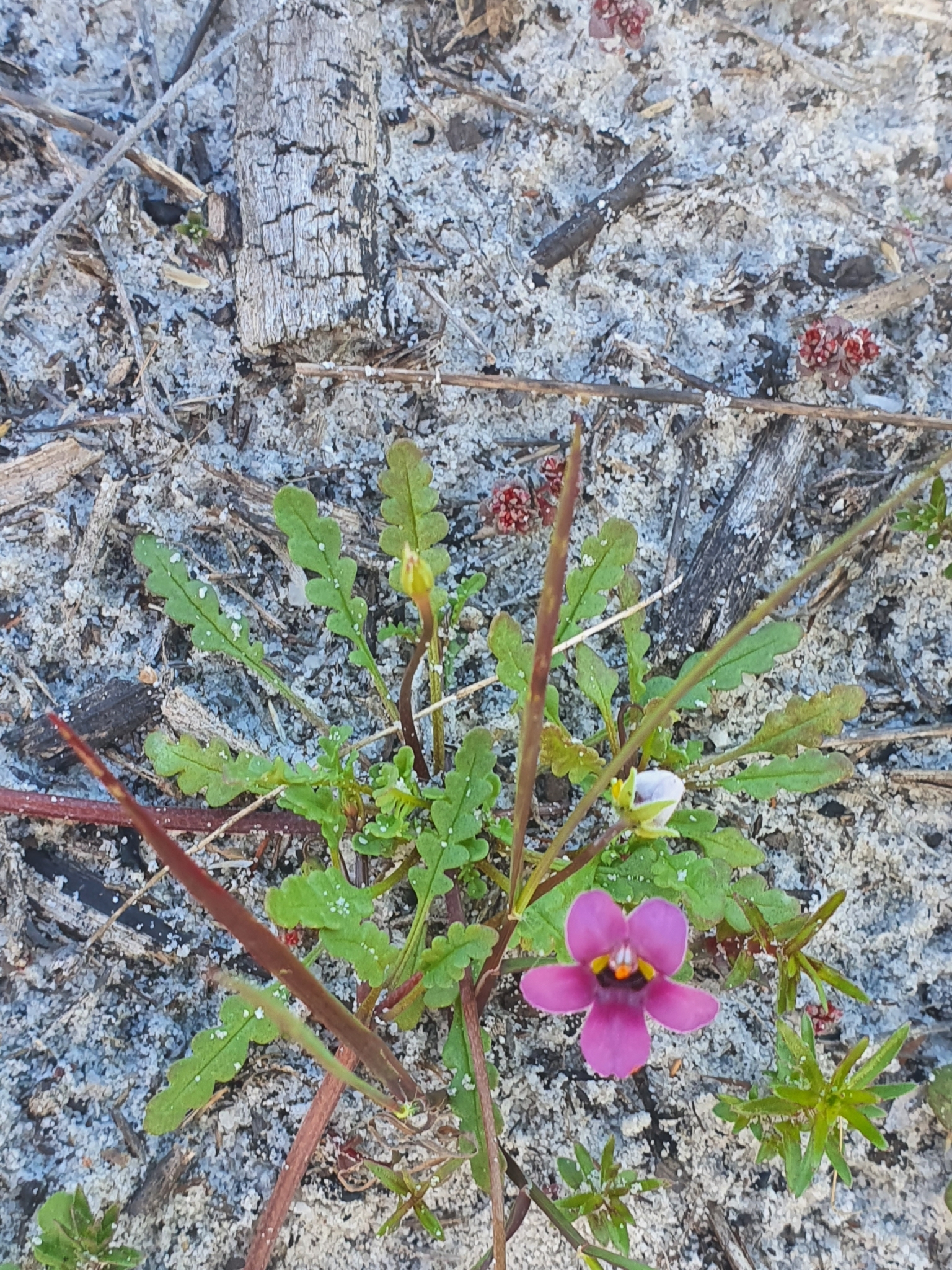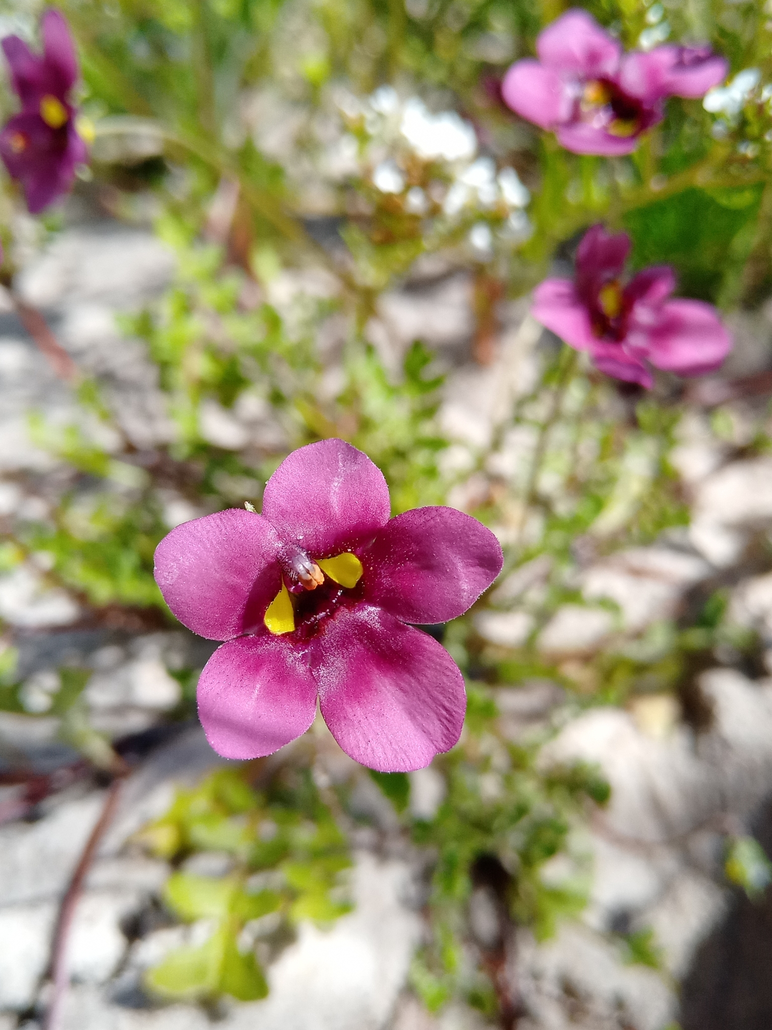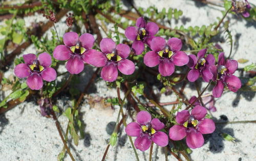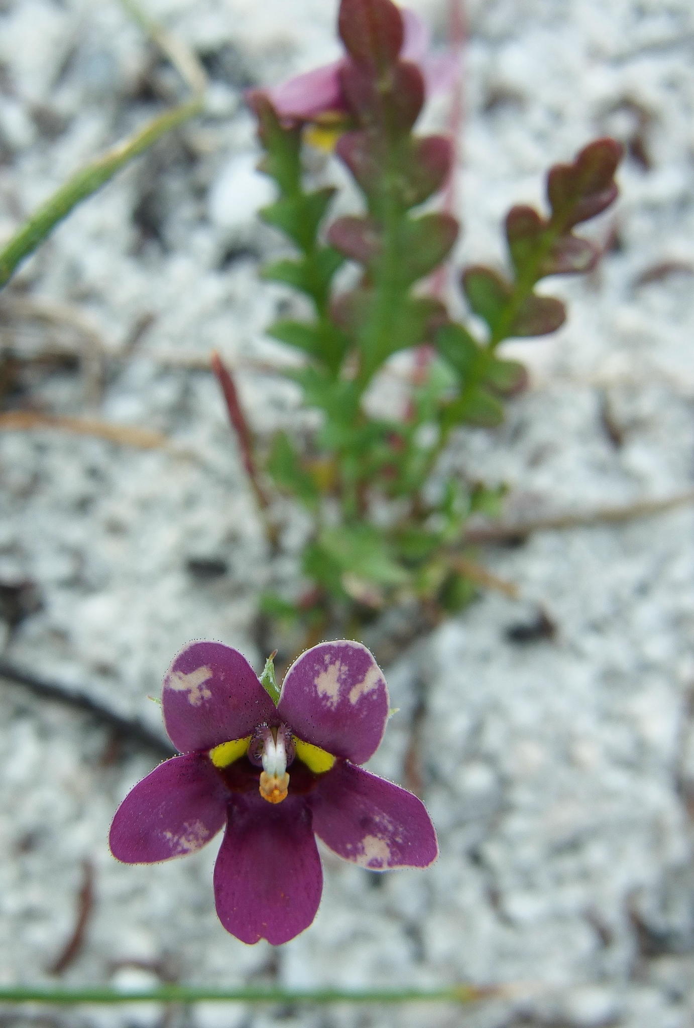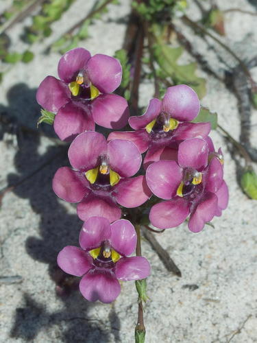Erect or decumbent annual to 35 cm. Leaves pinnatifid to pinnatisect. Flowers axillary, 2-saccate, greyish violet with dark magenta centre, yellow sacs and a yellow, stamen-bearing boss, limb 12-23 mm long, sacs ± 2.0-5.5 mm long, stamens and style strongly arching away from upper lip. Capsules ovate-falcate. From: Steiner, KE. 2012. Scrophulariaceae: Diascia Link & Otto. In: J Manning & P Goldblatt (eds), Plants of the Greater Cape Floristic Region 1: The Core Cape flora. Strelitzia 29: 736-739. South African National Biodiversity Institute, Pretoria. [CC BY]