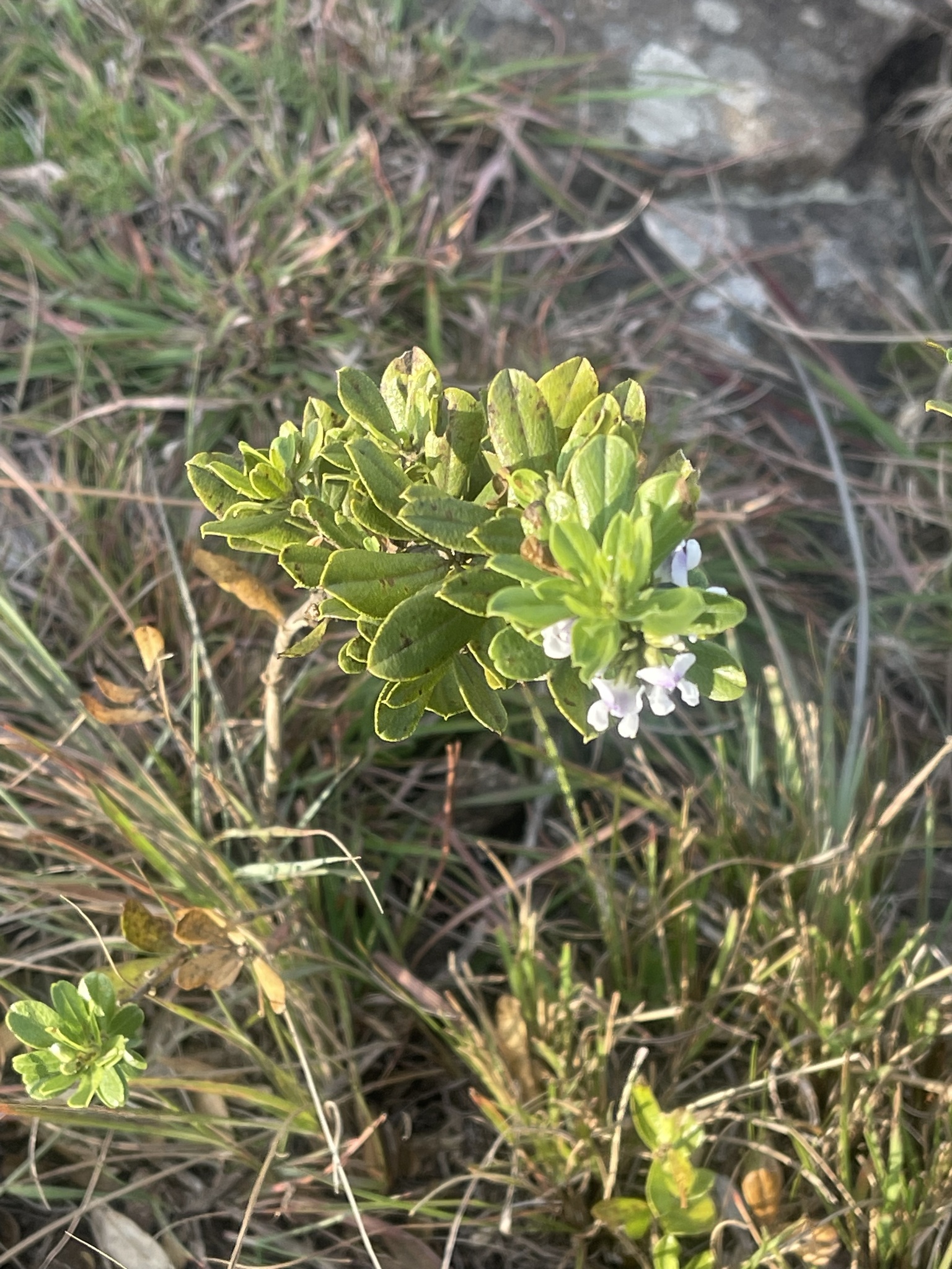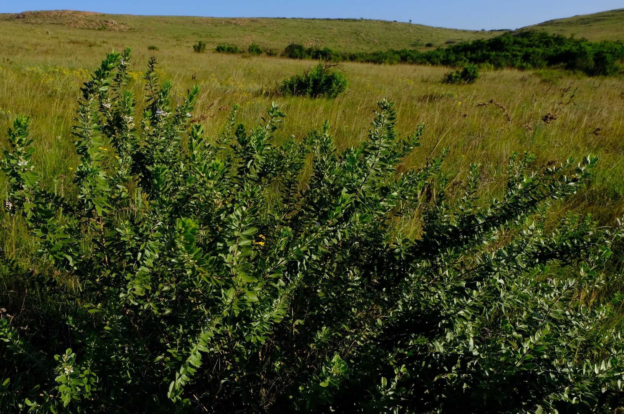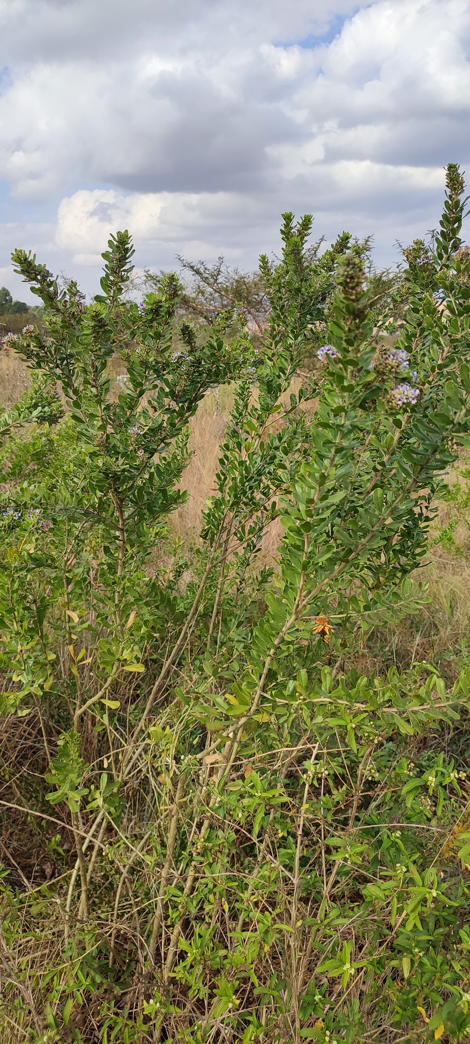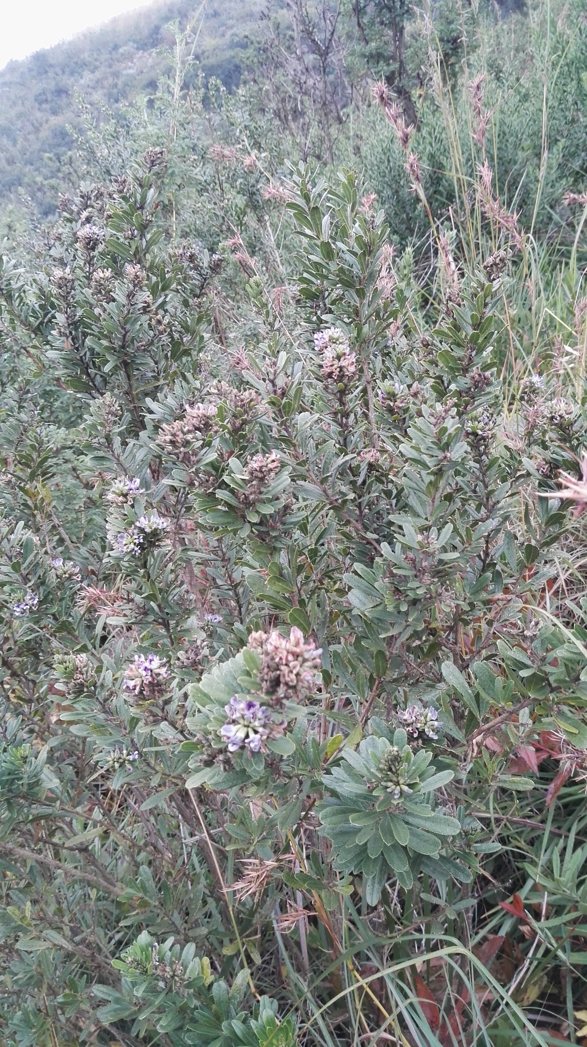 General notes: Grassland. Rocky grassland interspersed with woodland. Valley. Soil. Well drained. Sand. Quartzite. Partial shade. Gentle slope. NW aspect. Biotic effect: none seen. Bushy shrub with many branches/stems. ± 2 m tall. Light mauve flowers. Occasional.