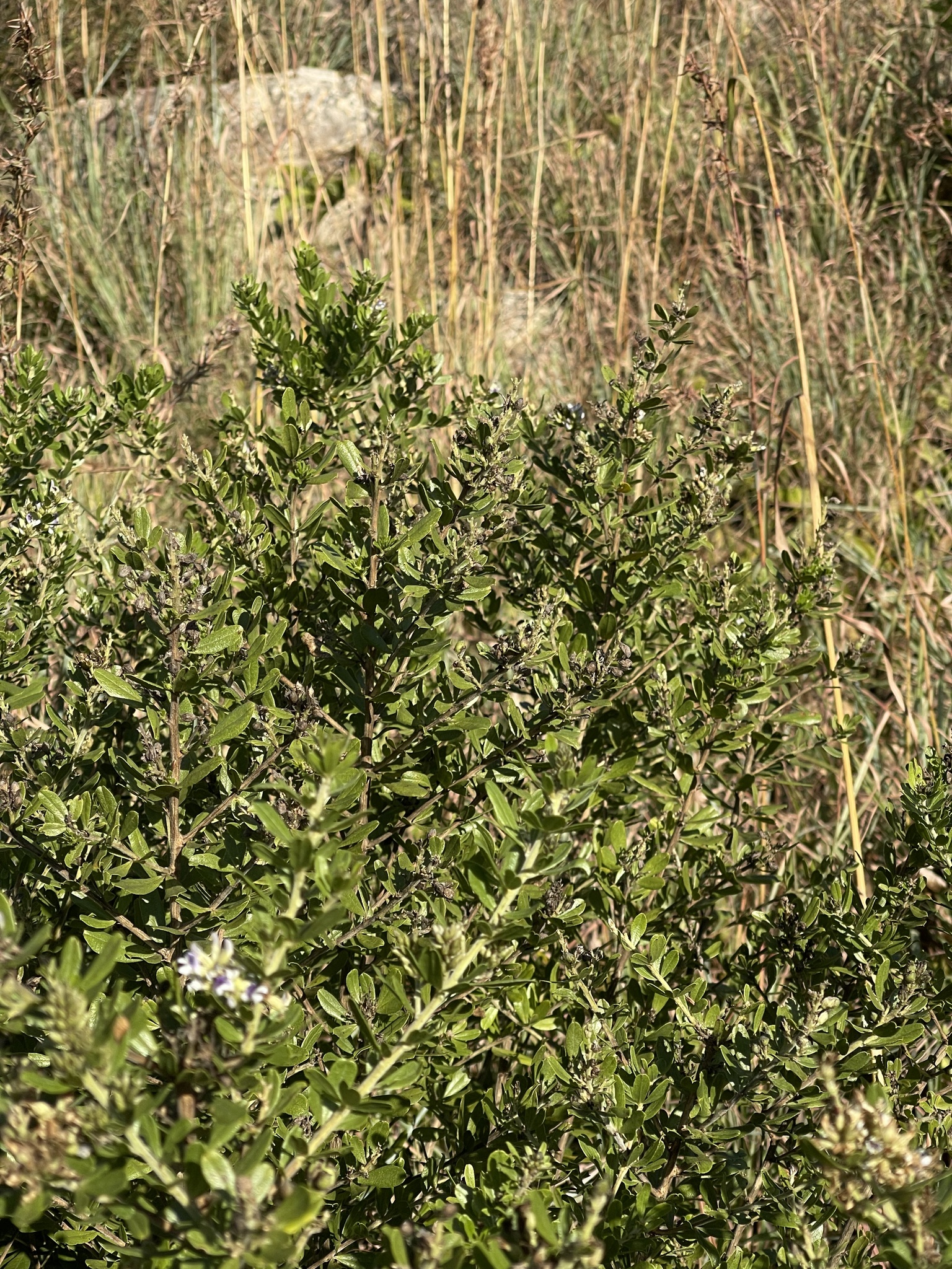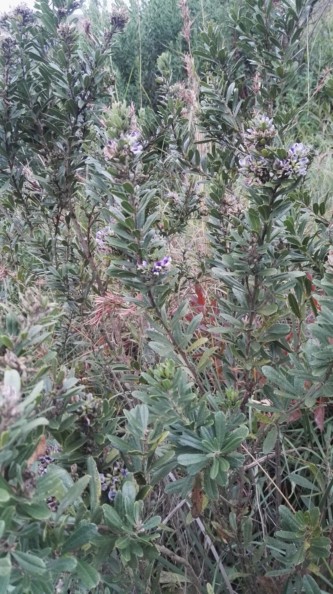 Perennial shrub, up to 3 m high. Leaves trifoliolate; leaflets narrowly obovate to narrowly obovate-ovate, recurved mucronate, black-dotted; lateral leaflets symmetrical. Flowers: in terminal and axillary spikes; peduncles up to 30 mm long; corolla white and purple or purplish blue; Oct.-May. From: Grobler, A; Retief, E; Meyer, NL. 2017. Fabaceae: Otholobium C.H.Stirt. In: E Retief & NL Meyer (eds), Plants of the Free State: Inventory and identification guide. Strelitzia 38: 553-553. South African National Biodiversity Institute, Pretoria. [CC BY] As: Otholobium wilmsii (Harms) C.H.Stirt.