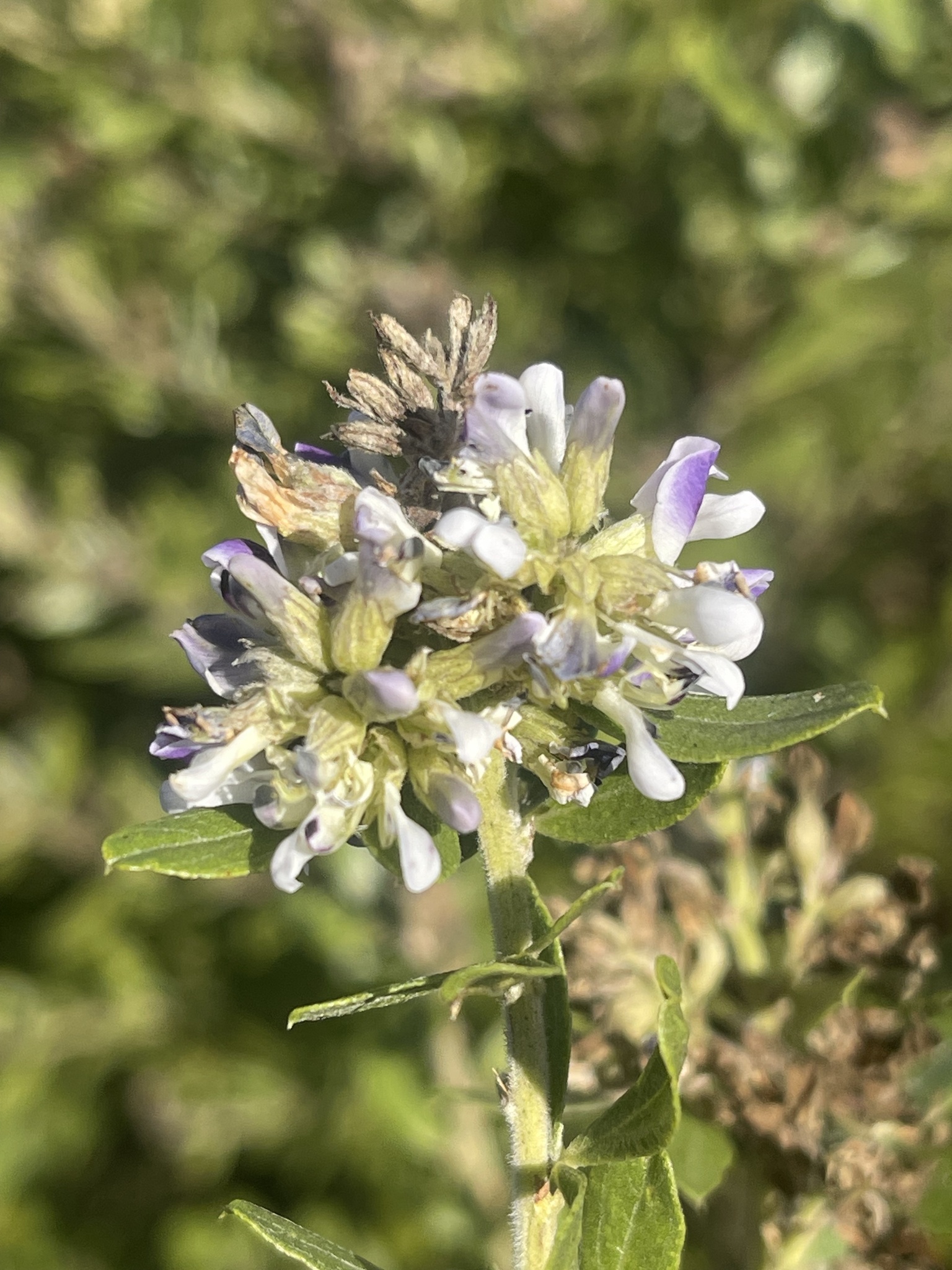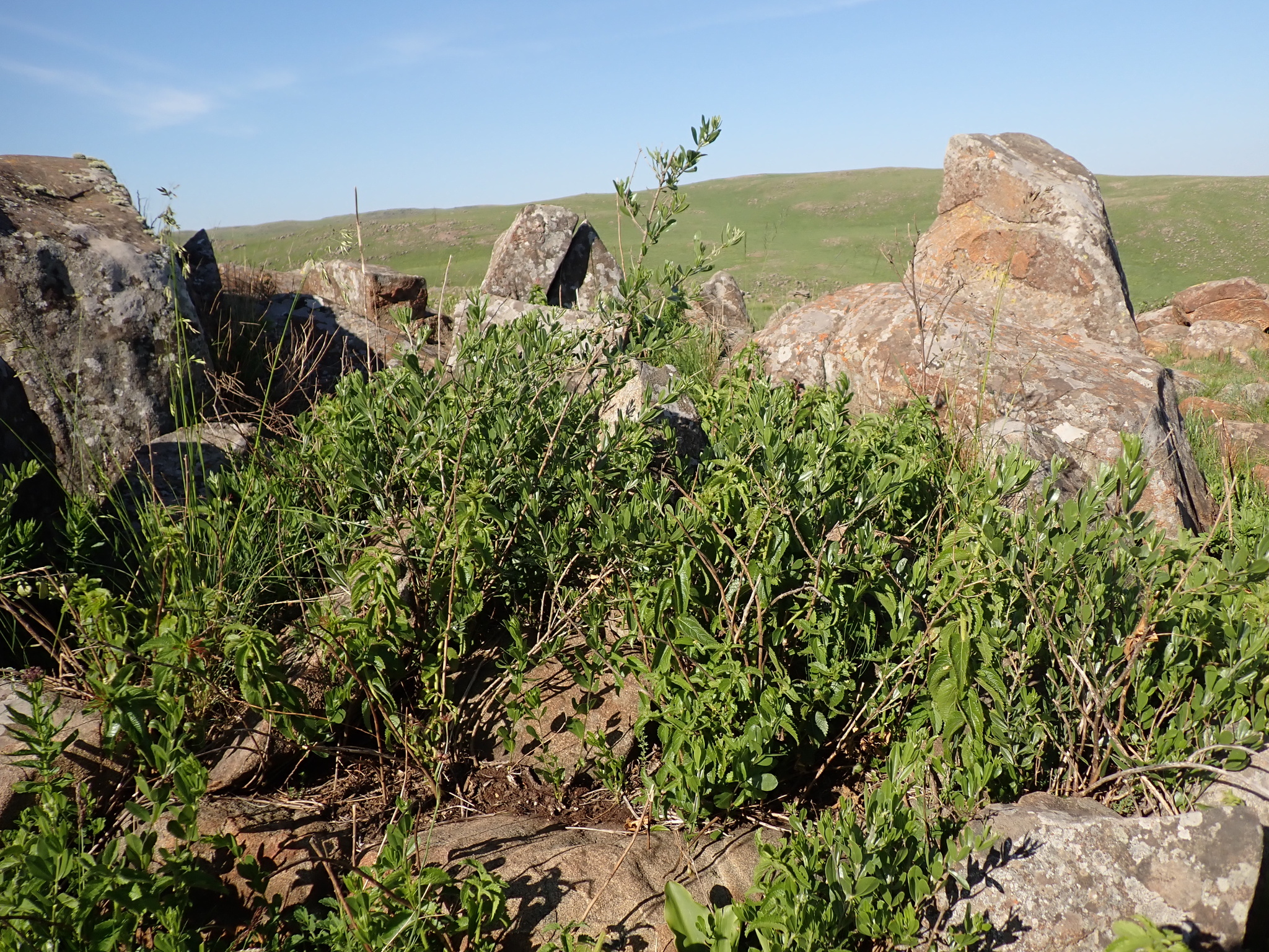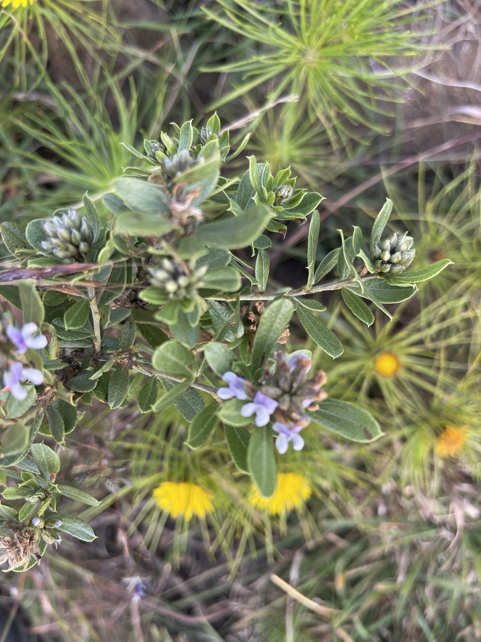 General notes: Grassland along stream. Rich loam soil. Moist. Quarternary deposits. Full sun. Level valley. Erect shrub 2.0 m tall. Purple and white flowers. Occasional.