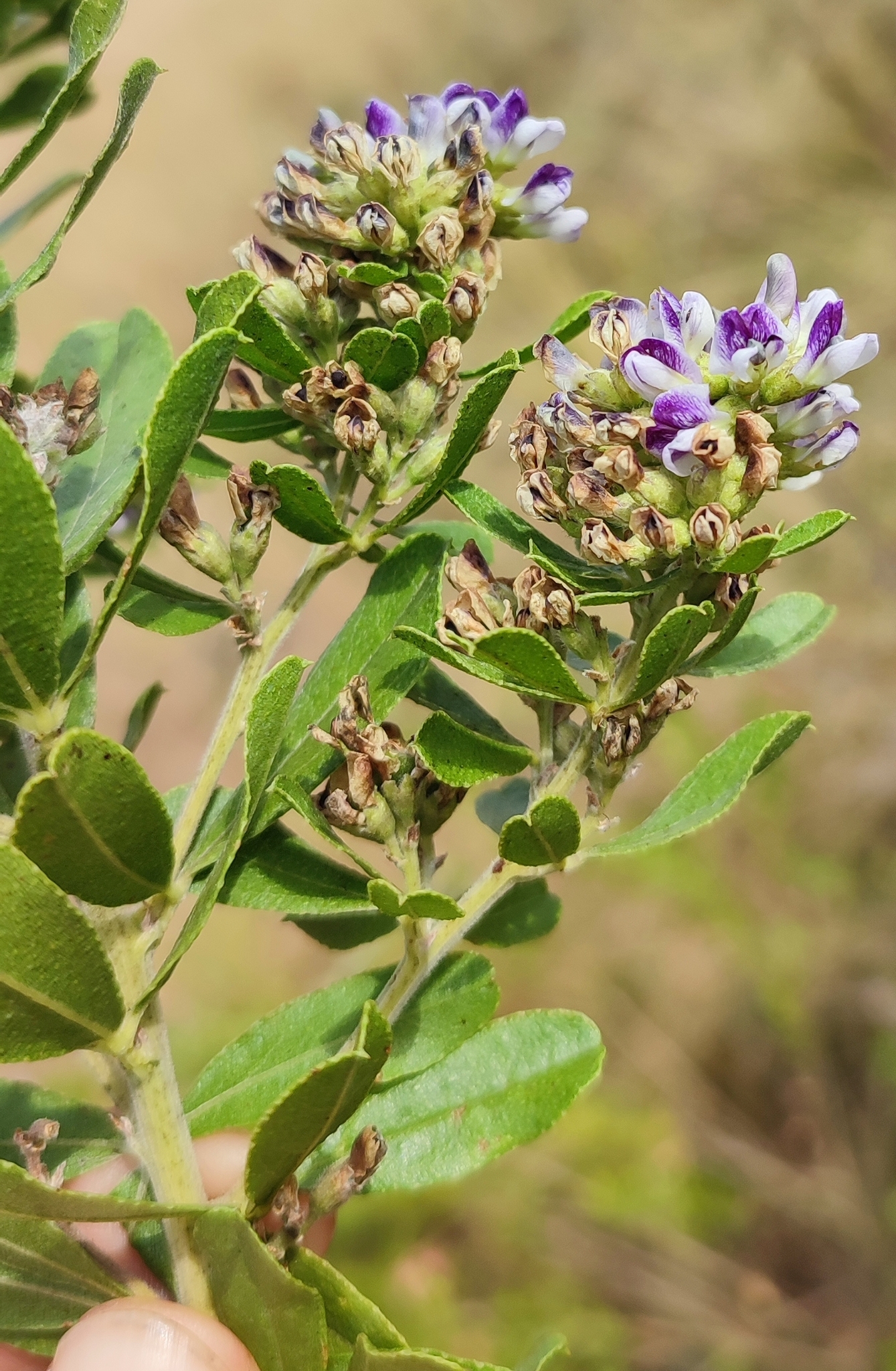 A tall shrub. Stems thinly pubescent, leaves 2-3 cm equidistant. Leaves trifoliolate, petiolate, stipulate; petioles up to 4 mm long; leaflets up to 4.5 cm long and 1.3 cm broad, oblanceolate to oblanceolate-ovate, obtuse, recurved mucronate, nigro-punctate, thinly pubescent, becoming glabrous, sessile or sub-sessile. Stipules lanceolate, acuminate, glandular, thinly pubescent. Inflorescence terminal and axillary, spicate. Peduncles up to 2.8 mm long. Flowers in threes subtended by a common bract. Calyx-tube 2.5 mm long, 5.5 mm in diameter, veined, glandular, hirsute; lobes ovate, glandular, hirsute, ciliate, hirsute on the inner surface; upper and lateral lobes 1.5-2 mm long, up to 1 mm broad; lowest lobe 2.5-3 mm long, 1-1.5 mm broad. Vexillum 6-6.5 mm long, 5.5-6 mm broad, ovate or obovate, with a linear claw 1.5-2.5 mm long; alae 6 mm long, 2-2.5 mm broad, with a linear claw 2.5-3 mm long; carina 3-4 mm long, 1.5-2 mm broad, with a linear claw 3-3.5 mm long. Ovary pubescent; style 3.5-4 mm long, pilose. From: Forbes, HML. 1937. The genus Psoralea Linn. Bothalia 3: 116-136. [CC BY]
