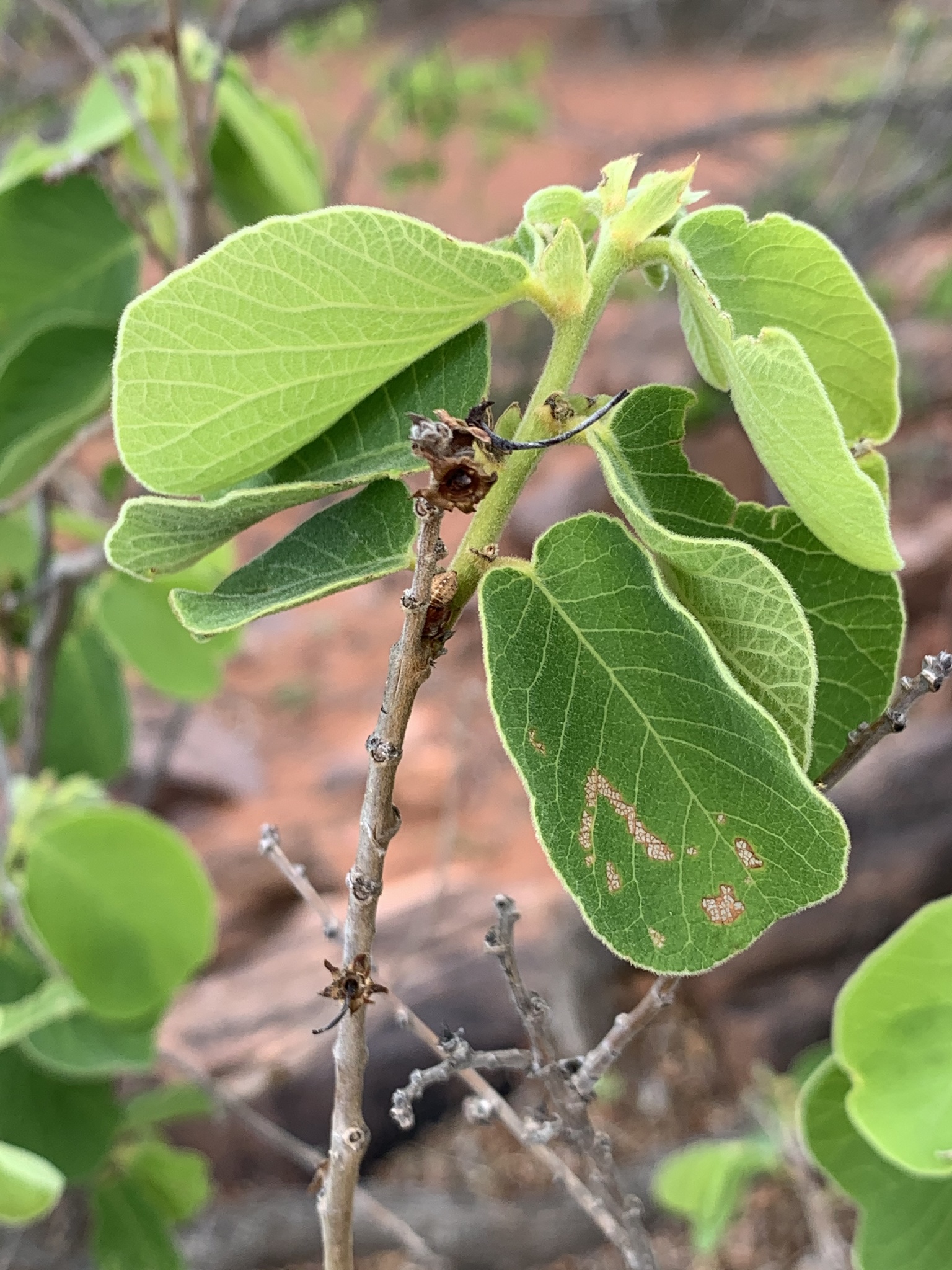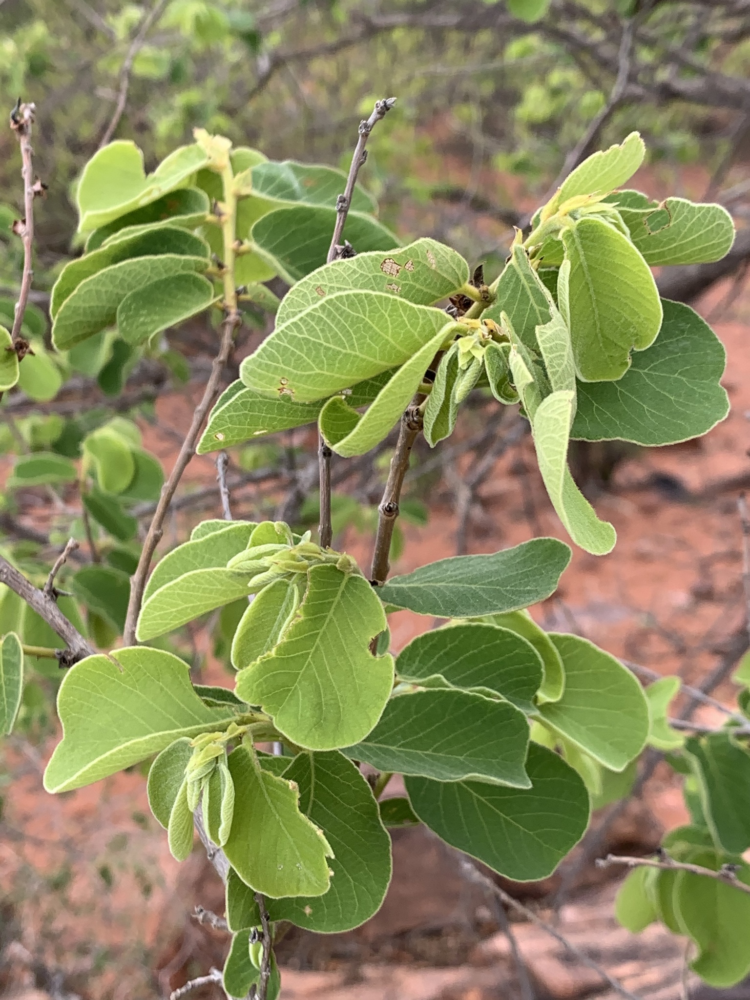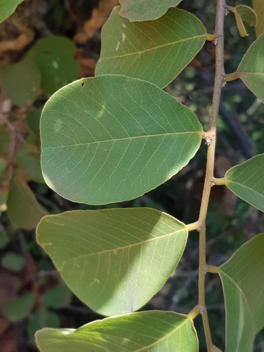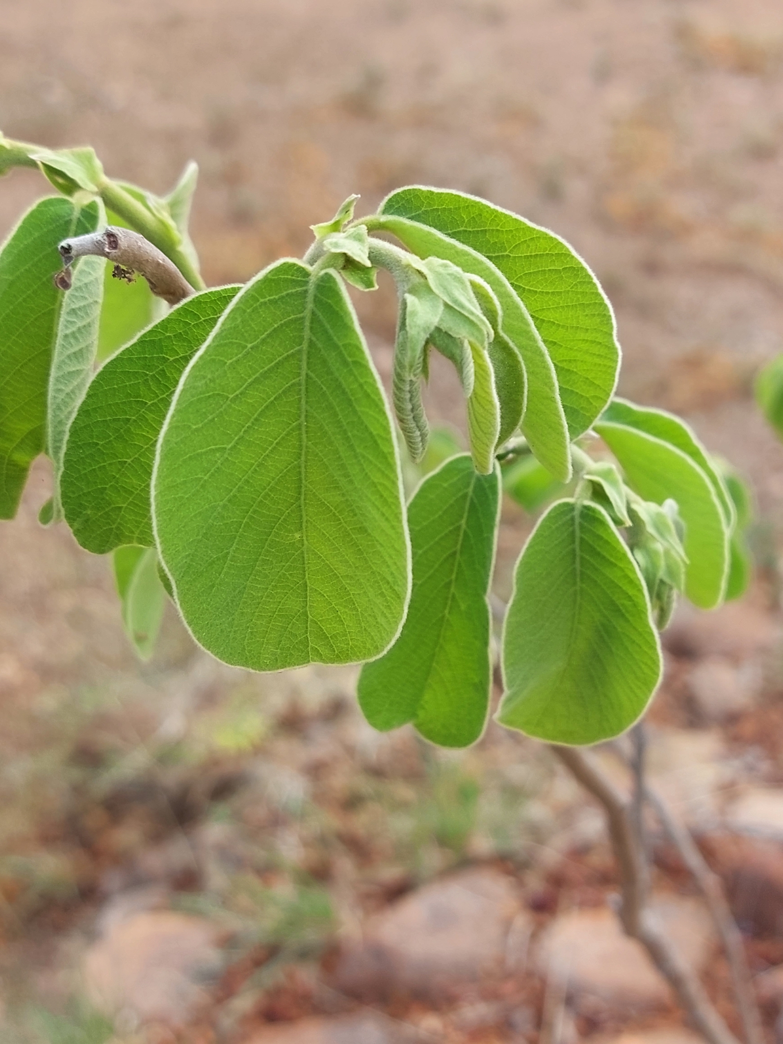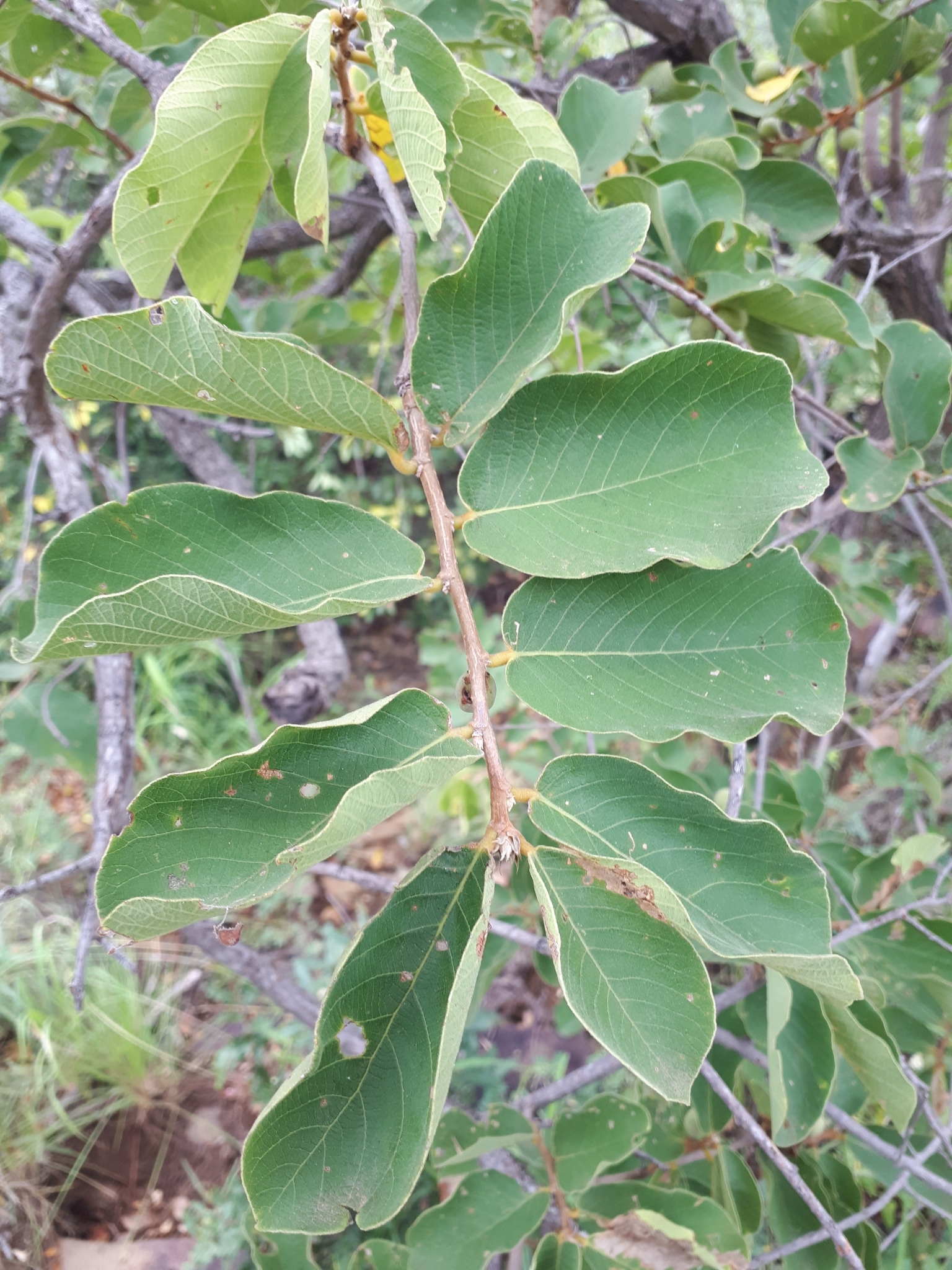 Shrub or small tree, up to 7 m high. Leaves ovate to obovate, 25-130 x 13-90 mm, apex broadly tapering and often notched, both leaf surfaces with dense velvety hairs, lateral veins terminating in margin. Flowers greenish yellow. From: Retief, E; Herman, PPJ. 1997. Plants of the northern provinces of South Africa: Keys and diagnostic characters. Strelitzia 6: 1-681. National Botanical Institute, Pretoria. [CC BY]