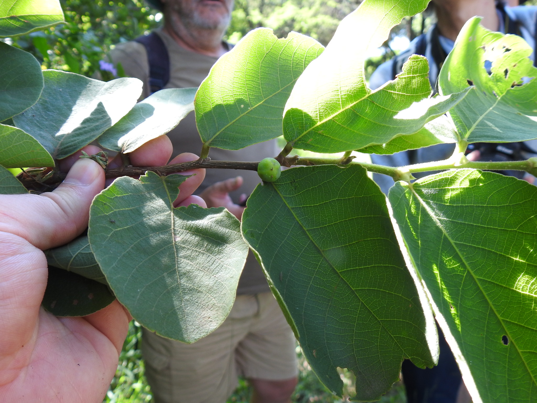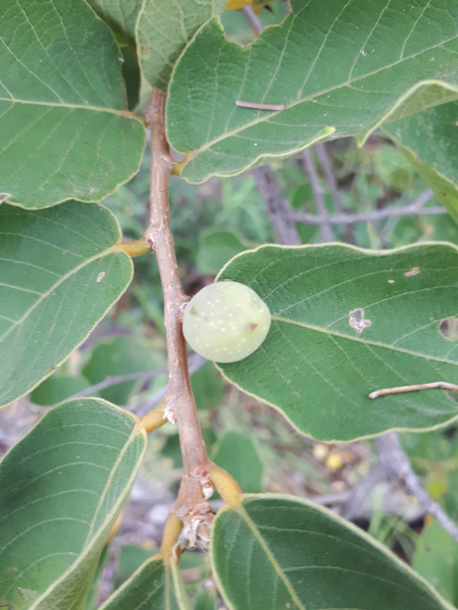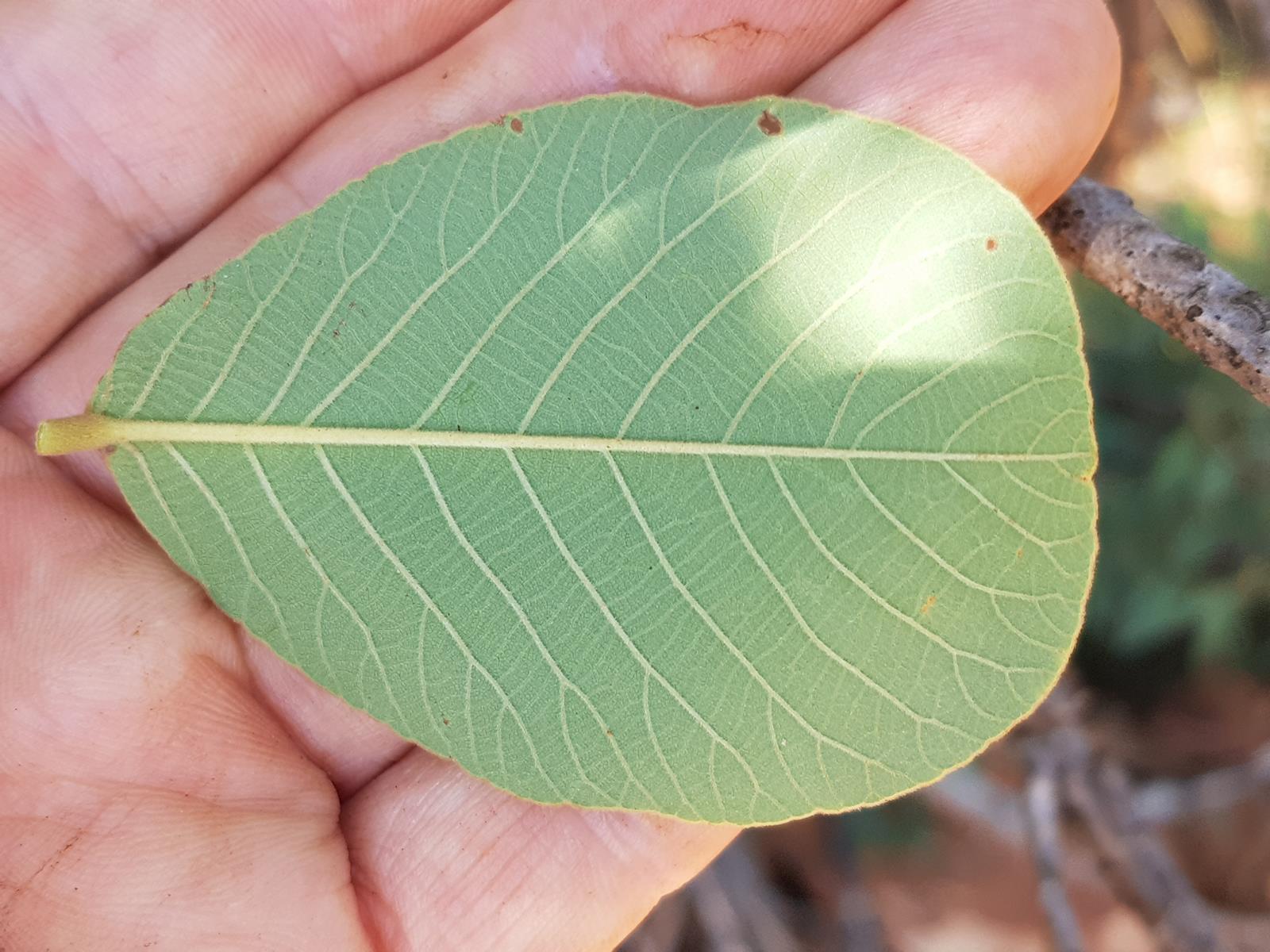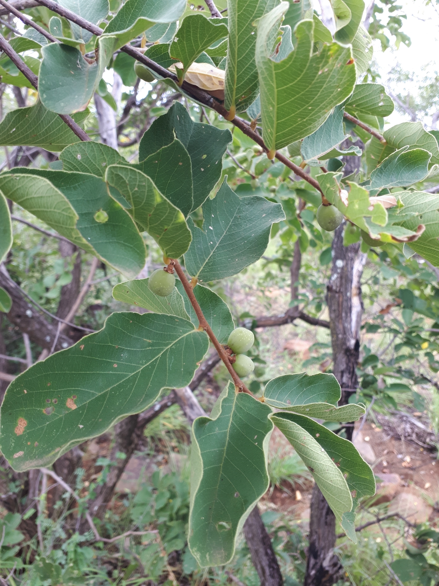 General notes: Woodland on sandy stony soil on bank of dry stream, in full sun. Moderate south-west slope. Small tree c. 3 m tall, with green fruit; 3 adhering stigmas at top of each fruit. Small and large leaves on the same tree. Occasional.