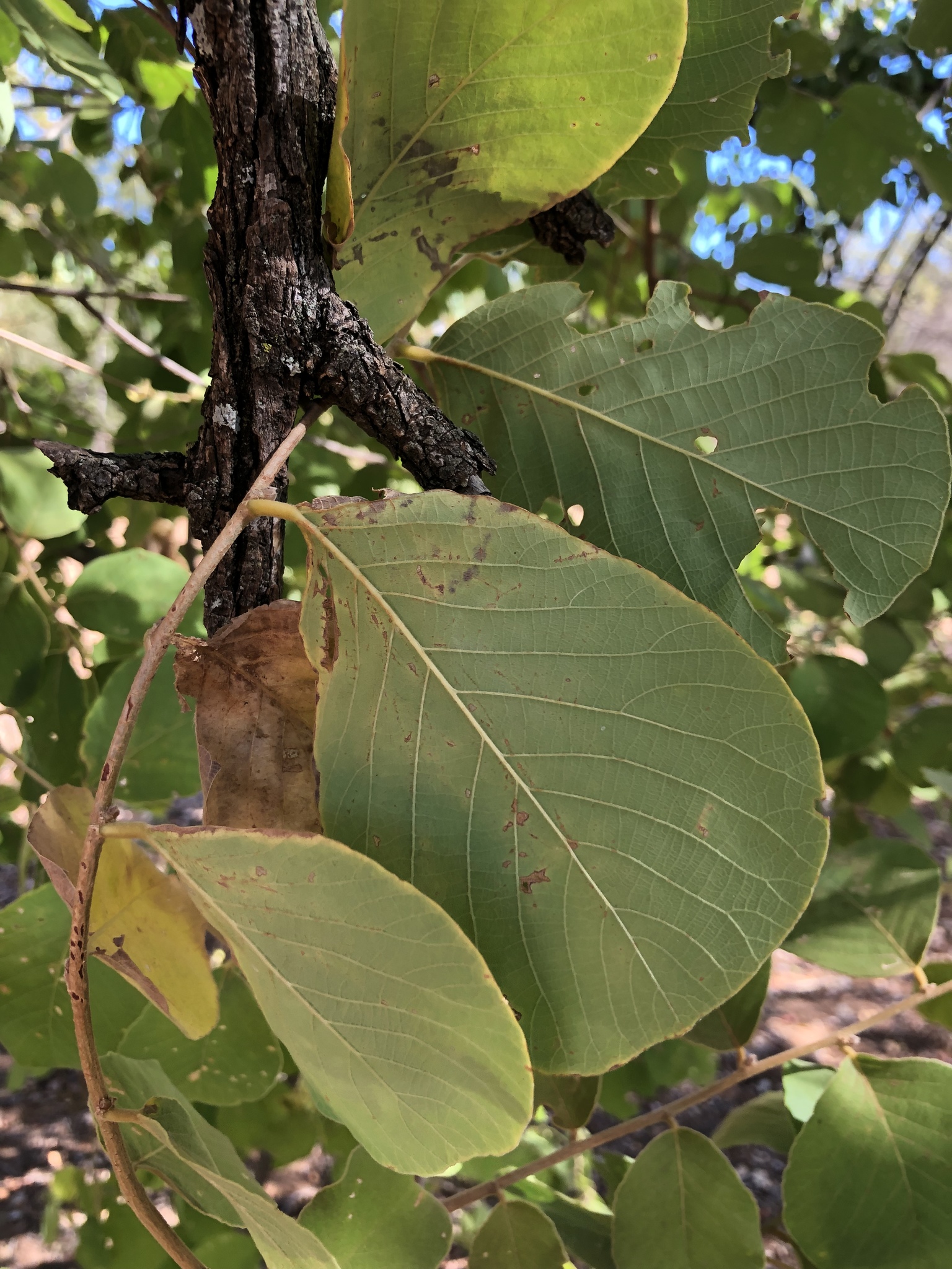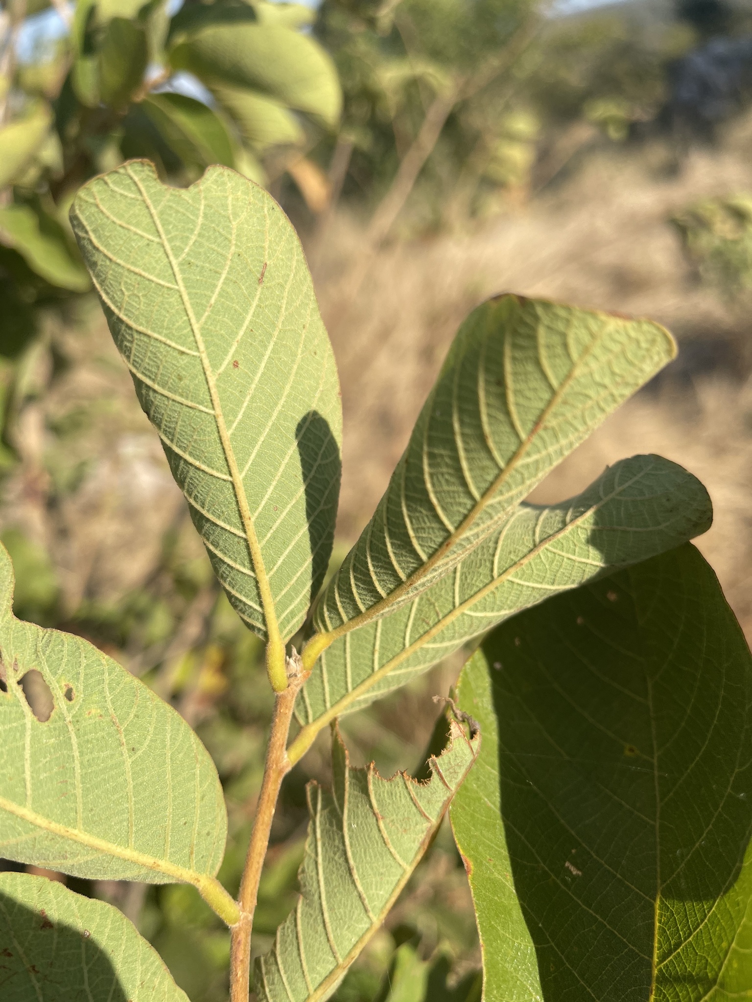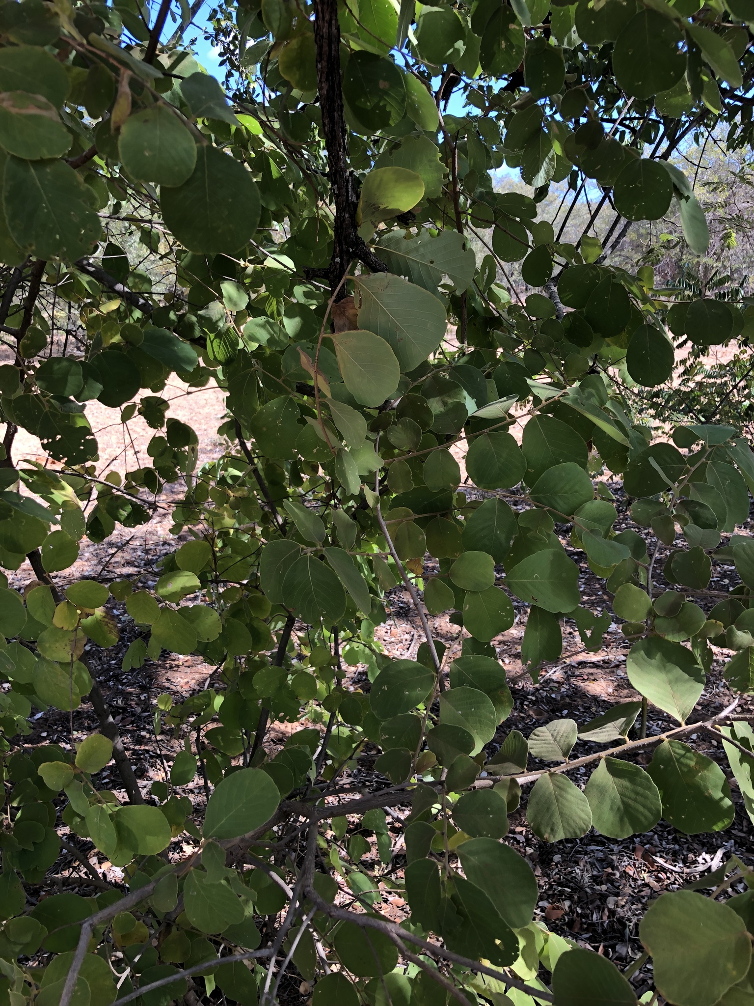 General notes: Woodland on sandy stony soil on bank of dry stream, in full sun. Moderate south-west slope. Small tree c. 3 m tall, with green fruit; 3 adhering stigmas at top of each fruit. Small and large leaves on the same tree. Occasional.