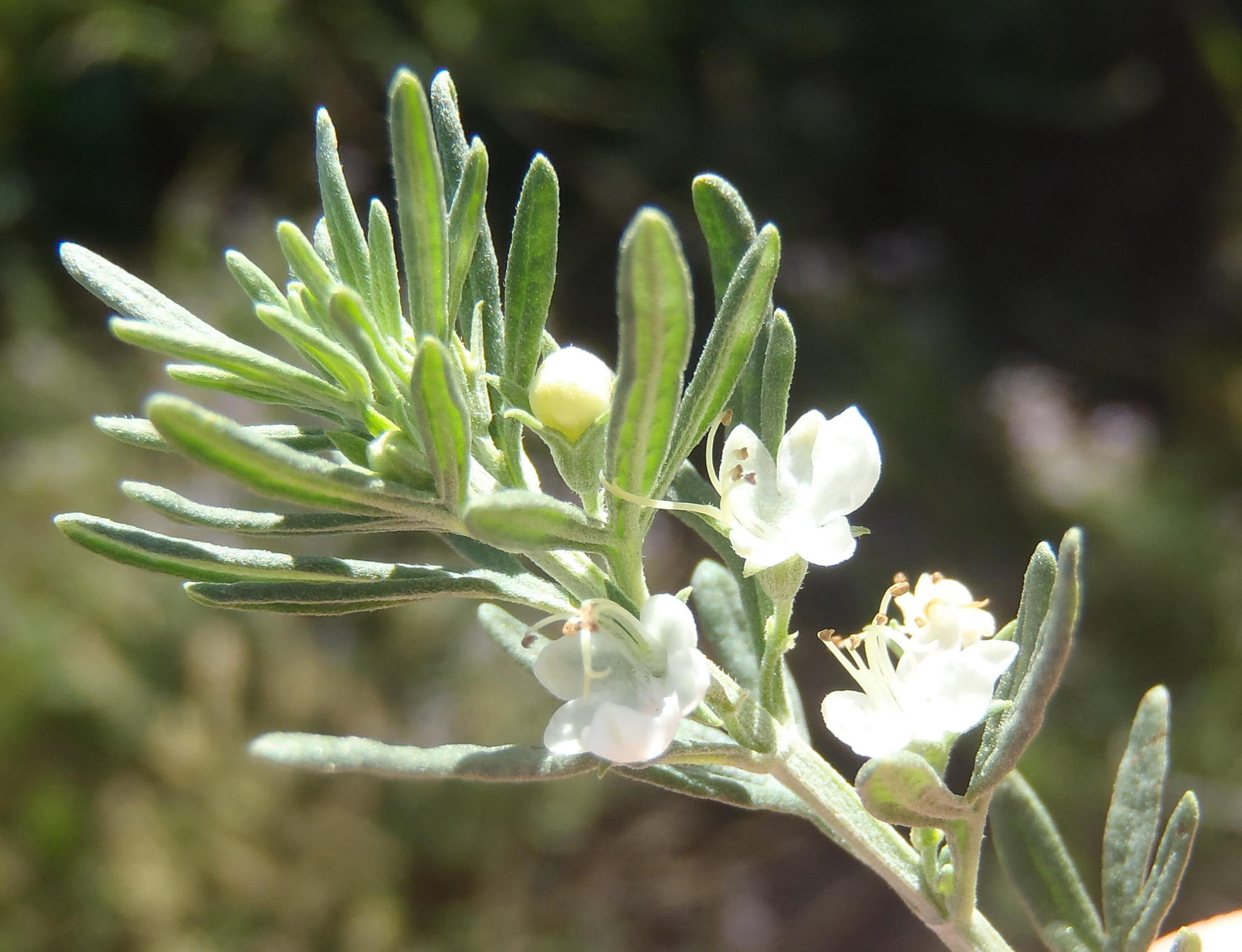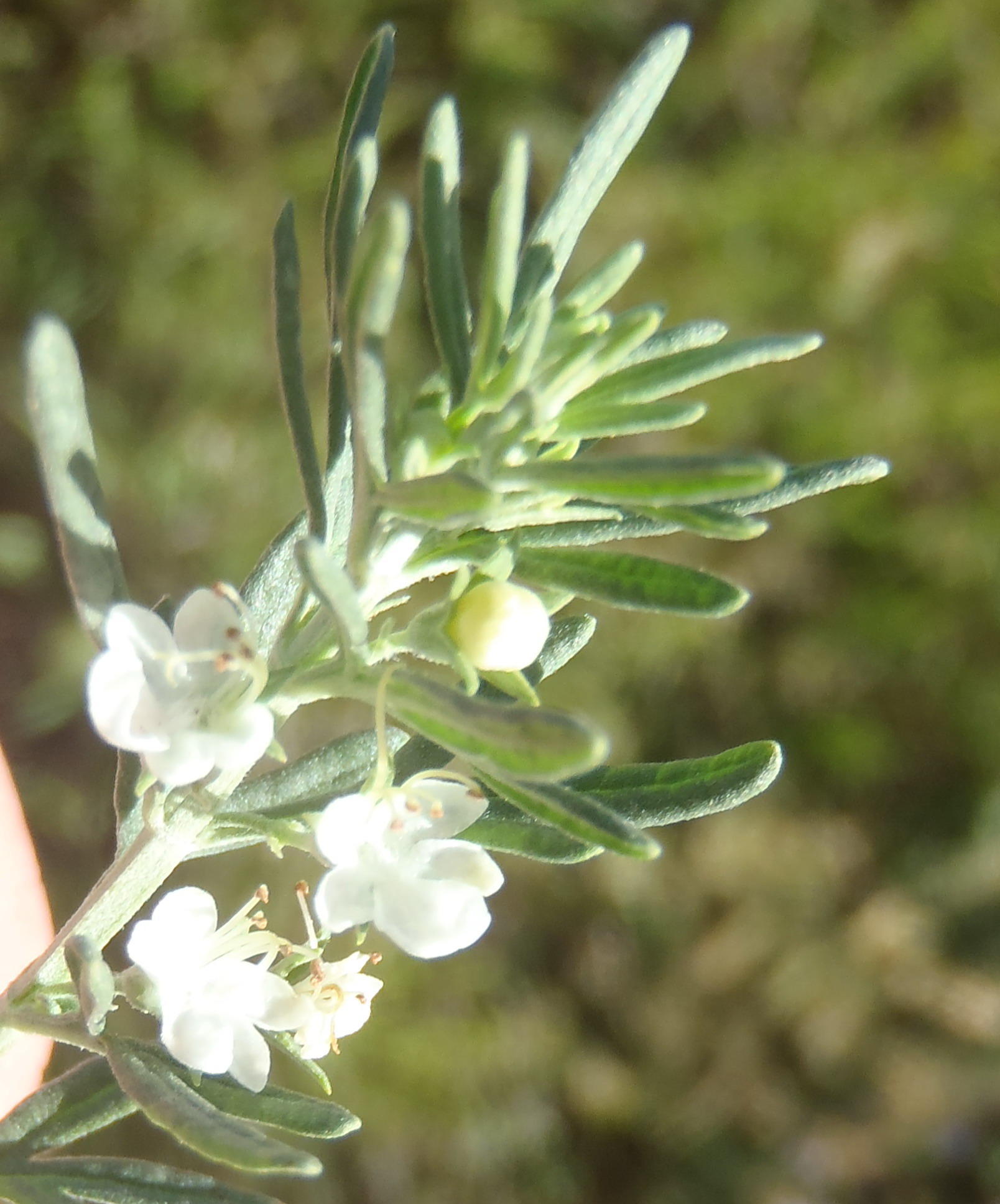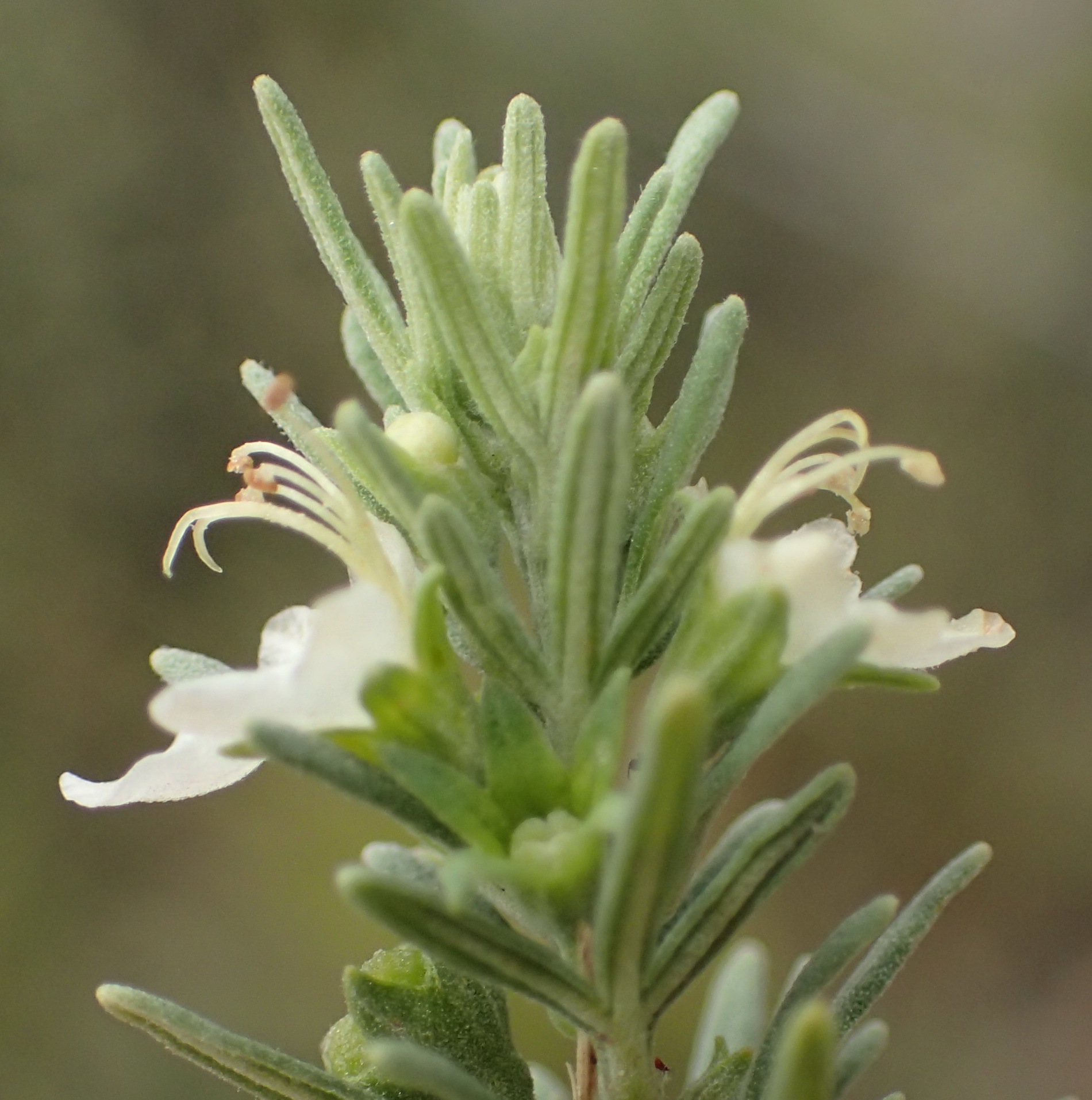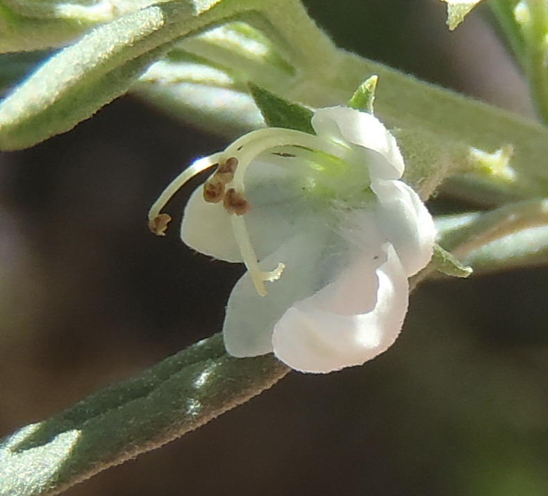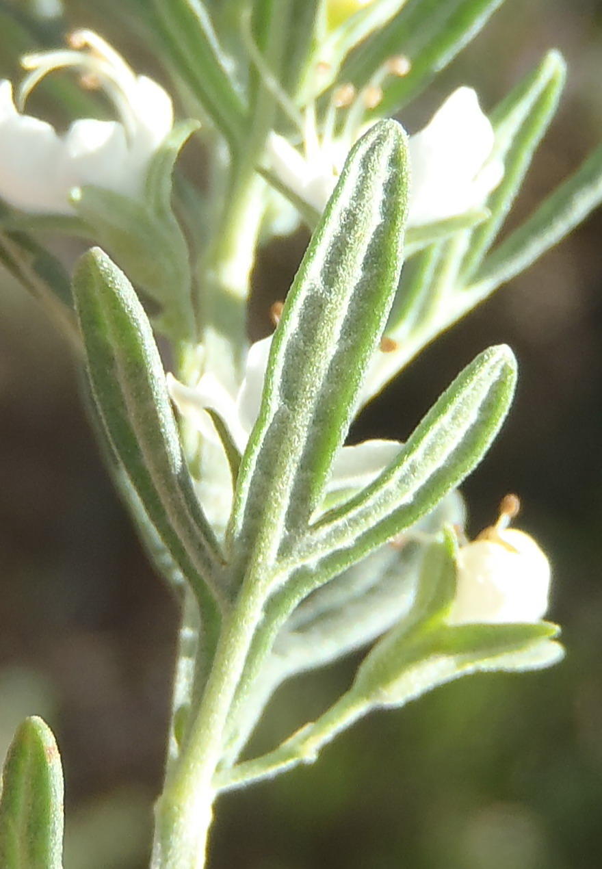 Greyish, bushy shrublet, 0.1-0.3 m high; stems simple or branched near base, greyish, glandular-tomentulose. Leaves sessile, grey-green, 8-30 mm long, 3-lobed to 3-partite; lobes linear to linear-oblong, 5-25 x 1-3 mm, margins entire, revolute; thinly pubescent. Inflorescence a terminal, leafy panicle. Flowers white. Calyx greyish, 3-4 mm long; teeth lanceolate-deltoid. Corolla 5-6 mm long; tube 2 mm long; lower lip obovate, slightly concave, remaining four lobes oblong, 2 mm long. Stamens exserted by 6-7 mm. From: Bredenkamp, CL; Ngoepe, N. 2019. Lamiaceae. In: CL Bredenkamp (ed.), A Flora of the Eastern Cape Province. Strelitzia 41(2): 1125-1164. South African National Biodiversity Institute, Pretoria. [CC BY]