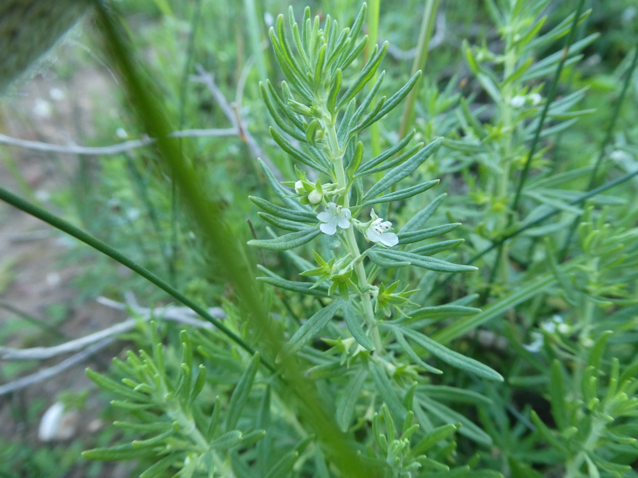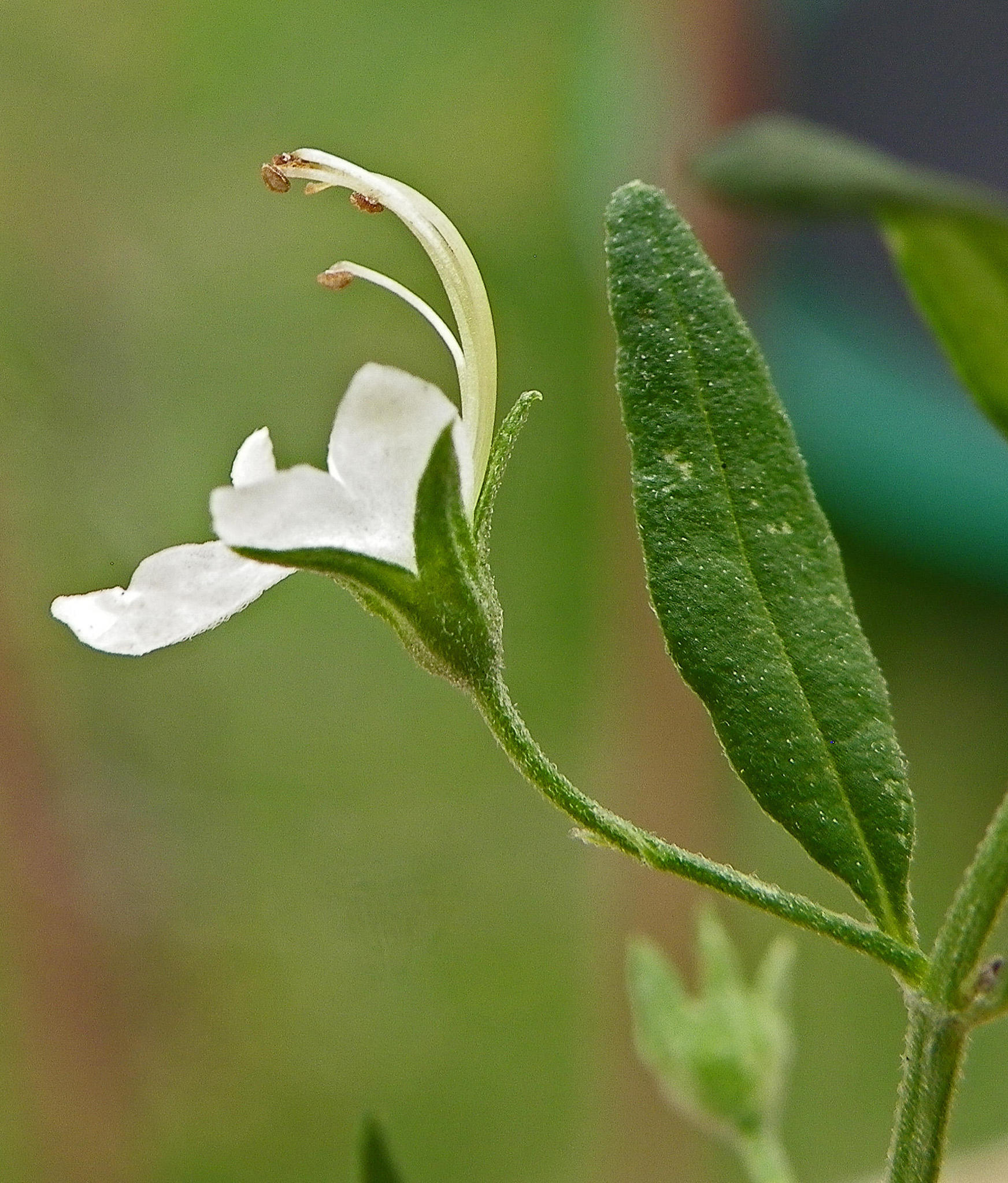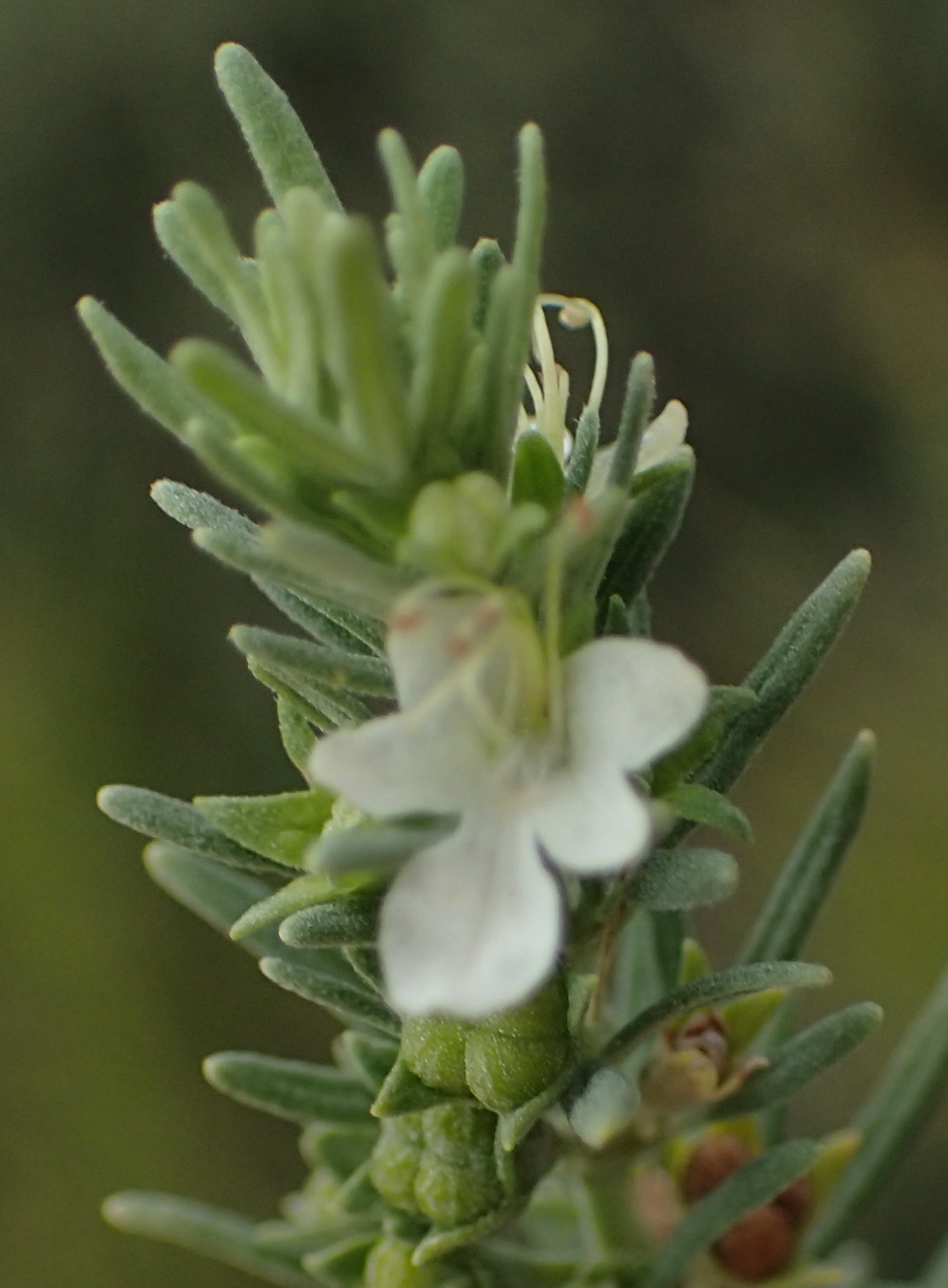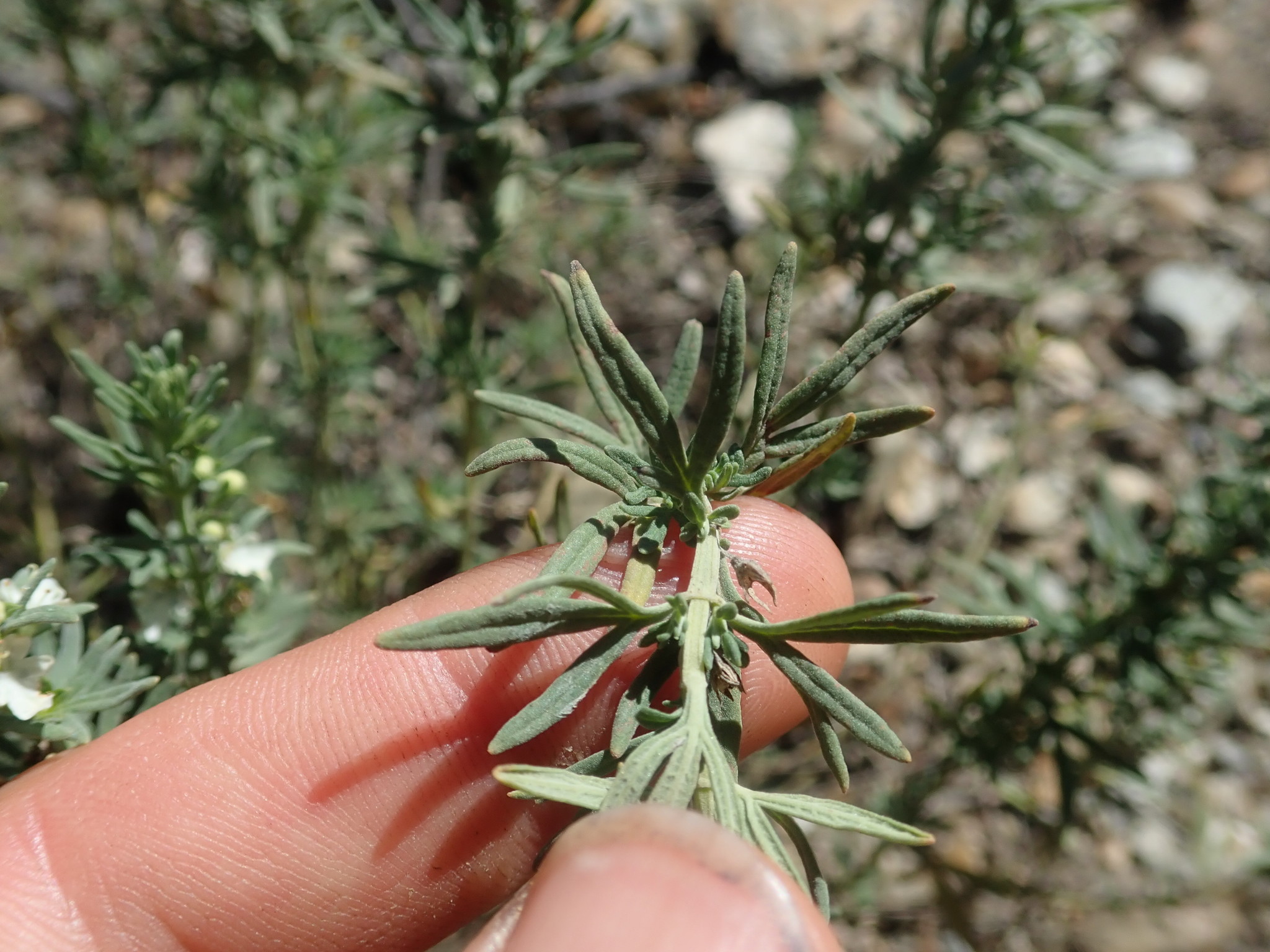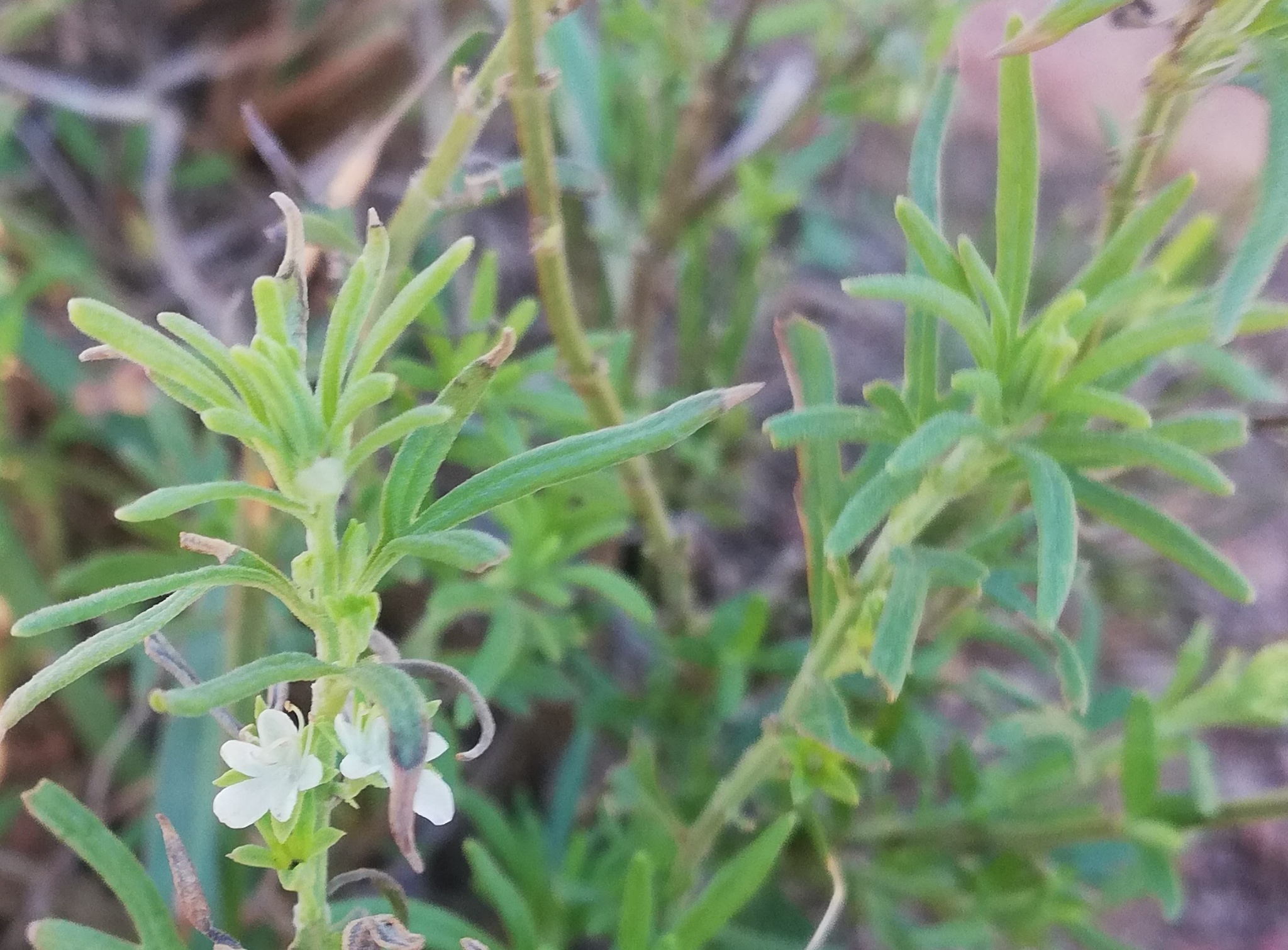 Greyish, bushy shrublet, 0.1-0.3 m high; stems simple or branched near base, greyish, glandular-tomentulose. Leaves sessile, grey-green, 8-30 mm long, 3-lobed to 3-partite; lobes linear to linear-oblong, 5-25 x 1-3 mm, margins entire, revolute; thinly pubescent. Inflorescence a terminal, leafy panicle. Flowers white. Calyx greyish, 3-4 mm long; teeth lanceolate-deltoid. Corolla 5-6 mm long; tube 2 mm long; lower lip obovate, slightly concave, remaining four lobes oblong, 2 mm long. Stamens exserted by 6-7 mm. From: Bredenkamp, CL; Ngoepe, N. 2019. Lamiaceae. In: CL Bredenkamp (ed.), A Flora of the Eastern Cape Province. Strelitzia 41(2): 1125-1164. South African National Biodiversity Institute, Pretoria. [CC BY]