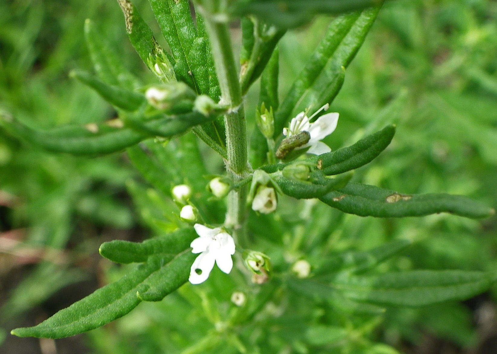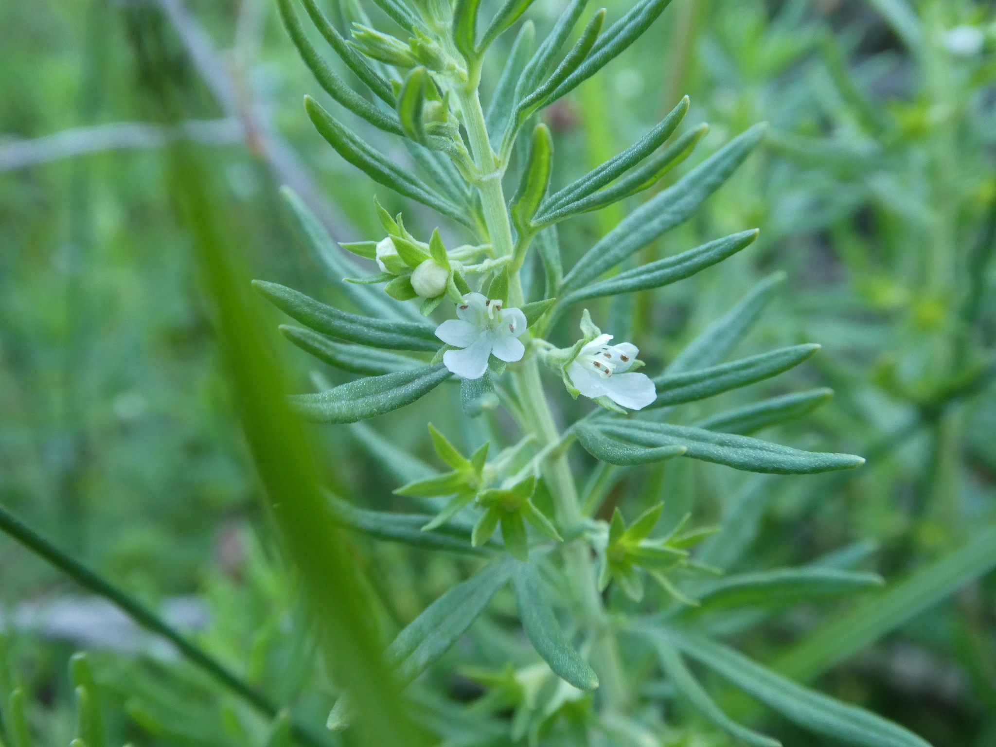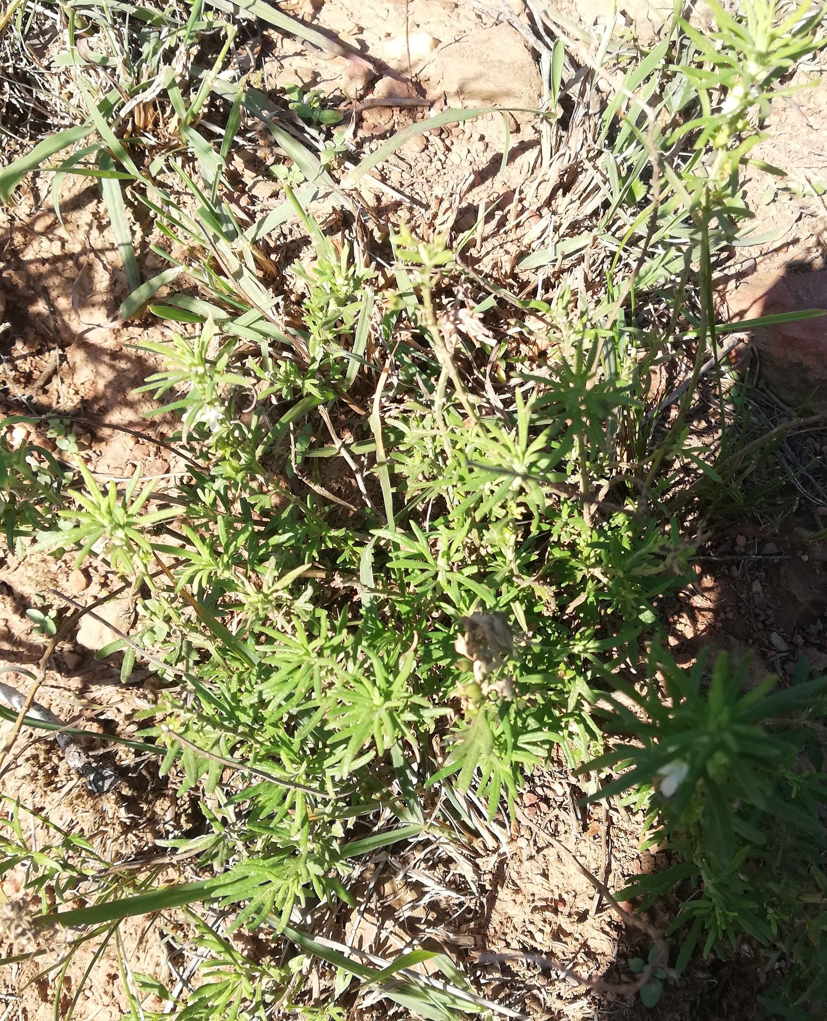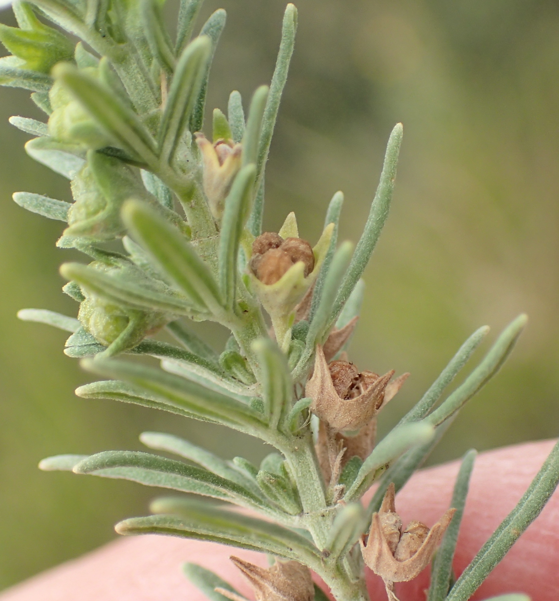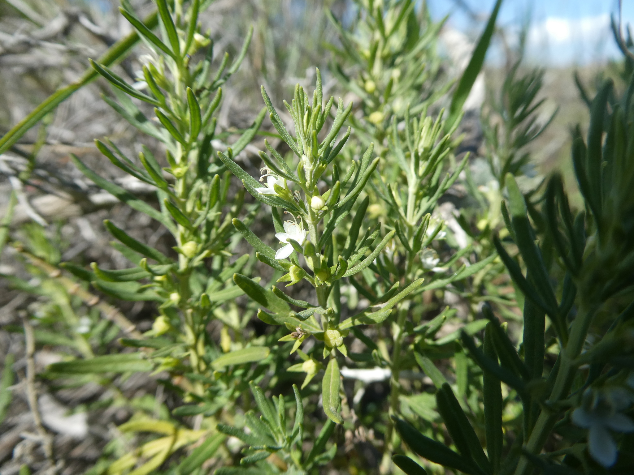 Greyish, bushy shrublet, 0.1-0.3 m high; stems simple or branched near base, greyish, glandular-tomentulose. Leaves sessile, grey-green, 8-30 mm long, 3-lobed to 3-partite; lobes linear to linear-oblong, 5-25 x 1-3 mm, margins entire, revolute; thinly pubescent. Inflorescence a terminal, leafy panicle. Flowers white. Calyx greyish, 3-4 mm long; teeth lanceolate-deltoid. Corolla 5-6 mm long; tube 2 mm long; lower lip obovate, slightly concave, remaining four lobes oblong, 2 mm long. Stamens exserted by 6-7 mm. From: Bredenkamp, CL; Ngoepe, N. 2019. Lamiaceae. In: CL Bredenkamp (ed.), A Flora of the Eastern Cape Province. Strelitzia 41(2): 1125-1164. South African National Biodiversity Institute, Pretoria. [CC BY]
