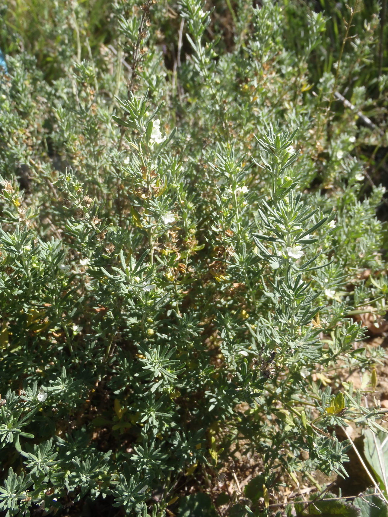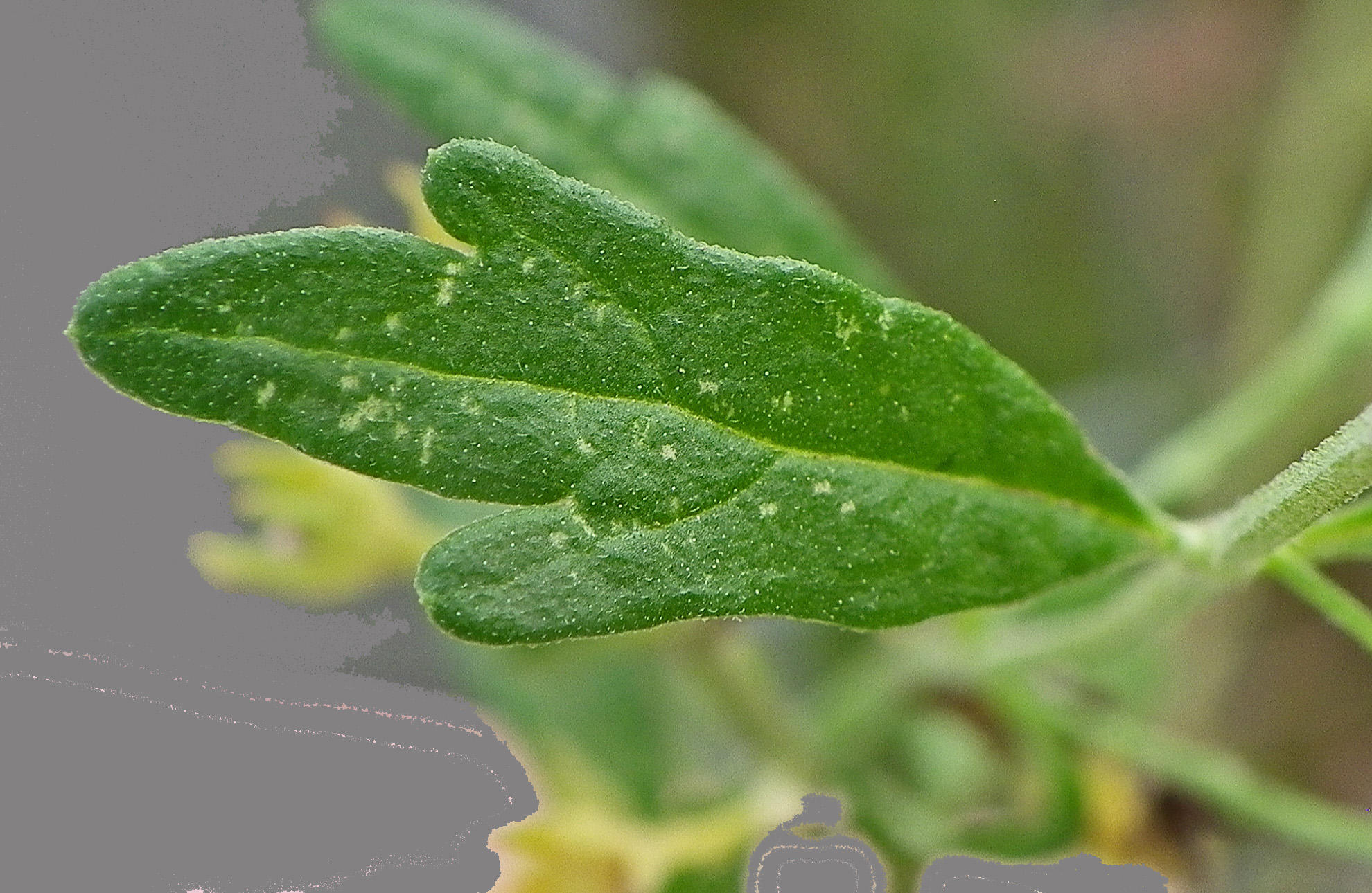Greyish, bushy shrublet 0.1-0.25(-0.3) m tall, branching freely from the base; stems erect to decumbent, simple or sparingly branched, slender, greyish glandular-tomentulose. Leaves sessile, grey-green, thinly pubescent, 8-30 mm long, 3-lobed to 3-partite; lobes linear to linear-oblong, 5-25 x 1-3 mm, occasionally the median lobe again 3-fid; margin entire, revolute; basal portion of leaf narrow, up to 3 mm broad, consisting of a narrowly winged midrib. Inflorescence leafy, simple, occupying the upper third or half of the stem; flowers solitary or rarely 2 or 3 per peduncle; peduncle 3-8 mm long bearing a pair of minute bracteoles below the middle. Calyx greyish, 3-4 mm long; teeth lanceolate-deltoid, about 2 mm long. Corolla 5-6 mm long; tube 2 mm long; lower lip obovate, 3-4 mm long, slightly concave, remaining 4 lobes oblong, rounded, 2 mm long. Anthers exserted by 6-7 mm. From: Codd, LEW. 1985. Lamiaceae: 2. Teucrium. In: OA Leistner (ed.). Fl. S. Africa 28(4): 9-12. Botanical Research Institute, Department of Agriculture and Water Supply, Pretoria. [http://www.biodiversitylibrary.org/item/209555#page/9/mode/1up] [CC BY]
