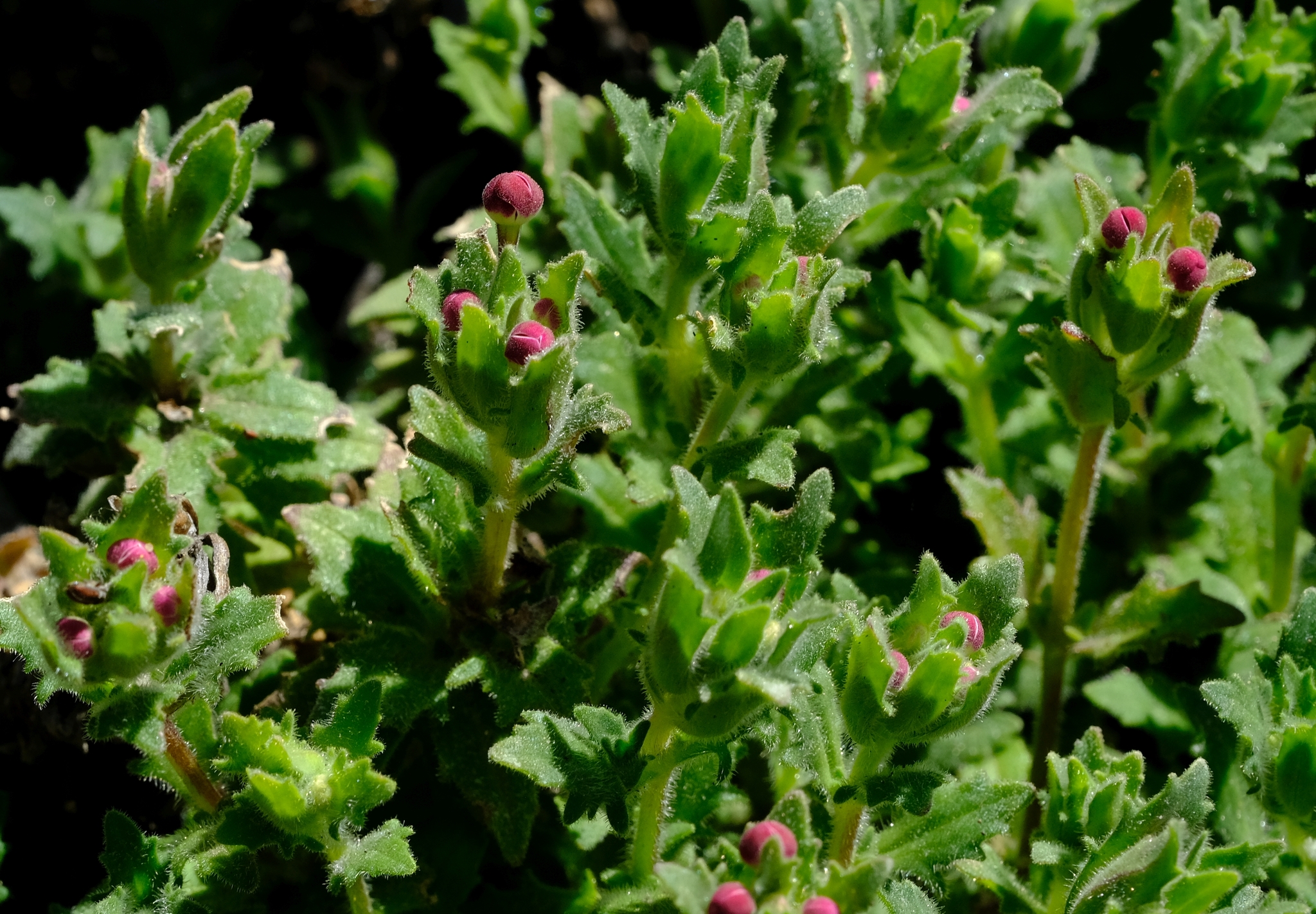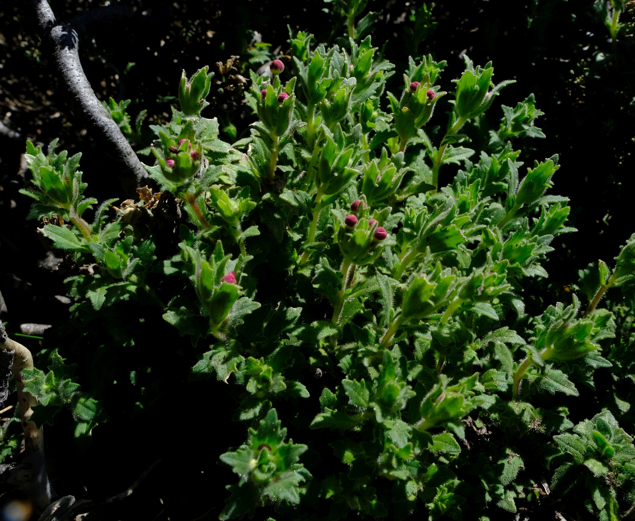 Strongly aromatic twiggy shrublet forming loose clumps, stems sometimes prostrate or decumbent, up to c. 450 mm long, brittle, much branched, clad in long coarse spreading white hairs, gland-tipped or not, or these hairs occasionally wanting, as well as short spreading gland-tipped hairs, leafy. Leaves mostly 15-60 x 4-35 mm, narrowly to broadly elliptic or ovate, apex obtuse to subacute, base cuneate, tapering into a short petiole-like part, margins subentire to coarsely and often somewhat irregularly toothed or lobulate, both surfaces shaggy with gland-tipped hairs. Flowers opening at dusk or in dull light; spikes 1 to several flowered, the flowers then usually crowded. Bracts adnate to calyx for 1.5-4 mm, resembling the leaves but smaller. Calyx 8-13 mm long, lips 4-6 mm long, glandular-pubescent. Corolla tube 30-58 mm long, glandular-puberulous, hairs up to 0.2-0.3 mm long, limb held horizontally, regular; mouth with circlet of long unicellular hairs, sometimes weakly developed on anticous side, or wanting; lobes deeply notched, c. 6-11 mm long, pink to crimson and glandular-puberulous outside, glabrous inside, usually white, sometimes brilliant orange near base. Stamens 4, 2 anticous anthers 1.5-2.5 mm long, shortly exserted, 2 posticous ones 3-3.5 mm long, included. Stigma 4.5-6 mm long, exserted. Capsule 7-11 x 4-6 mm. Seeds c. 1.8 x 1.2 mm, angled, colliculate, pallid. From: Hilliard, OM. 1994. The Manuleae: a tribe of Scrophulariaceae. Edinburgh University Press, Edinburgh. [All rights reserved]