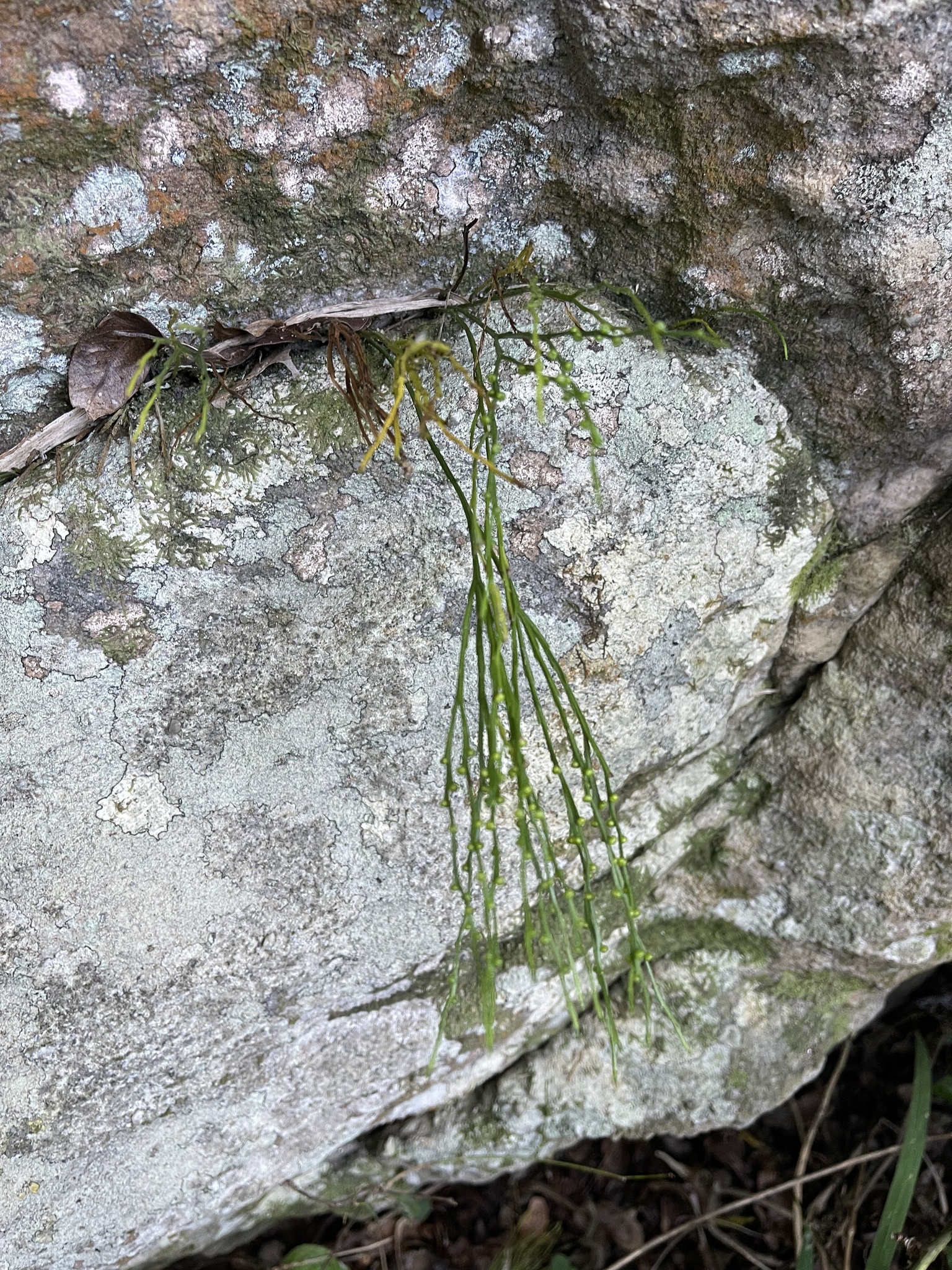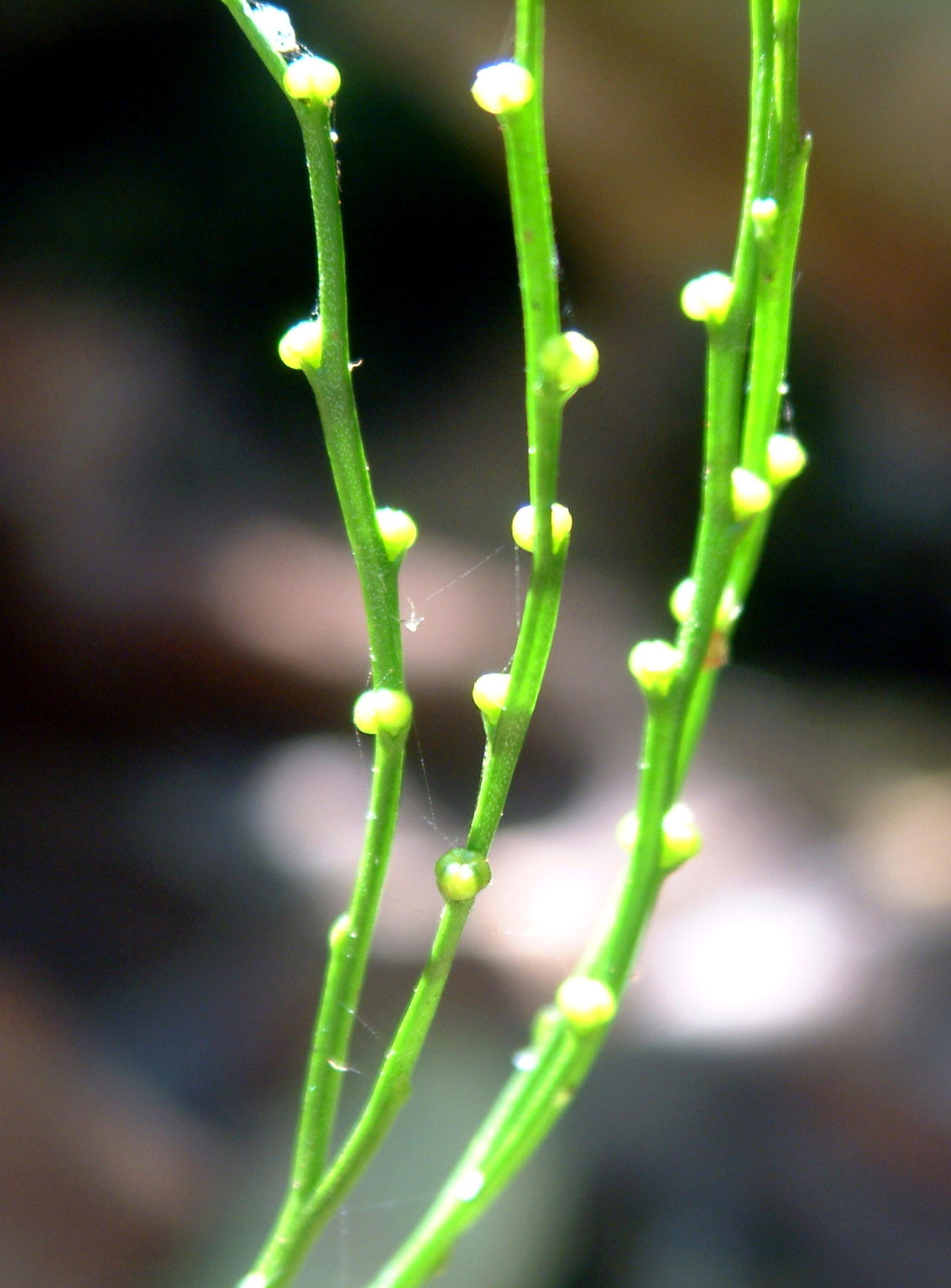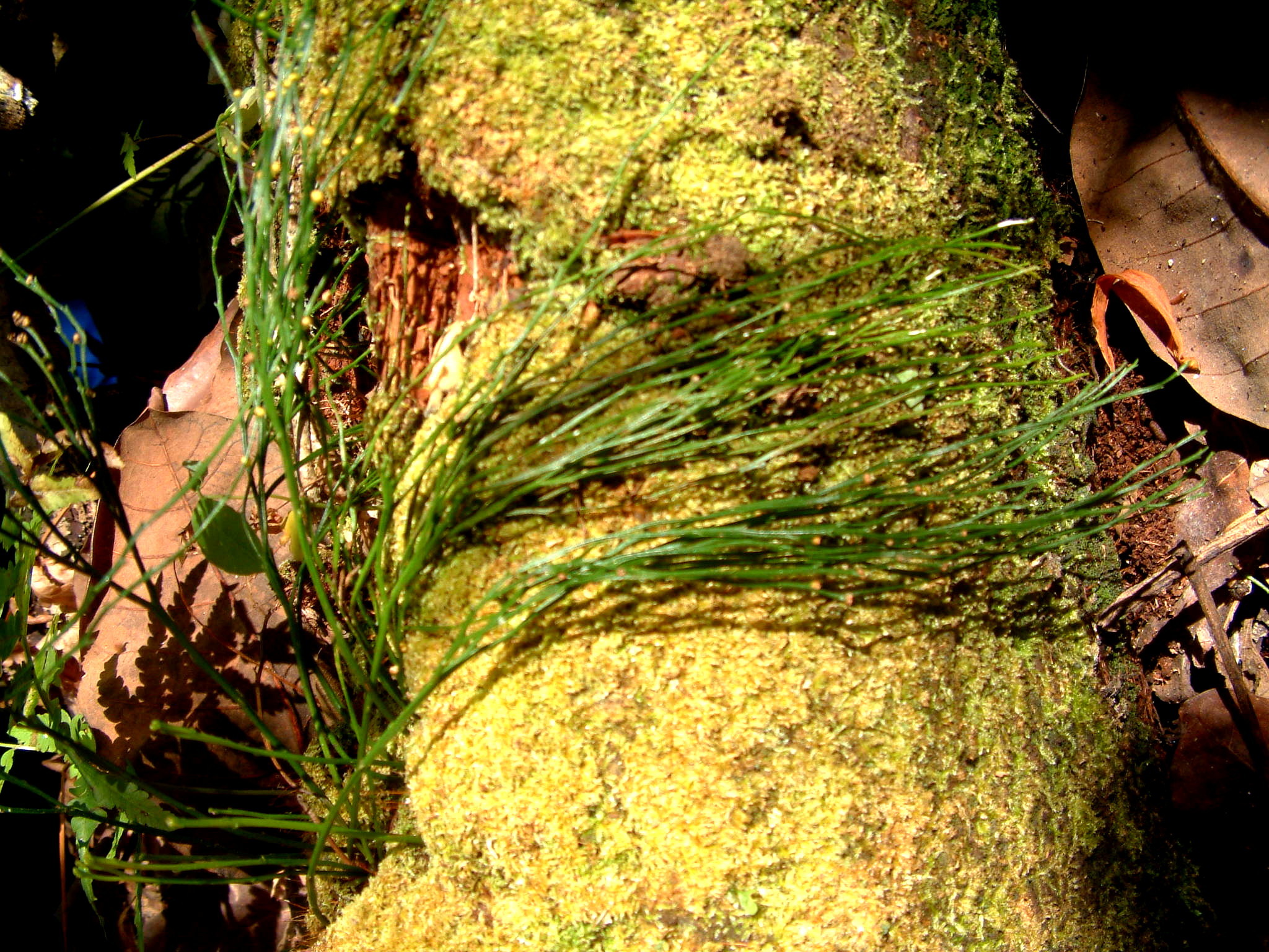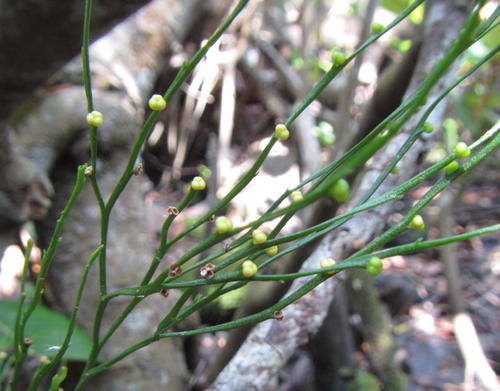 Plants epilithic or epiphytic. Rhizome short-decumbent, dichotomously branched, rootless, to 1.5 mm in diameter, with rhizoids; stems aerial, chlorophyllose, erect or pendent, once or several times dichotomously branched, to 160 mm long, to 2 mm in diameter, glabrous, angular or sulcate; with anomocytic stomata in the sulci. Leaves rudimentary, simple, lanceolate, adnate, spaced, estomate, to 1.5 mm long. Sporangia fused to form a sessile, 2- or 3- locular, thick-walled synangium borne adaxially at the base of forked sporophylls, to 2.5 mm in diameter, each locule dehisces with a longitudinal slit. Spores numerous, achlorophyllaceous, elongate-ellipsoid, monolete, irregularly rugate, 60-75 µm long. From: Roux, JP. 2003. Swaziland ferns and fern allies. Unpublished notes. [All rights reserved]