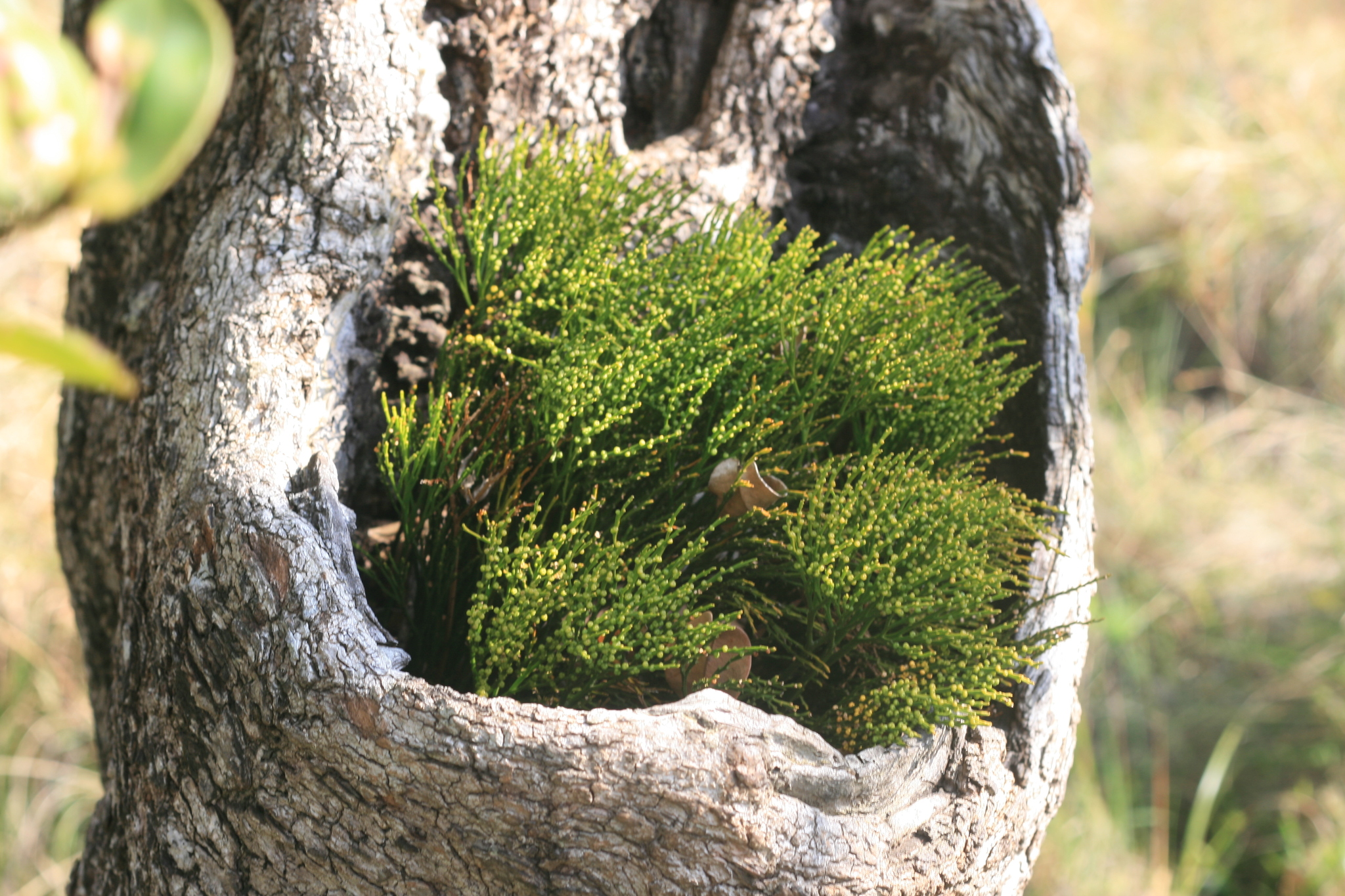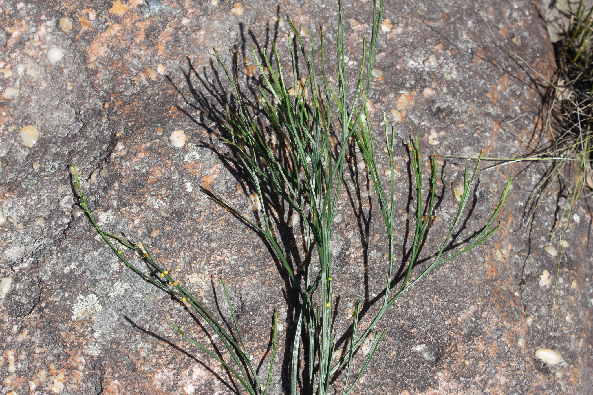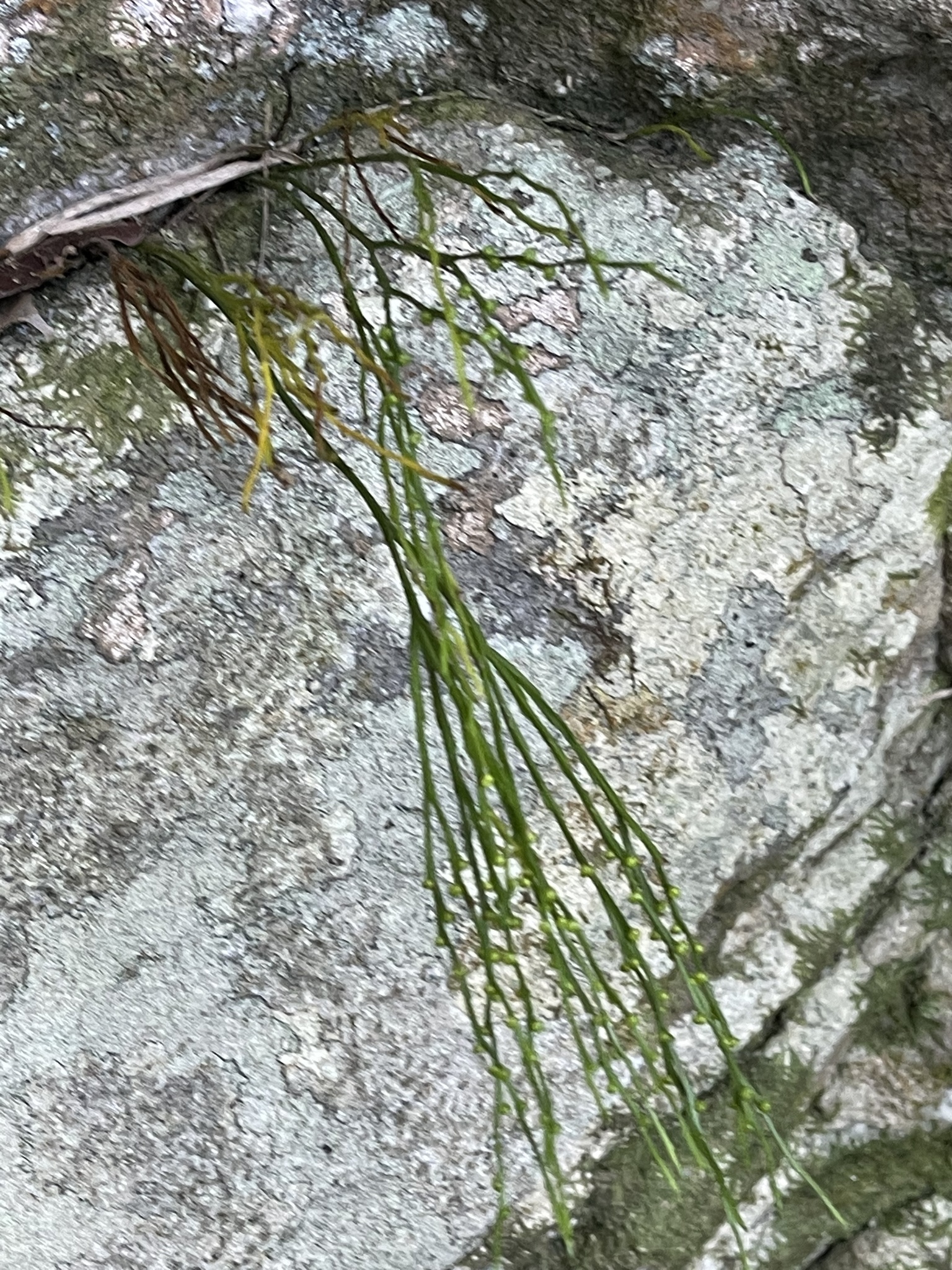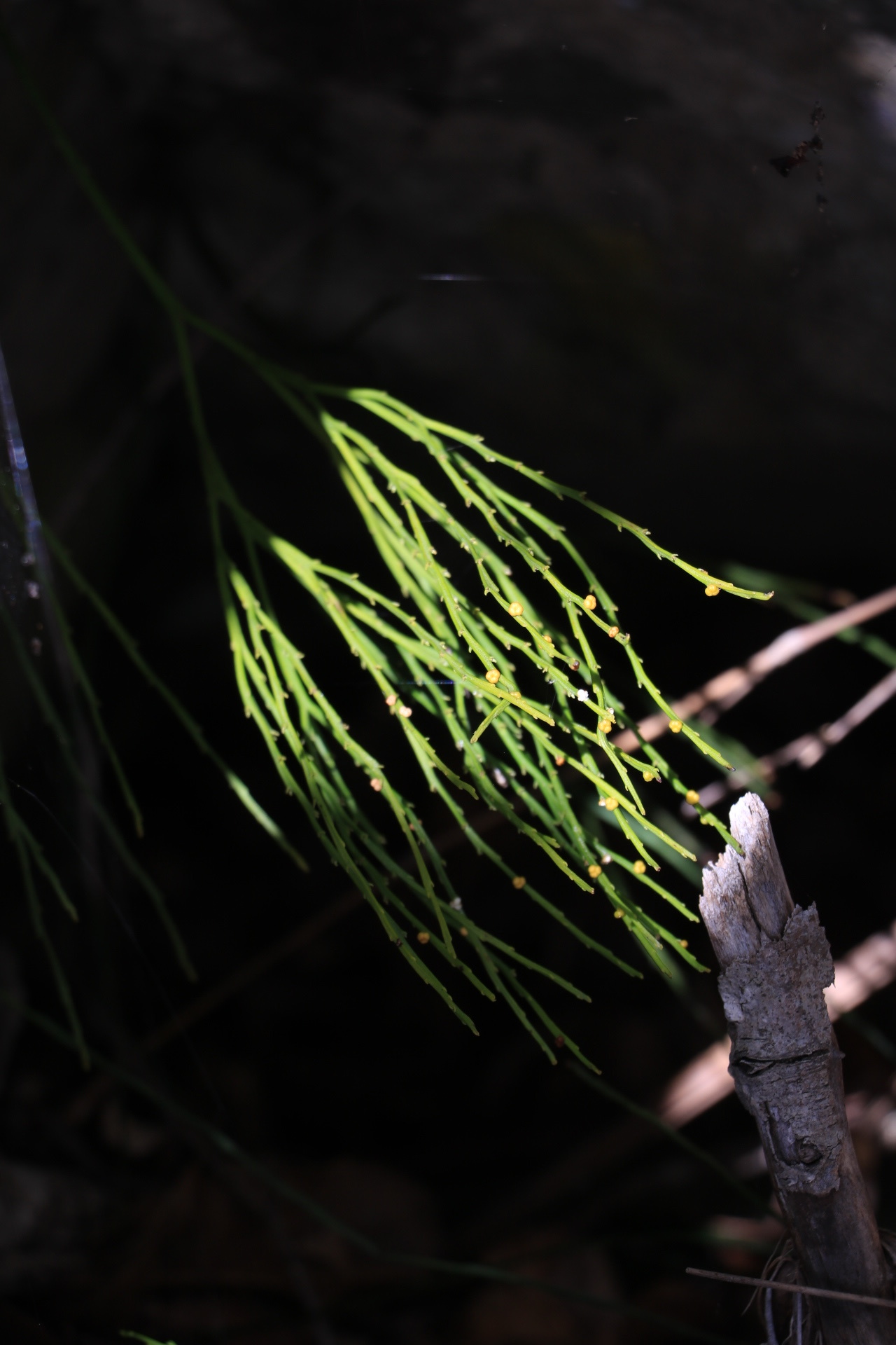 Plants epilithic or epiphytic. Rhizome short-decumbent, dichotomously branched, rootless, to 1.5 mm in diameter, with rhizoids; stems aerial, chlorophyllose, erect or pendent, once or several times dichotomously branched, to 160 mm long, to 2 mm in diameter, glabrous, angular or sulcate; with anomocytic stomata in the sulci. Leaves rudimentary, simple, lanceolate, adnate, spaced, estomate, to 1.5 mm long. Sporangia fused to form a sessile, 2- or 3- locular, thick-walled synangium borne adaxially at the base of forked sporophylls, to 2.5 mm in diameter, each locule dehisces with a longitudinal slit. Spores numerous, achlorophyllaceous, elongate-ellipsoid, monolete, irregularly rugate, 60-75 µm long. From: Roux, JP. 2003. Swaziland ferns and fern allies. Unpublished notes. [All rights reserved]
