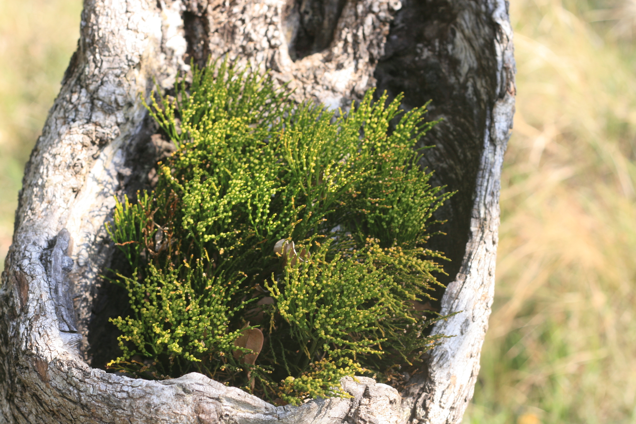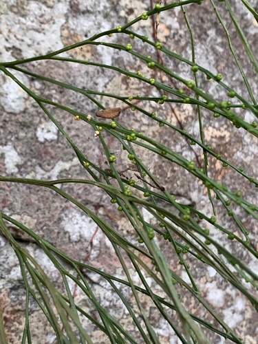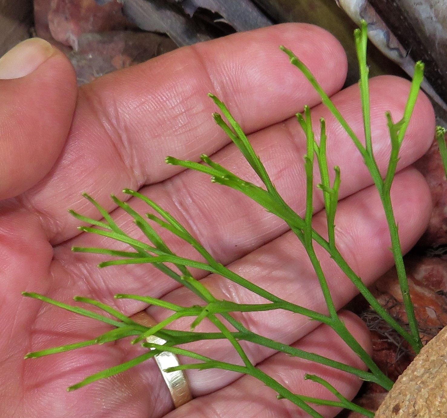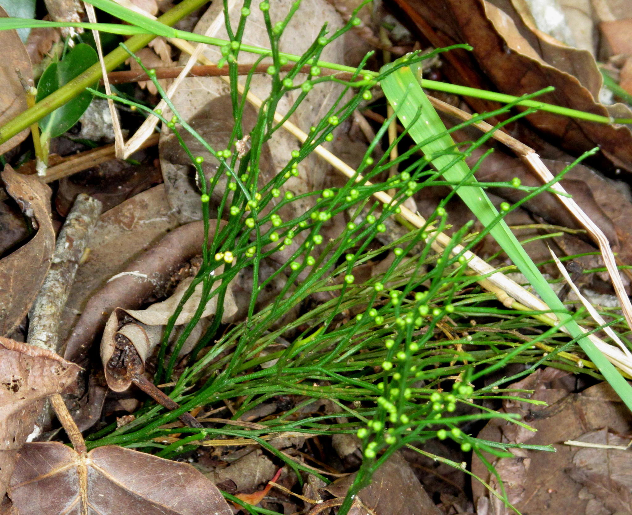 Rhizome up to 1.5 mm in diam., short-creeping, branched, lacking true roots, but with rhizoids. Aerial stems green, angular, once of several times equally forked, up to 160 mm long, up to 2 mm in diam., erect or pendent, with rudimentary simple, lance-shaped enations, broadly attached, up to 1.5 mm long. Synangia 2- or 3-locular, up to 2.5 mm in diam., borne in axil of forked enations near branch ends, locules dehisce with a longitudinal slit. From: Roux, JP. 2019. Pteridophyta. In: CL Bredenkamp (ed.), A Flora of the Eastern Cape Province. Strelitzia 41(1): 96-157. South African National Biodiversity Institute, Pretoria. [CC BY]