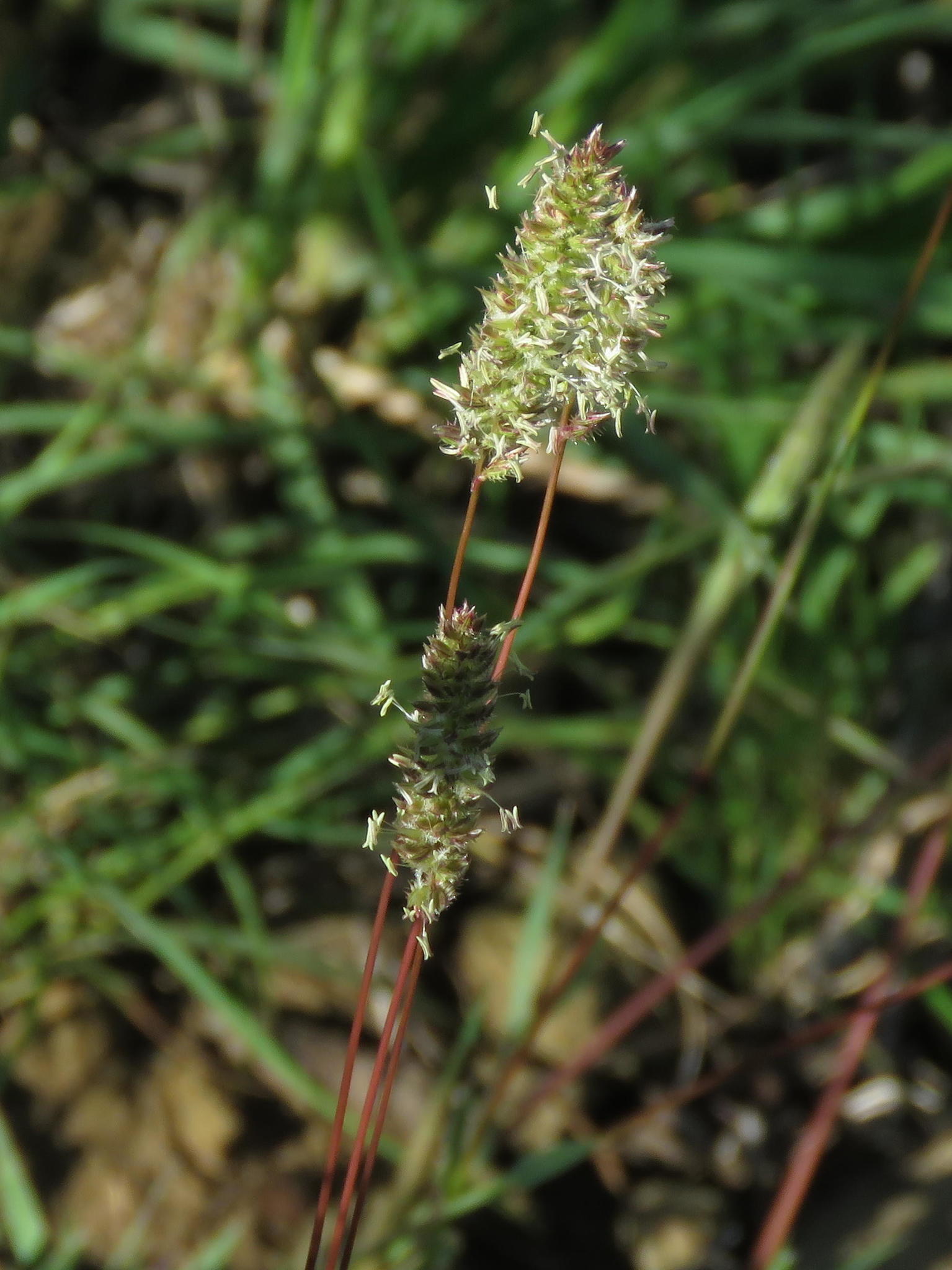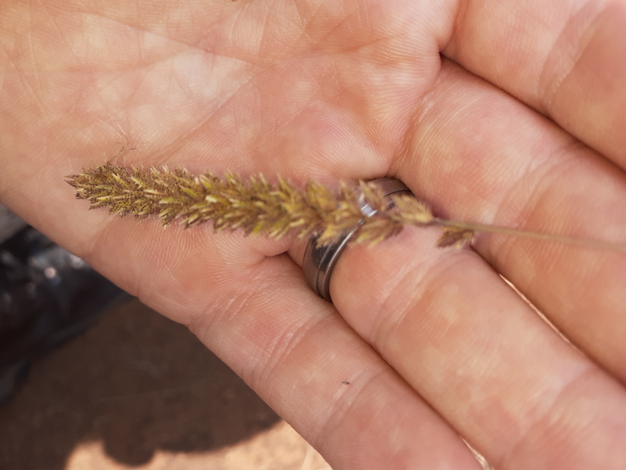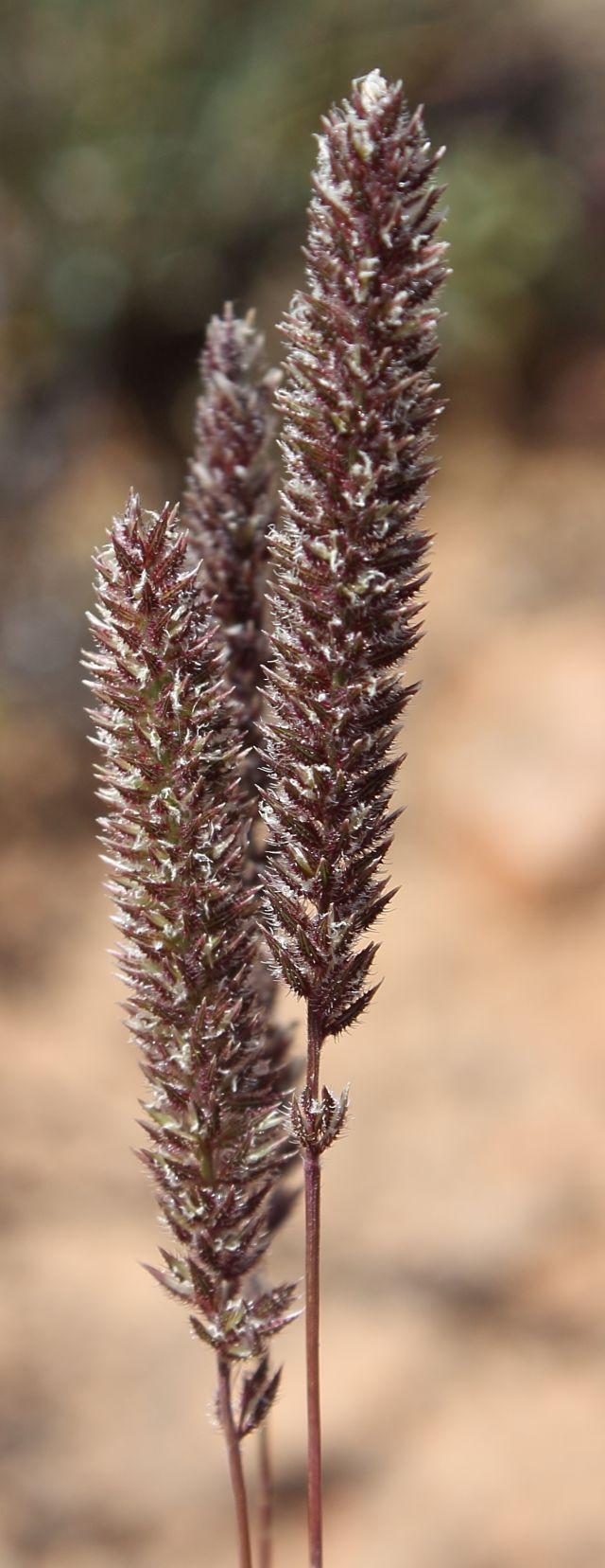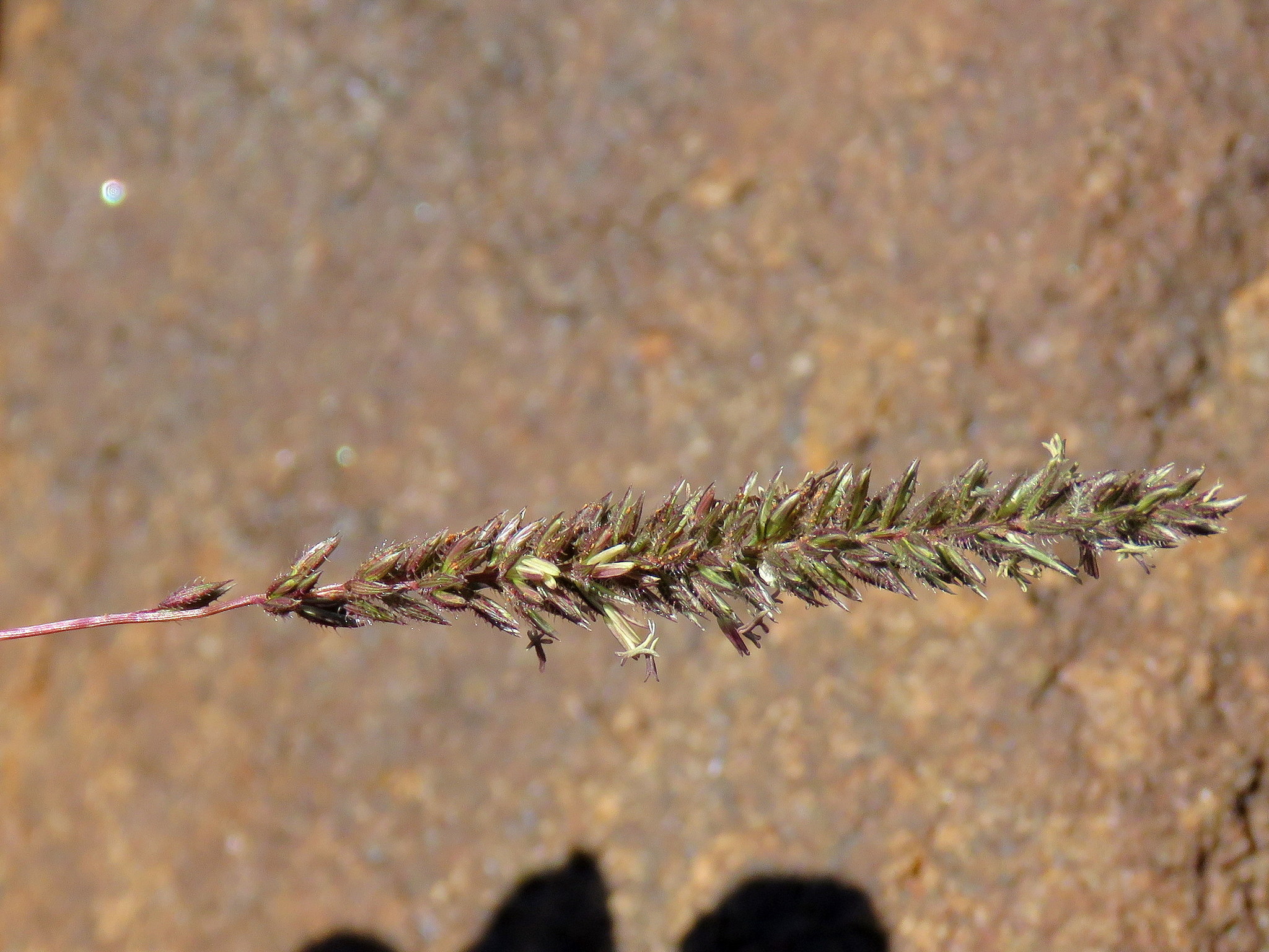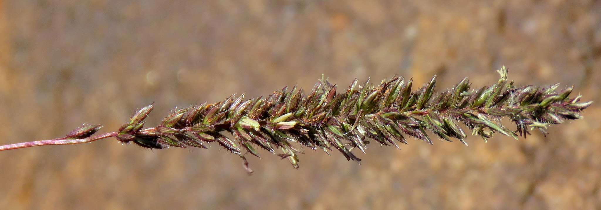 Perennial; up to 0.65 m high; rhizomatous; stoloniferous. Leaf blades up to 10-50(-80) x 3 mm. Flowers: inflorescence narrowly spike-like; spikelets clustered on peduncles that are much shorter than spikelets; lowest in each cluster 3.5-4.8 mm long; glume spines curved; not hooked at apex; anthers 1.8-2.5 mm long. From: Retief, E; Meyer, NL. 2017. Poaceae. In: E Retief & NL Meyer (eds), Plants of the Free State: Inventory and identification guide. Strelitzia 38: 987-1107. South African National Biodiversity Institute, Pretoria. [CC BY]