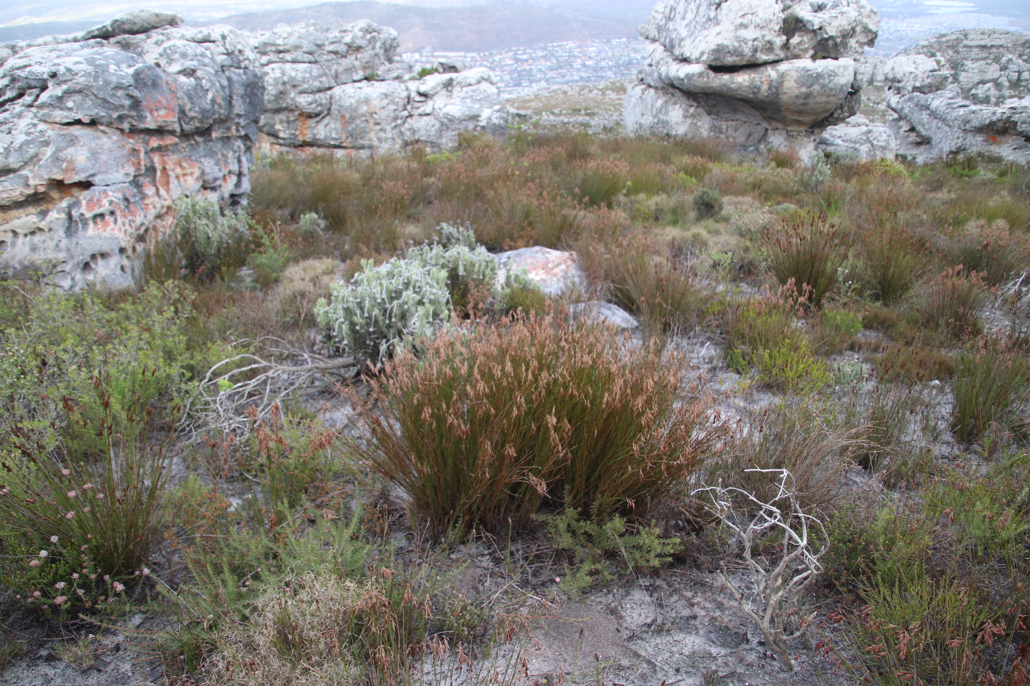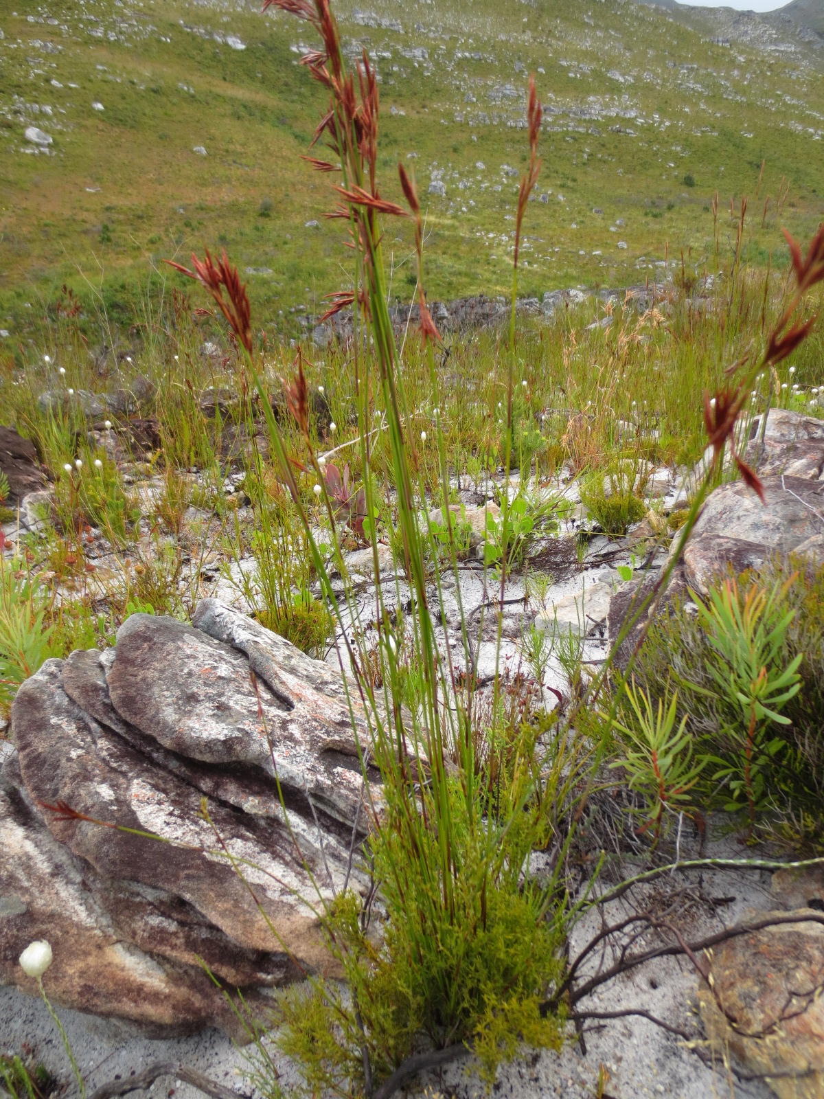 General notes: Fynbos. Stony. Well-drained. Sandy/gravel. Shale/TMS mix. Sun. S aspect. Gentle slope. Biotic effect: undisturbed. Culm branches fertile. Short rhizome. Fairly common.