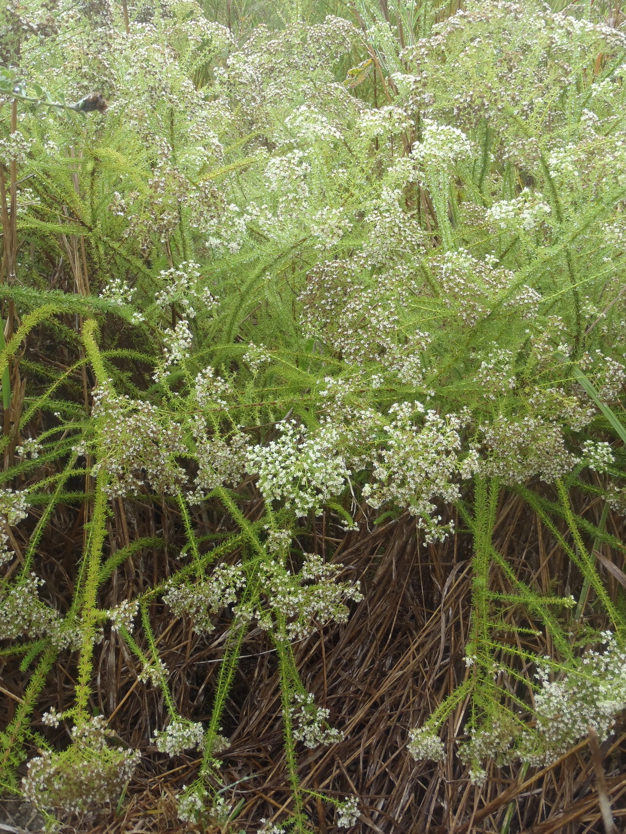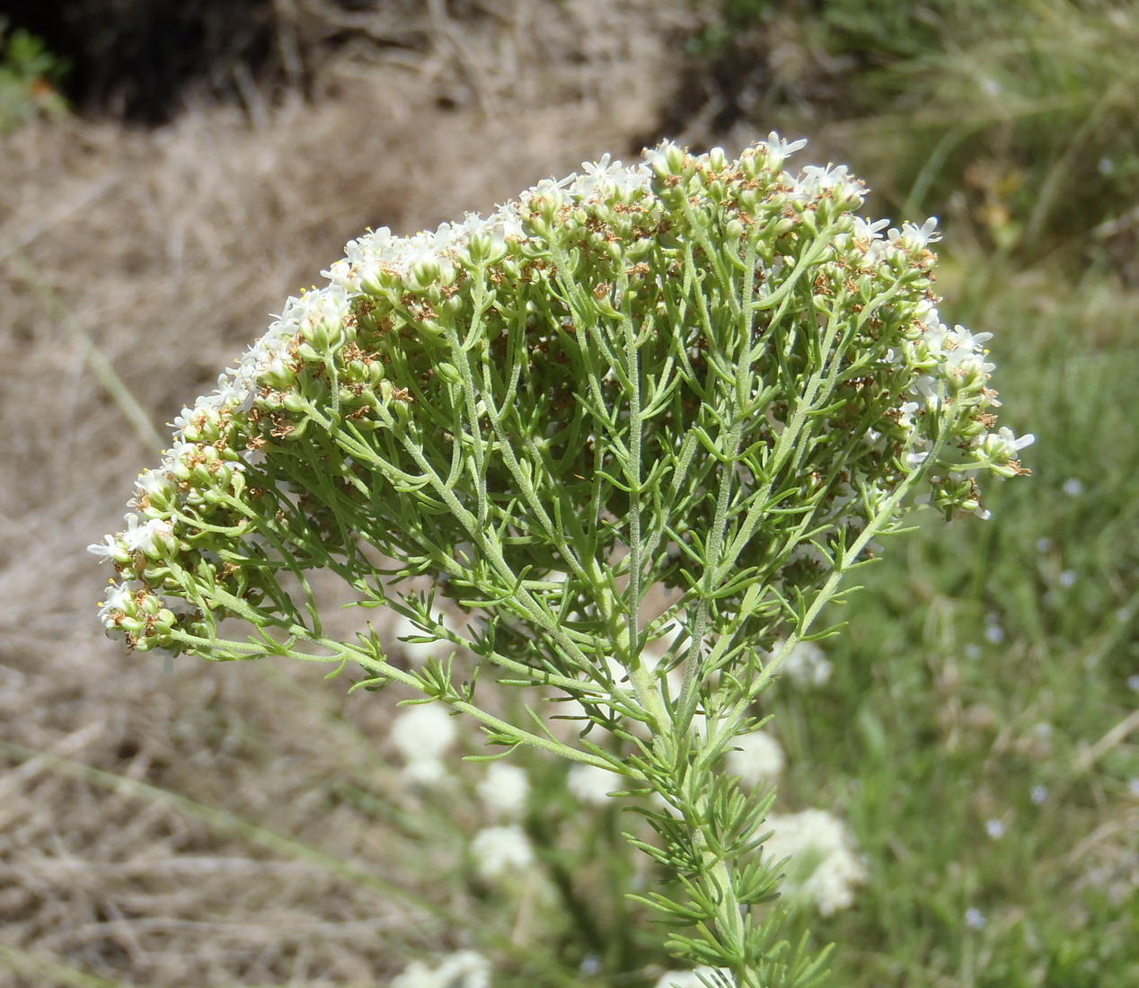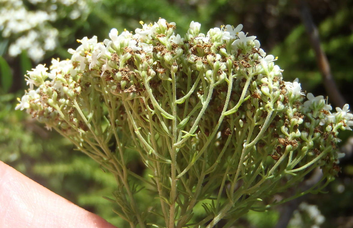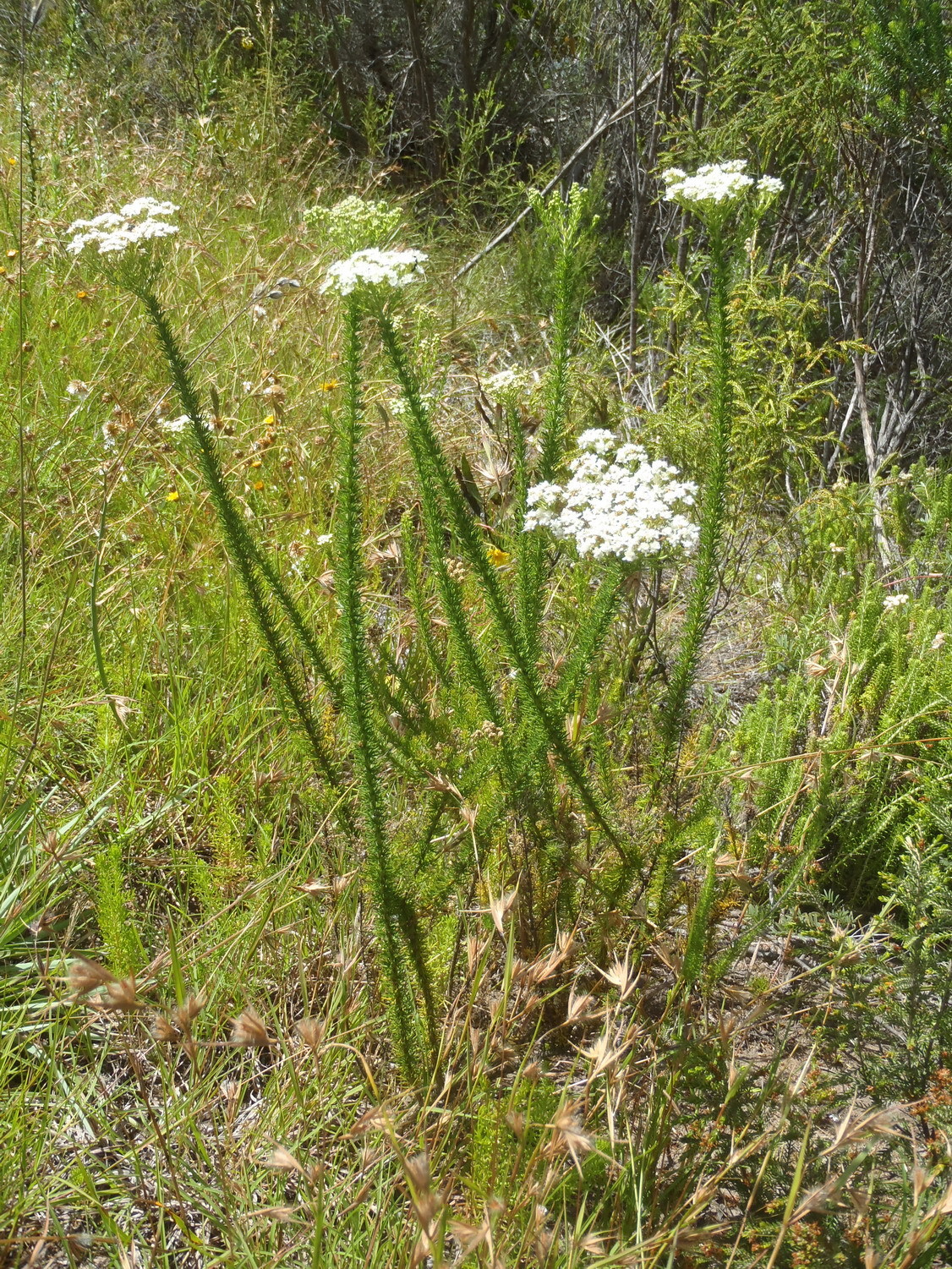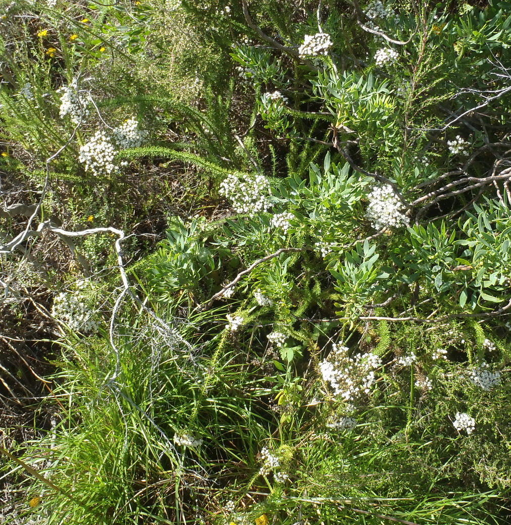 Shrublet 0.3-1 m tall, branches stout (to c. 5 mm diam.), rigid, often rodlike, ascending to erect, pubescent, hairs up to 0.2(-0.4) mm long, retrorse, closely leafy. Leaves alternate, fascicled, primary leaves 5-12 x 0.5-1 mm (but often appear narrower because of revolute margins), ratio length: breadth c. 10-24: 1, linear, apex subacute, base not narrowed, margins entire, somewhat thickened, often revolute when dry, midrib raised below, glandular-punctate, hairs up to 0.1-0.15 mm long mainly on margins and lower surface (hairs sometimes sparse or wanting on secondary leaves). Inflorescence a crowded leafy terminal corymb up to c. 80 mm in diam. Bract adnate to pedicel and calyx tube, lowermost 1.7-2.2 x 0.4-0.7 mm, blade oblong - obtuse, deeply concave, embracing calyx, strongly keeled, margins narrow,) pale, membranous, keel with a few minute hairs mainly on median line, minute hairs (c. 0.1 mm) on margins. Pedicel (lowermost) 0.25-0.6(-1) mm long. Calyx 1.2-1.8 mm long, campanulate, subequally 5-lobed, lobes c. 0.3-0.4 mm long, subacute to obtuse, minute globular glands scattered all over, usually hairs to 0.1 mm long as well, mainly on keels. Corolla tube 1.1-1.8 mm long (female flowers not uncommon, then corolla much smaller), broadly funnel-shaped, limb 2.6-3.8 mm across lateral lobes, posticous lobes 0.9-1.4 x 0.6-0.8 mm, anticous lobe 1.5-2.2 x 0.8-1 mm, all lobes oblong -elliptic, white. Stamens: posticous filaments 1.2-1.7 mm long, anticous filaments 1.5-2.2 mm, all anthers well exerted. Stigma and style 1.2-2.7 mm long, style glabrous. Ovary c. 0.3 x 0.3 mm. Cocci 1.2-1.4 x 0.7-0.8 mm, dark brown, rugulose. Flowers can possibly be found in any month. From: Hilliard, OM. 1999. The Tribe Selagineae (Scrophulariaceae). Royal Botanic Garden, Edinburgh. [All rights reserved]