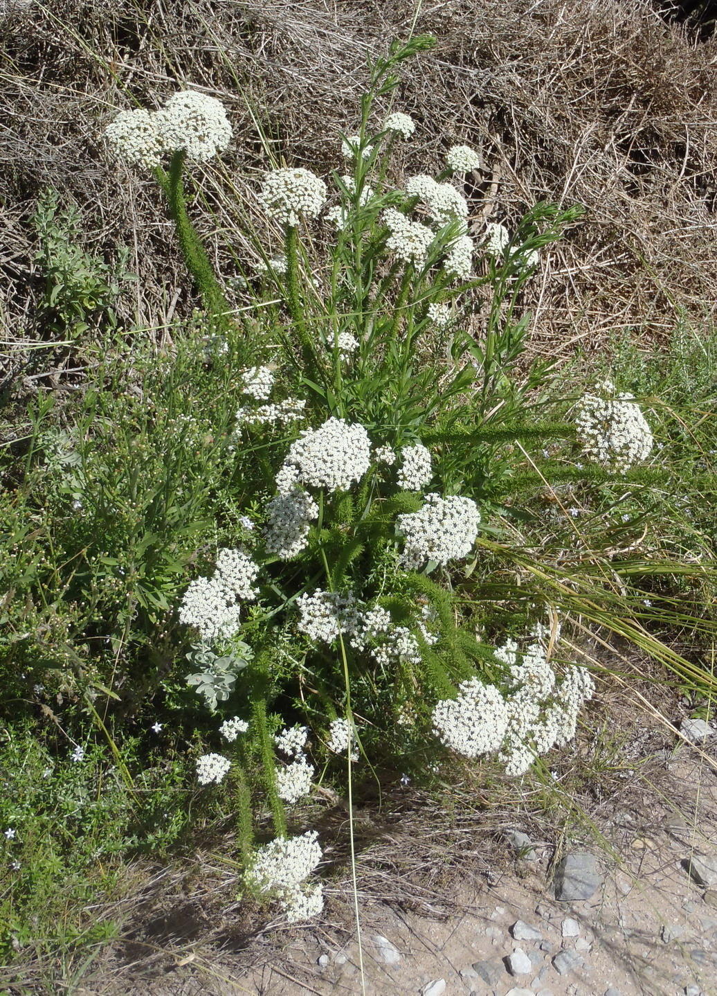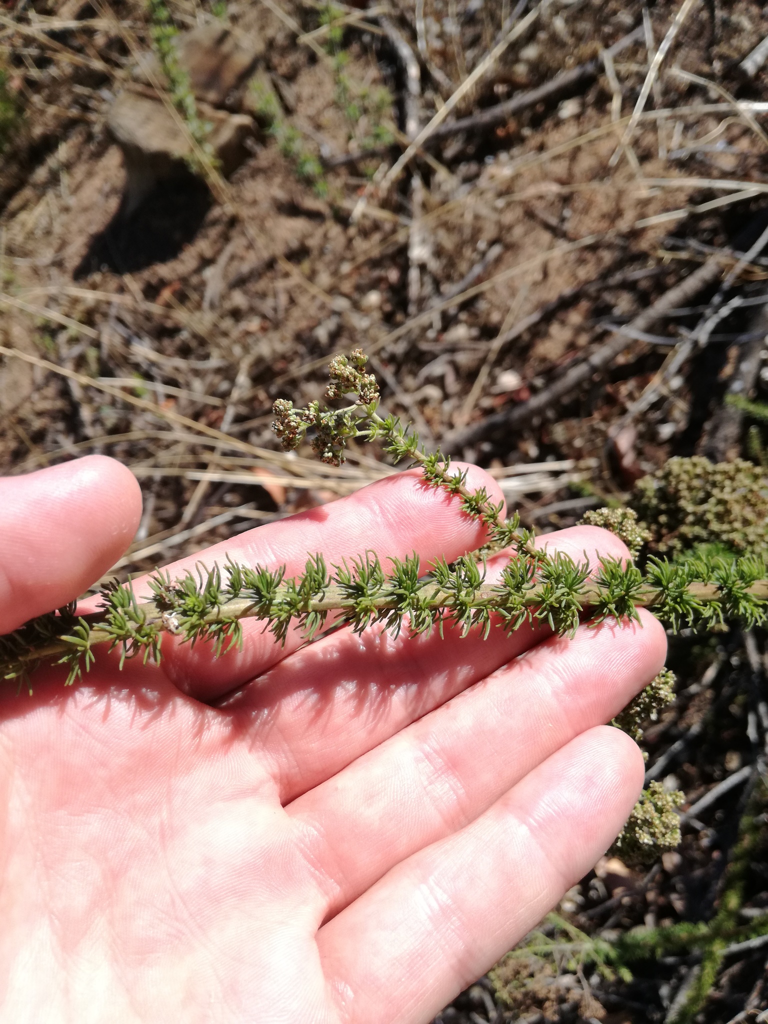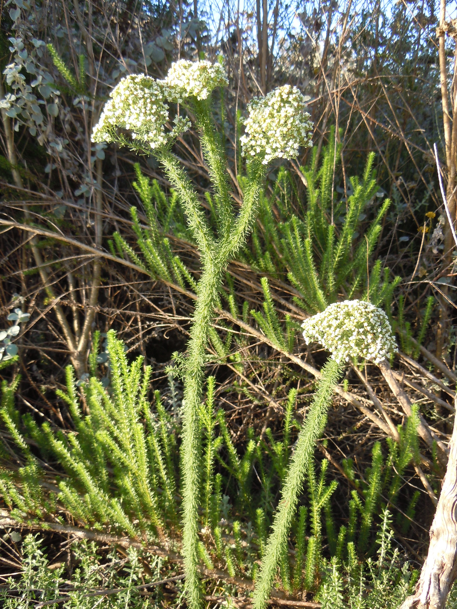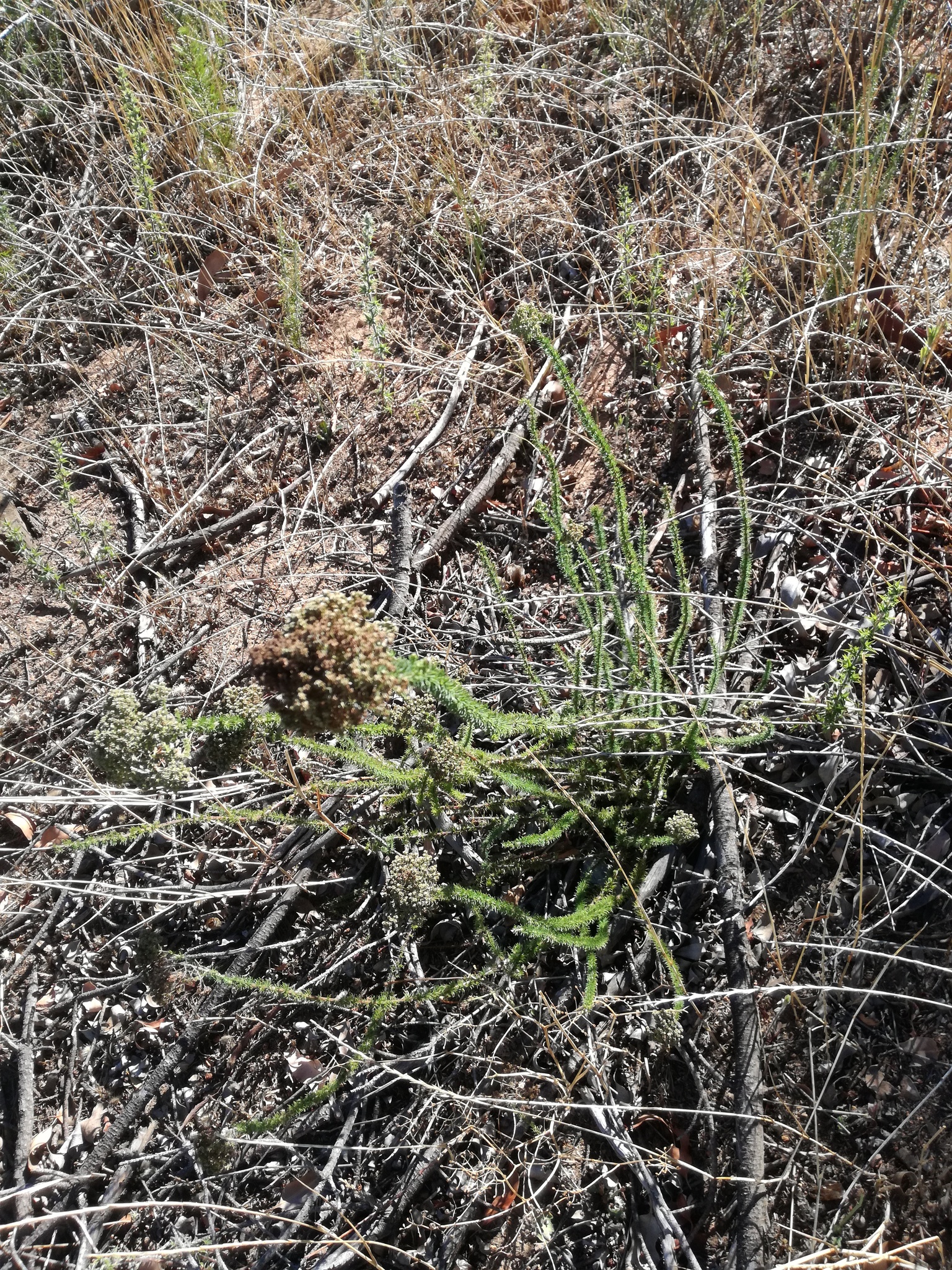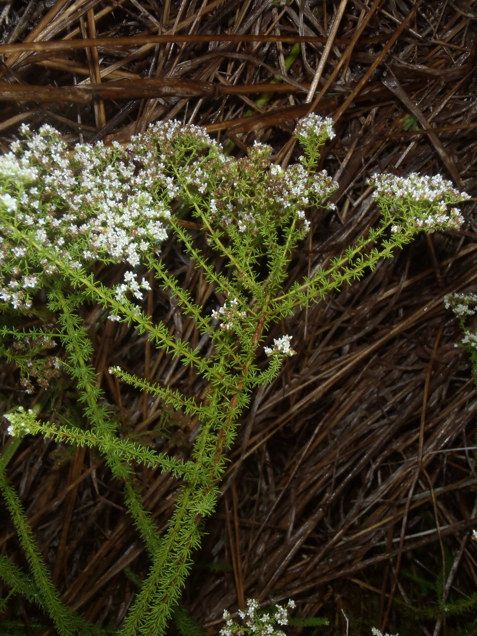 Shrublet 0.3-1 m tall, branches stout (to c. 5 mm diam.), rigid, often rodlike, ascending to erect, pubescent, hairs up to 0.2(-0.4) mm long, retrorse, closely leafy. Leaves alternate, fascicled, primary leaves 5-12 x 0.5-1 mm (but often appear narrower because of revolute margins), ratio length: breadth c. 10-24: 1, linear, apex subacute, base not narrowed, margins entire, somewhat thickened, often revolute when dry, midrib raised below, glandular-punctate, hairs up to 0.1-0.15 mm long mainly on margins and lower surface (hairs sometimes sparse or wanting on secondary leaves). Inflorescence a crowded leafy terminal corymb up to c. 80 mm in diam. Bract adnate to pedicel and calyx tube, lowermost 1.7-2.2 x 0.4-0.7 mm, blade oblong - obtuse, deeply concave, embracing calyx, strongly keeled, margins narrow,) pale, membranous, keel with a few minute hairs mainly on median line, minute hairs (c. 0.1 mm) on margins. Pedicel (lowermost) 0.25-0.6(-1) mm long. Calyx 1.2-1.8 mm long, campanulate, subequally 5-lobed, lobes c. 0.3-0.4 mm long, subacute to obtuse, minute globular glands scattered all over, usually hairs to 0.1 mm long as well, mainly on keels. Corolla tube 1.1-1.8 mm long (female flowers not uncommon, then corolla much smaller), broadly funnel-shaped, limb 2.6-3.8 mm across lateral lobes, posticous lobes 0.9-1.4 x 0.6-0.8 mm, anticous lobe 1.5-2.2 x 0.8-1 mm, all lobes oblong -elliptic, white. Stamens: posticous filaments 1.2-1.7 mm long, anticous filaments 1.5-2.2 mm, all anthers well exerted. Stigma and style 1.2-2.7 mm long, style glabrous. Ovary c. 0.3 x 0.3 mm. Cocci 1.2-1.4 x 0.7-0.8 mm, dark brown, rugulose. Flowers can possibly be found in any month. From: Hilliard, OM. 1999. The Tribe Selagineae (Scrophulariaceae). Royal Botanic Garden, Edinburgh. [All rights reserved]