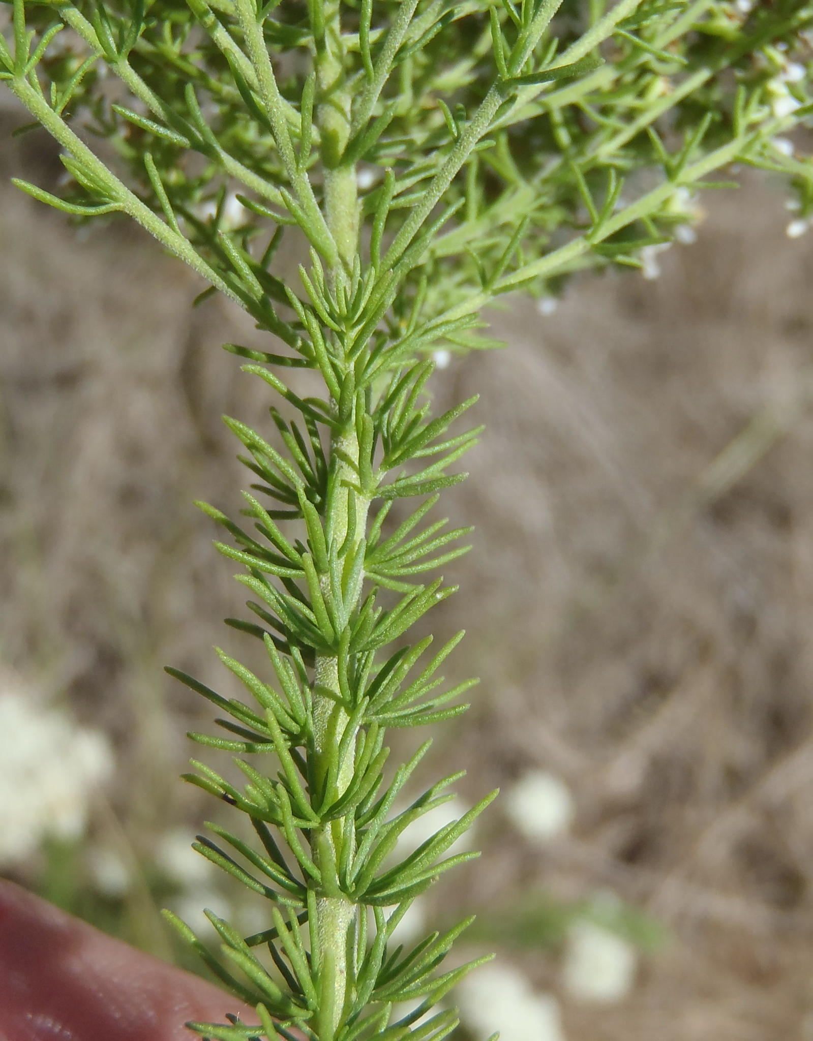Dwarf shrub or shrub, up to 1 m high; branches thick, stiff, ascending to erect, retrorse-pubescent. Leaves: main ones up to 12 x 1 mm, linear, subacute, base not narrowed, margins entire, often revolute when dry, puberulous mainly on margins and lower side. Flowers crowded in a terminal, leafy corymb, up to ± 80 mm in diam. Bracts: basal ones 1.7-2.2 x 0.4-0.7 mm long, narrow, oblong-elliptic, obtuse, margins narrow, minute hairs mainly on midline and margins. Calyx: lobes with scattered, tiny, globular glands, puberulous mainly on keels. Corolla white. Flowering time all year. From: Smithies, SJ; Bredenkamp, CL; Magwaza, ZL. 2019. Scrophulariaceae s.l.?. In: CL Bredenkamp (ed.), A Flora of the Eastern Cape Province. Strelitzia 41(2): 1475-1538. South African National Biodiversity Institute, Pretoria. [CC BY]