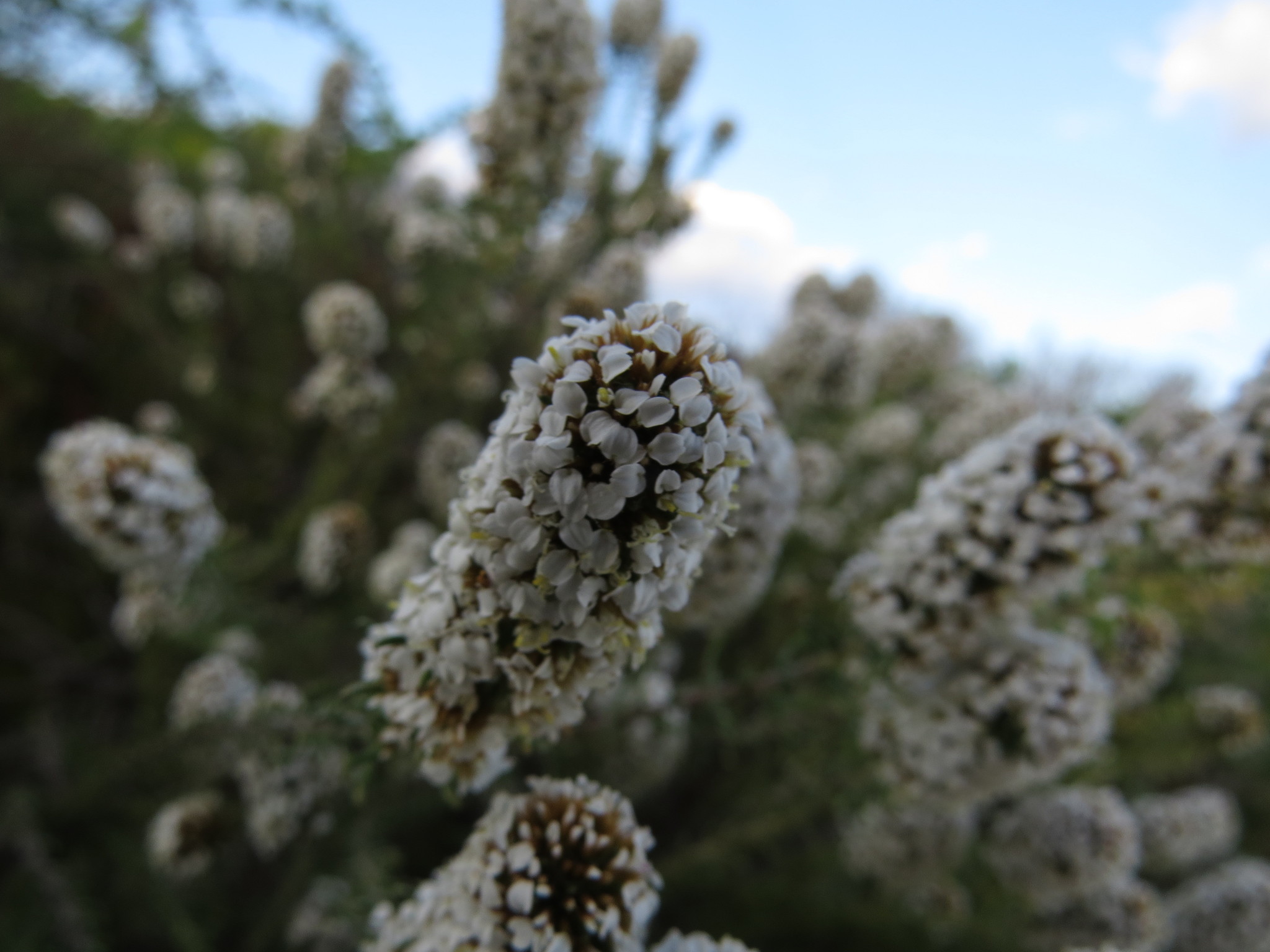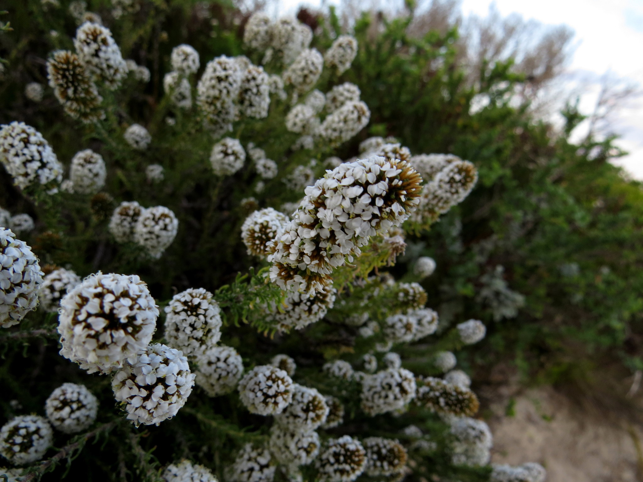 General notes: Alt.160 m. Fynbos on grey sand. White flowers in clusters on end of a long stem. Smells like honey. Ericoid leaves curl around stems.
