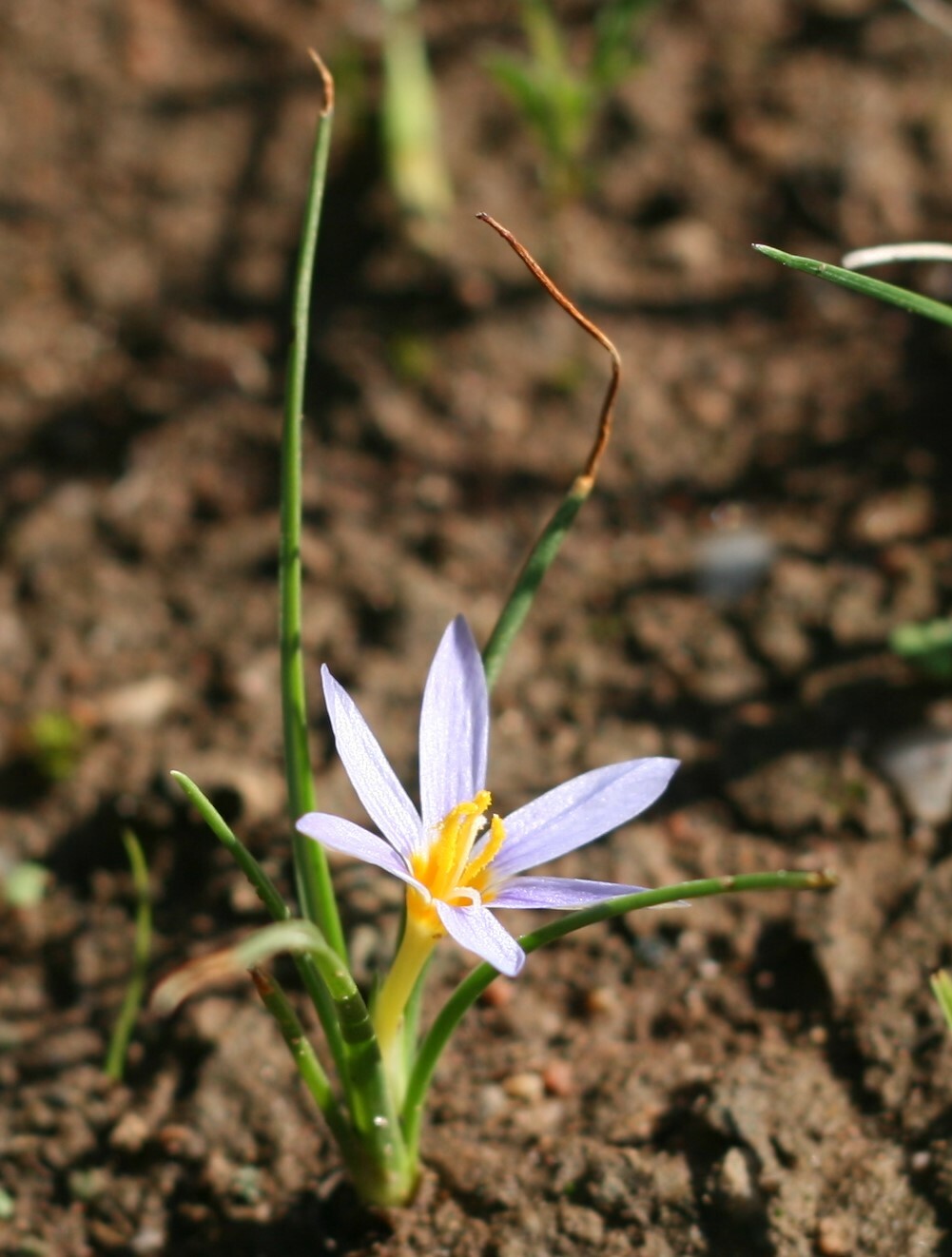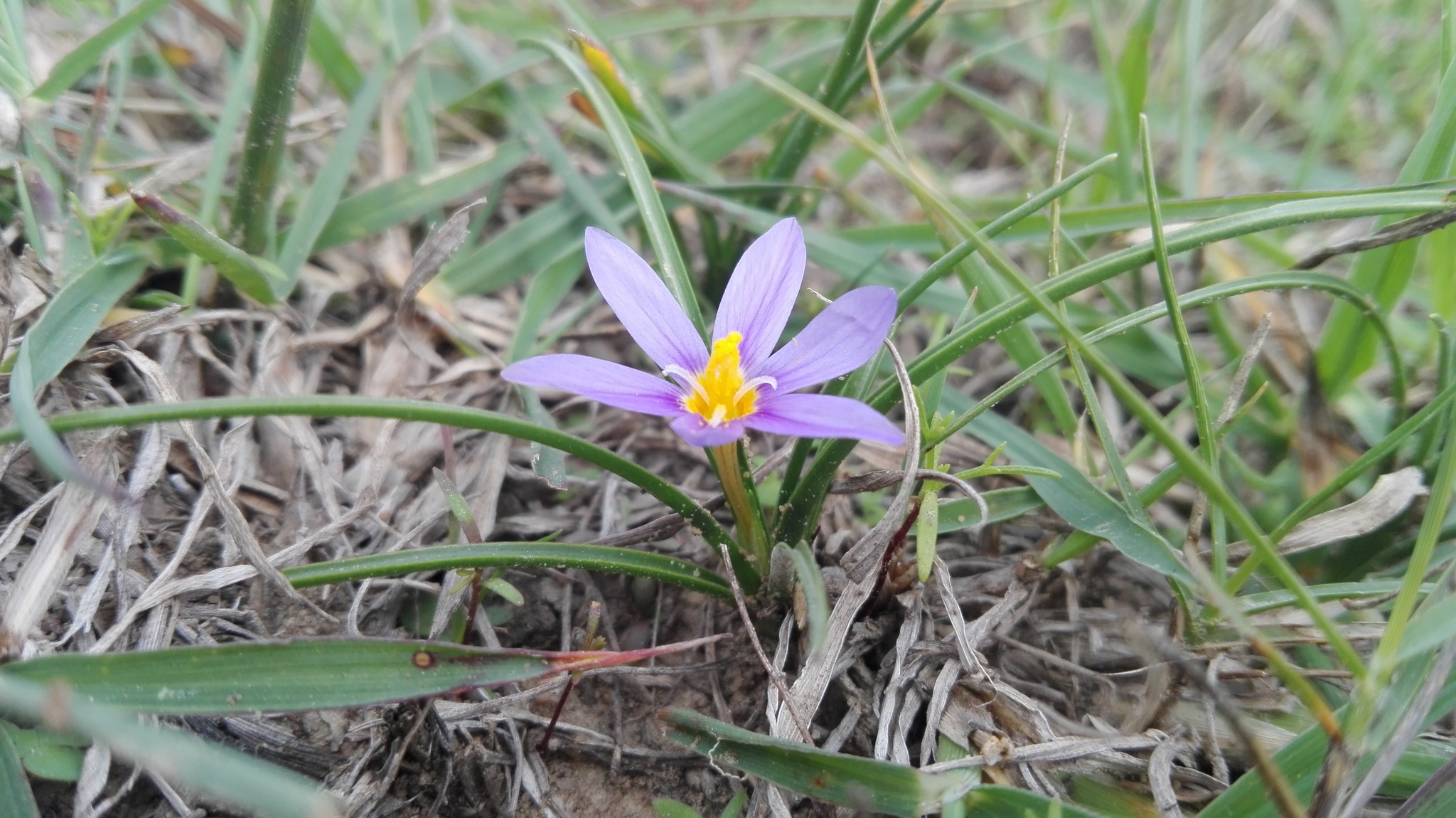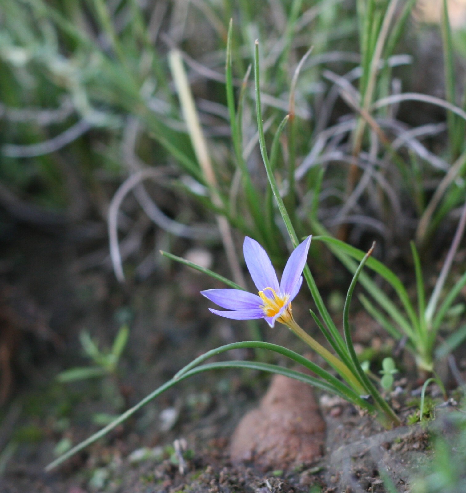 Perennial herb, geophyte, 0.03-0.08 m; corm slightly asymmetric, obovate, tunics smooth, brown; stem very short. Leaves 6-9, conduplicate, 30-100 x 0.5-1.0 mm. Bracts 12-25 mm long, usually membranous with brown stripes. Flower 1, violet with yellow throat, 30-50 mm long; perianth tube 25-45 mm long; tepals oblanceolate, 5-8 x 2 mm long. Style as long as perianth tube; stigma 1 mm long, spathulate. Flowering time Apr.-June. Capsule 7-8 mm long, brown-speckled. From: Bredenkamp, CL; Magwaza, ZL. 2019. Iridaceae. In: CL Bredenkamp (ed.), A Flora of the Eastern Cape Province. Strelitzia 41(3): 1821-1882. South African National Biodiversity Institute, Pretoria. [CC BY]