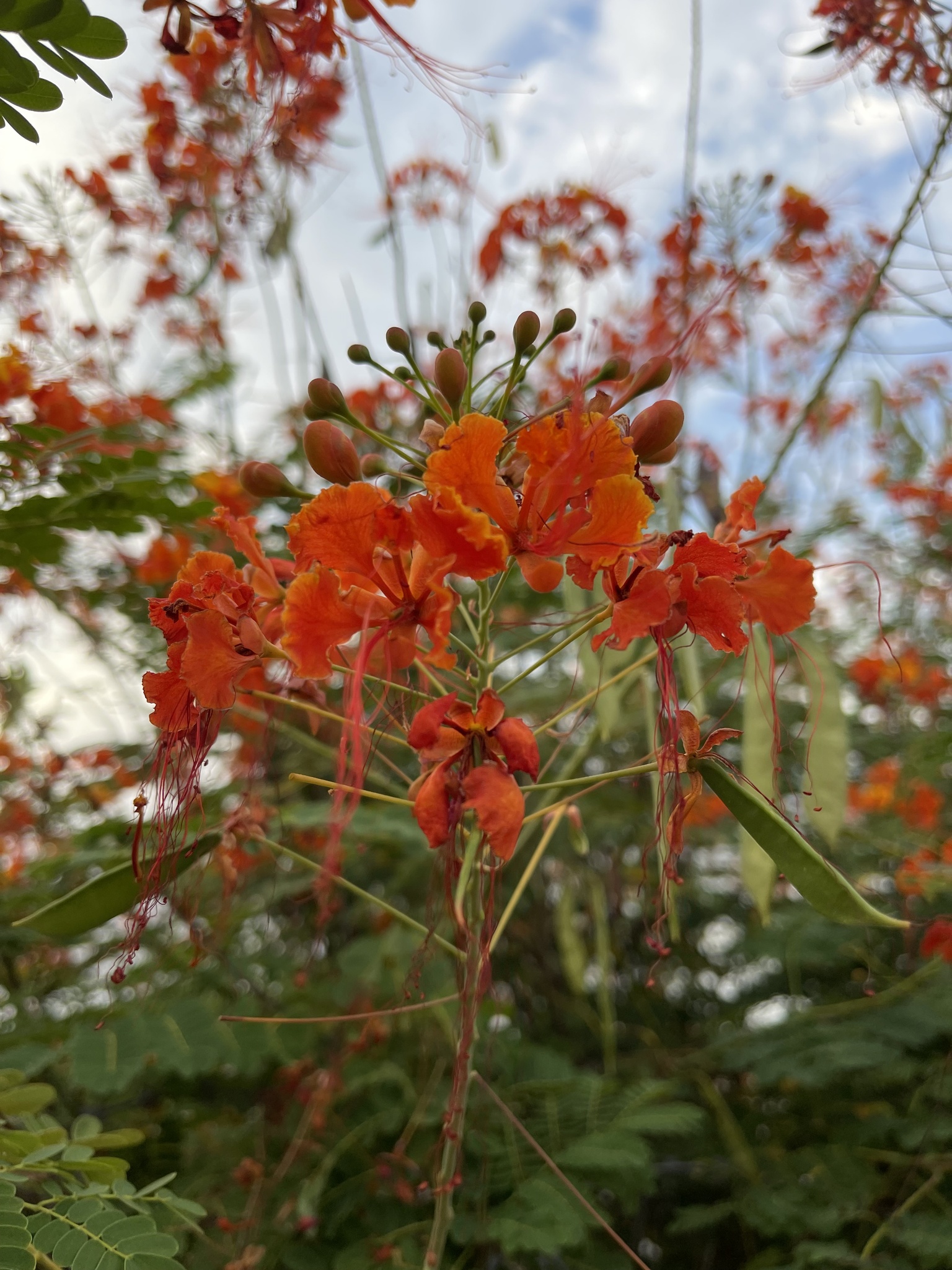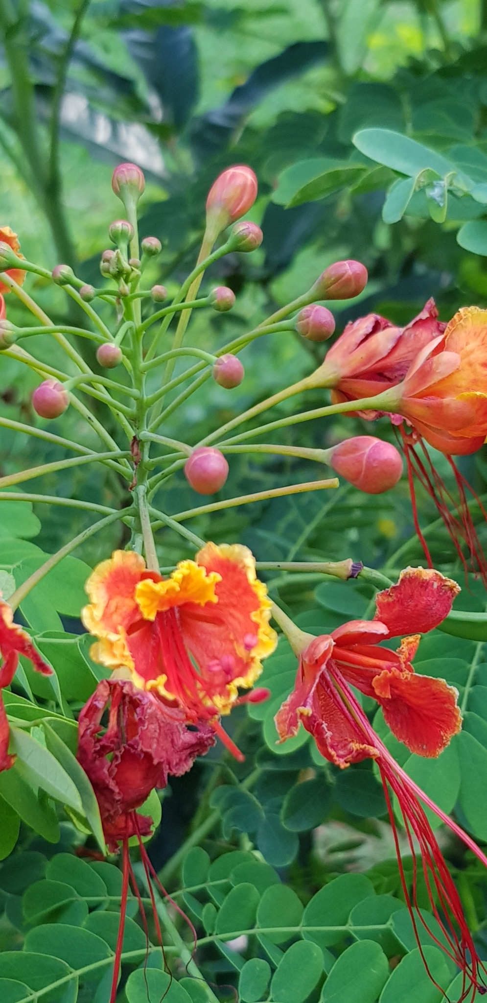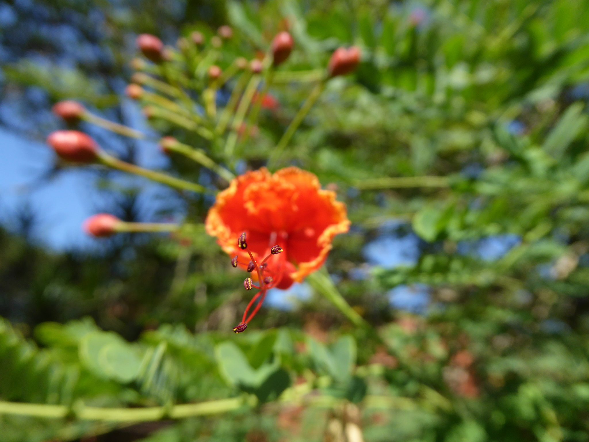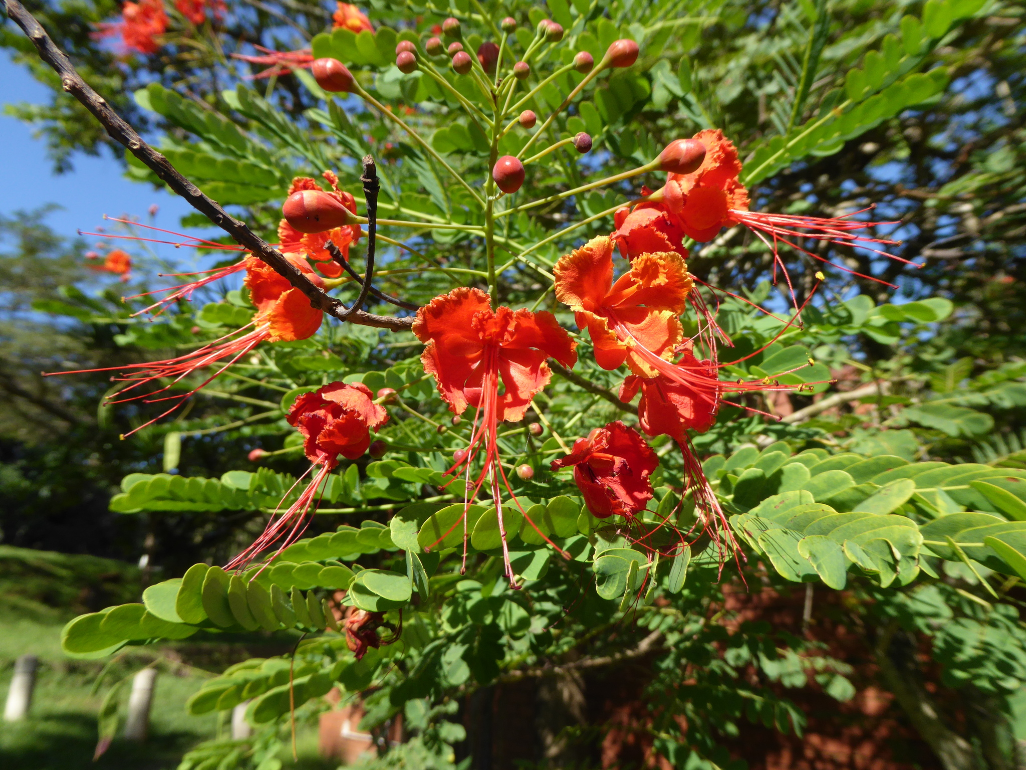 Shrub up to 5 m high, unarmed or sometimes with short spines in pairs at the nodes, rarely scattered, quite glabrous except for the stamen-filaments. Leaves 6-30 cm long, unarmed or occasionally with paired prickles or spinulose stipels at the insertions of the pinnae and leaflets; pinnae 3-10 pairs; rhachillae 1.8-8.5 cm long; leaflets 5-12 pairs per pinna, (5)8-18(28) mm long, 4-12 mm wide, oblong to oblong-elliptic, rounded to emarginate apically. Racemes terminal or terminal and axillary, up to 35 cm long; bracts ± linear-lanceolate, up to 7.5 mm long, rapidly deciduous and shed when the buds are young. Flowers scarlet, red and yellow, orange-red or yellow (var. flava L. H. Bailey); pedicels 2-7.5 cm long in flower, sometimes longer in fruit. Sepals 7-14 mm long, the lower one 14-17 mm long and hooded apically. Petals 15-25 mm long, long-clawed, with a lamina ±10-20 mm wide, distal margin erose-undulate; upper petal smaller. Stamens scarlet, long-exserted; filaments 4-6.5 cm long, pubescent basally, glabrous above; anthers glabrous. Ovary glabrous. Pods asymmetrically oblanceolate-oblong, 6-12 cm long, 1.4-2.2 cm wide, brown or purplish-brown, compressed, unarmed, dehiscent. Seeds brown, ±9-10 x 7-8 mm, obovate, subtruncate apically, somewhat compressed. From: Ross, JH. 1977. Parkinsonia to Swartzia. Fl. S. Africa 16(2): 109-138. Botanical Research Institute, Pretoria. [CC BY]
