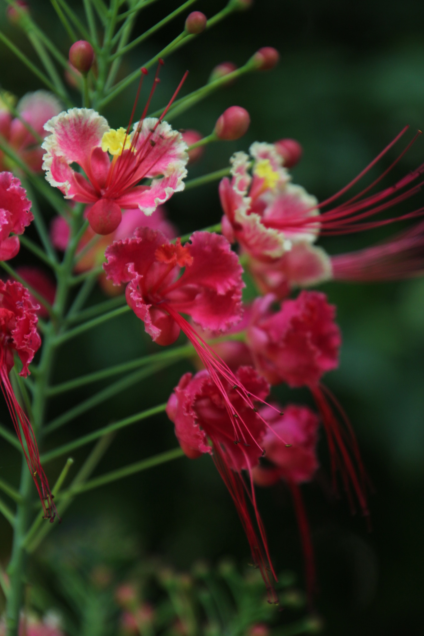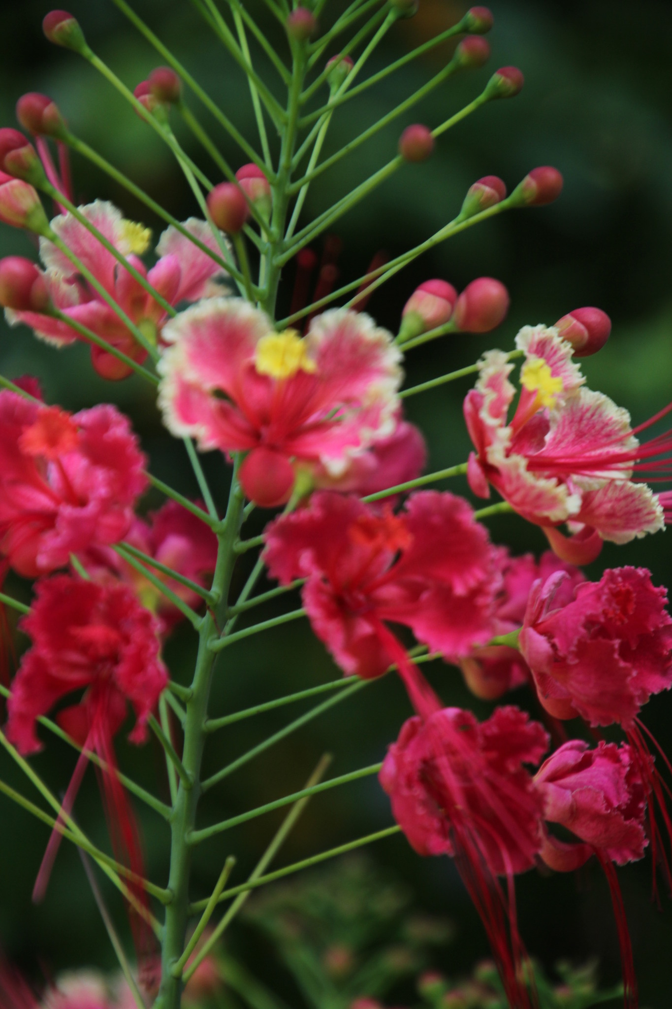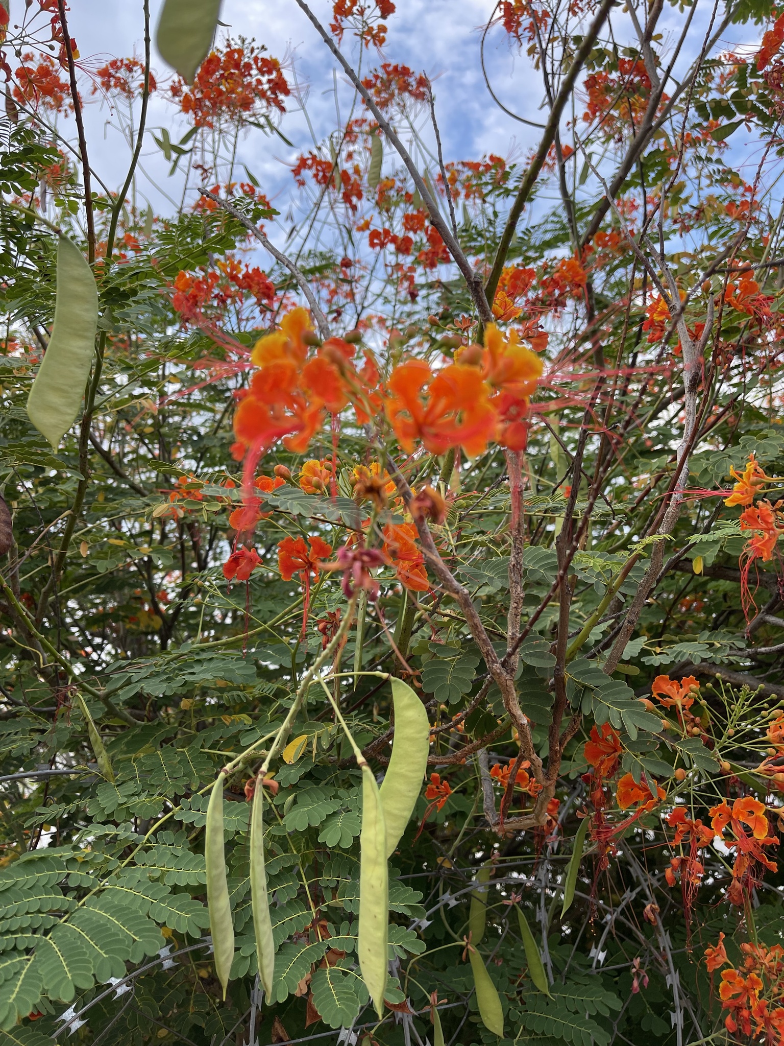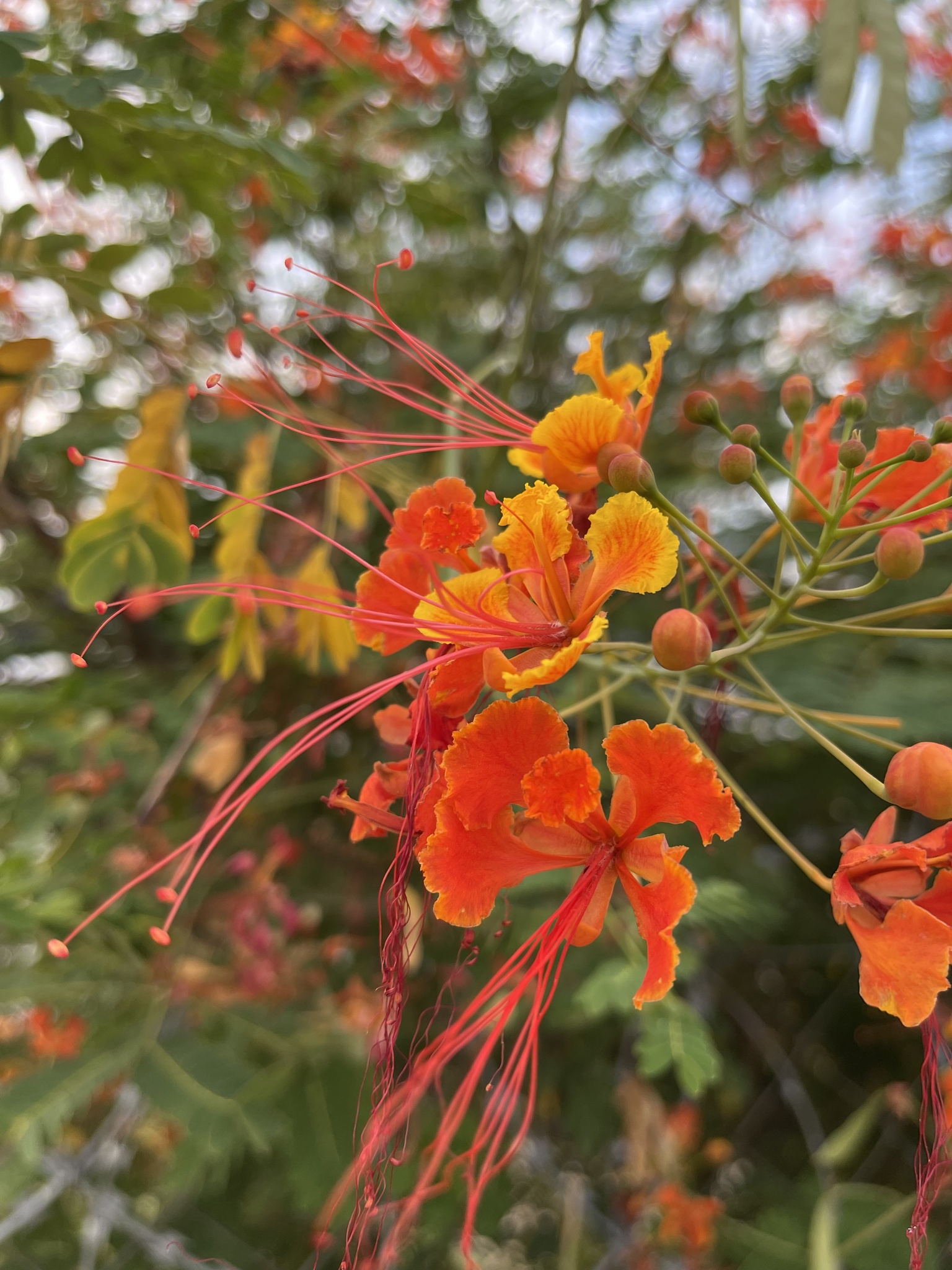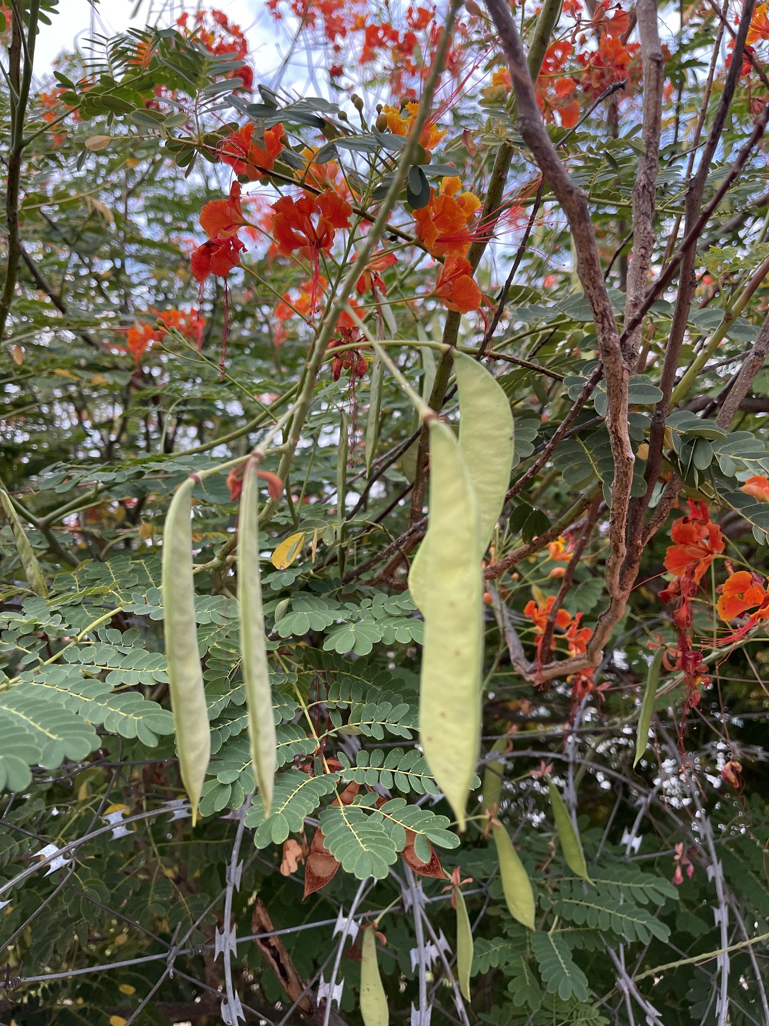 Shrub up to 5 m high, unarmed or sometimes with short spines in pairs at the nodes, rarely scattered, quite glabrous except for the stamen-filaments. Leaves 6-30 cm long, unarmed or occasionally with paired prickles or spinulose stipels at the insertions of the pinnae and leaflets; pinnae 3-10 pairs; rhachillae 1.8-8.5 cm long; leaflets 5-12 pairs per pinna, (5)8-18(28) mm long, 4-12 mm wide, oblong to oblong-elliptic, rounded to emarginate apically. Racemes terminal or terminal and axillary, up to 35 cm long; bracts ± linear-lanceolate, up to 7.5 mm long, rapidly deciduous and shed when the buds are young. Flowers scarlet, red and yellow, orange-red or yellow (var. flava L. H. Bailey); pedicels 2-7.5 cm long in flower, sometimes longer in fruit. Sepals 7-14 mm long, the lower one 14-17 mm long and hooded apically. Petals 15-25 mm long, long-clawed, with a lamina ±10-20 mm wide, distal margin erose-undulate; upper petal smaller. Stamens scarlet, long-exserted; filaments 4-6.5 cm long, pubescent basally, glabrous above; anthers glabrous. Ovary glabrous. Pods asymmetrically oblanceolate-oblong, 6-12 cm long, 1.4-2.2 cm wide, brown or purplish-brown, compressed, unarmed, dehiscent. Seeds brown, ±9-10 x 7-8 mm, obovate, subtruncate apically, somewhat compressed. From: Ross, JH. 1977. Parkinsonia to Swartzia. Fl. S. Africa 16(2): 109-138. Botanical Research Institute, Pretoria. [CC BY]